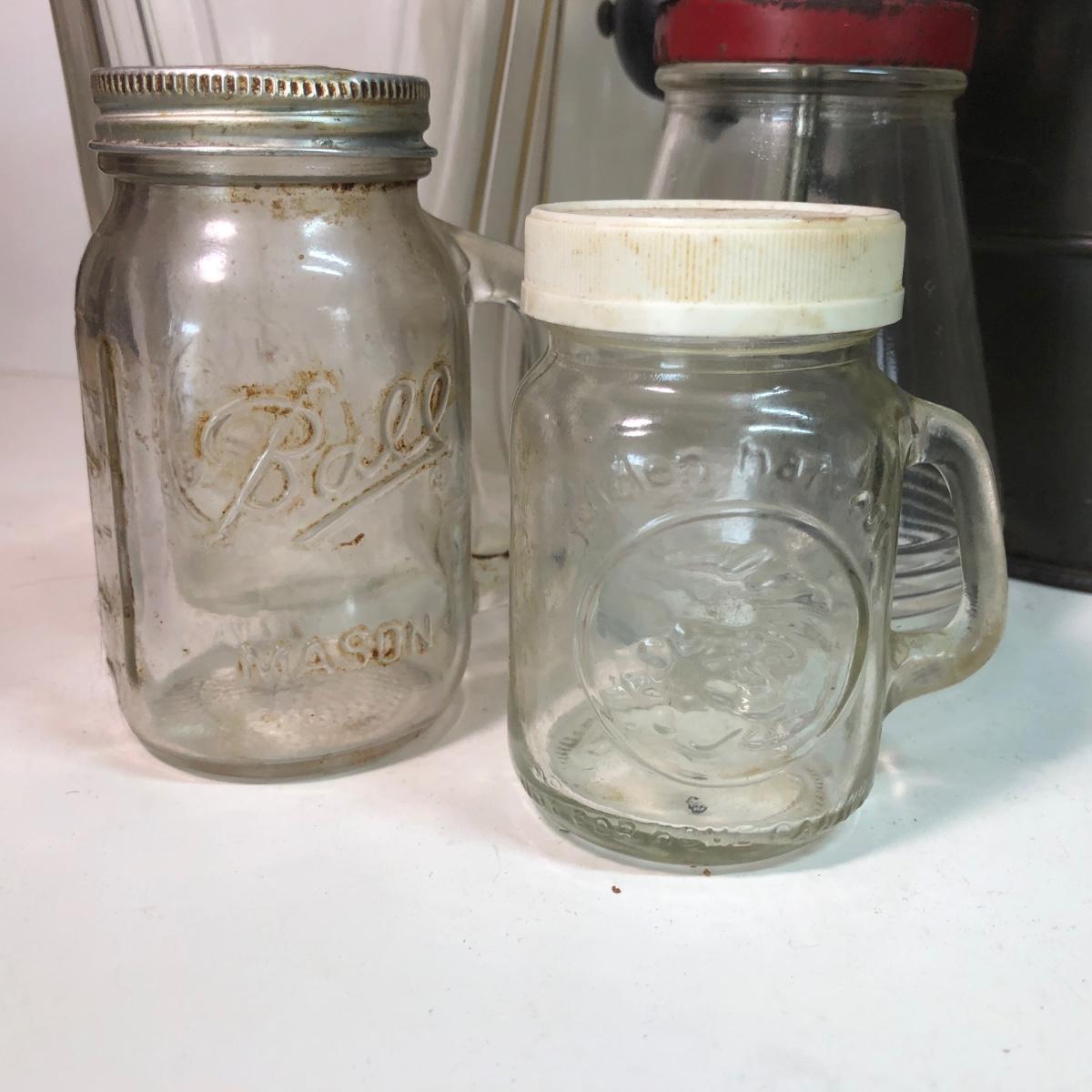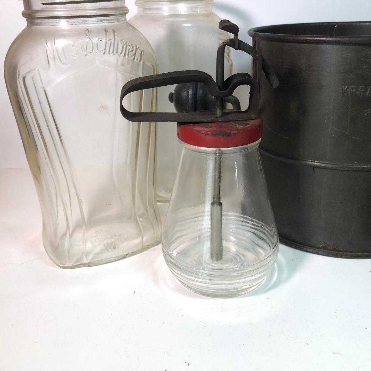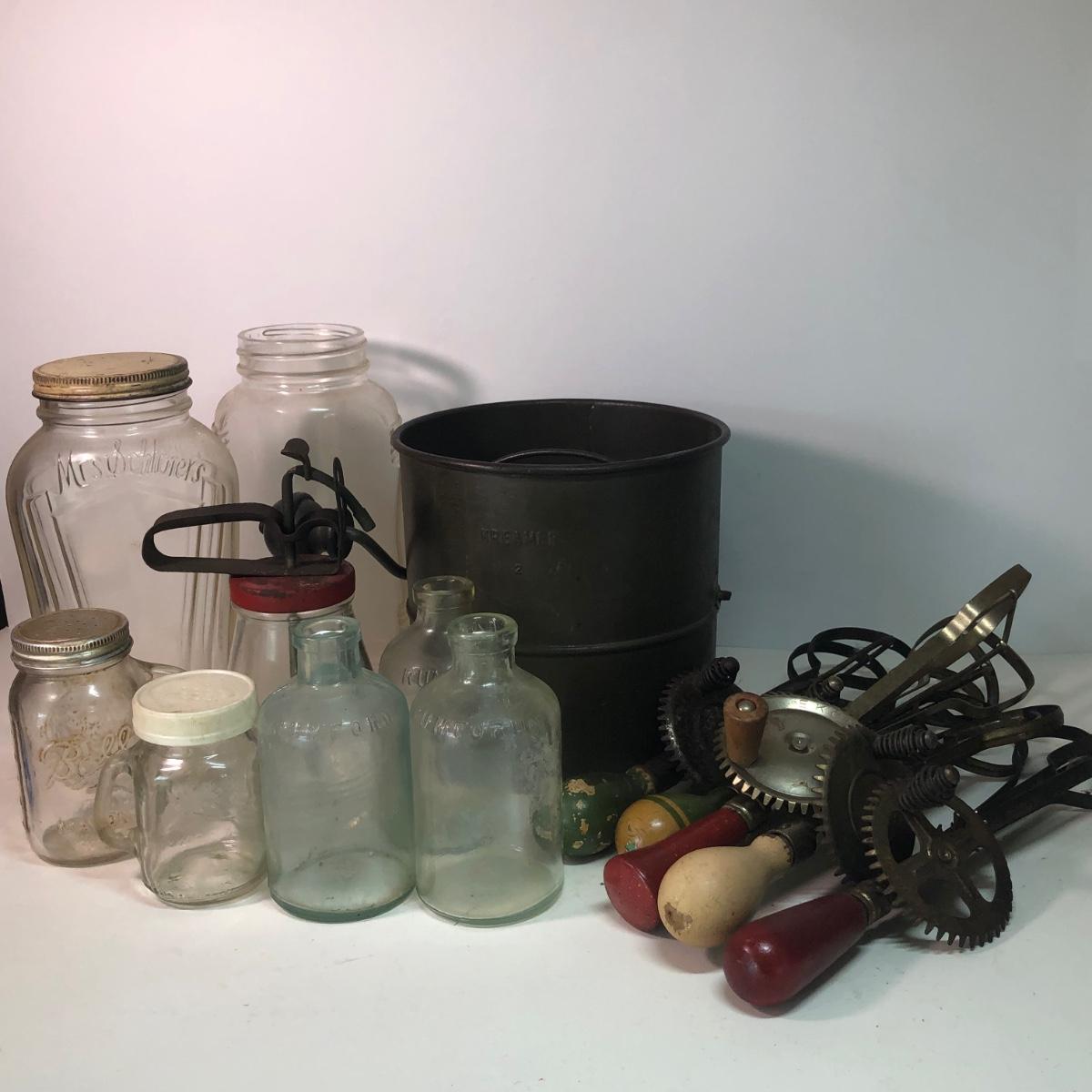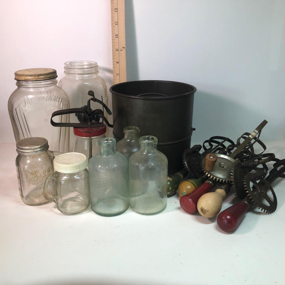 LOT 48M: Vintage Kitchen - Rumford Bottles, Hand Mixers, Kreamer Sifter & More