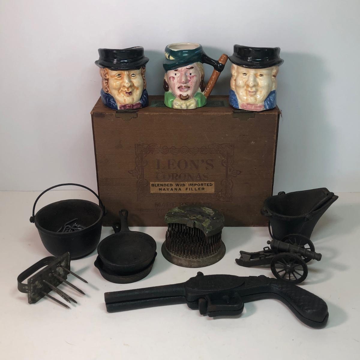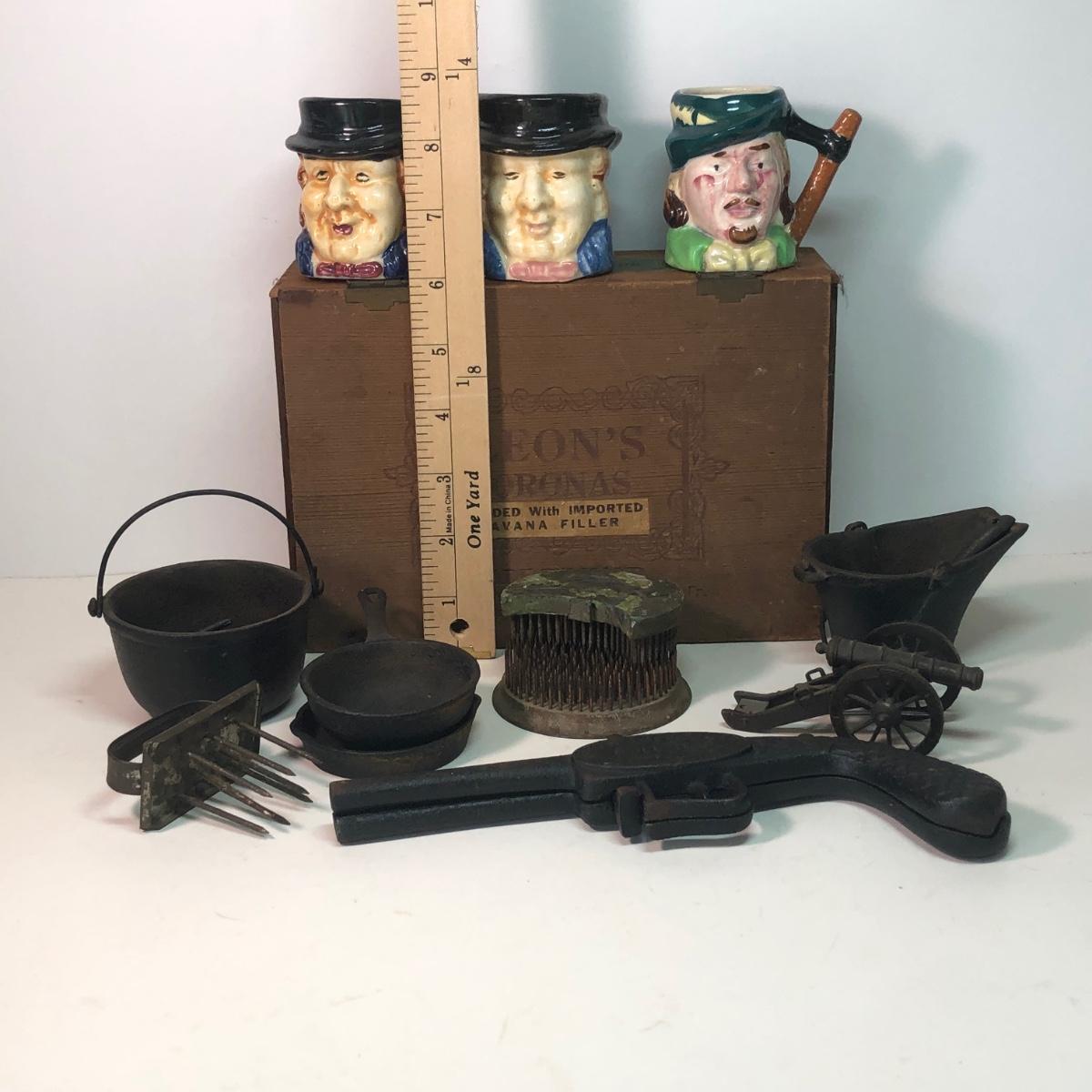 LOT 54M: Toby Mugs, Wooden Cigar Box, Cast Iron Miniatures & More