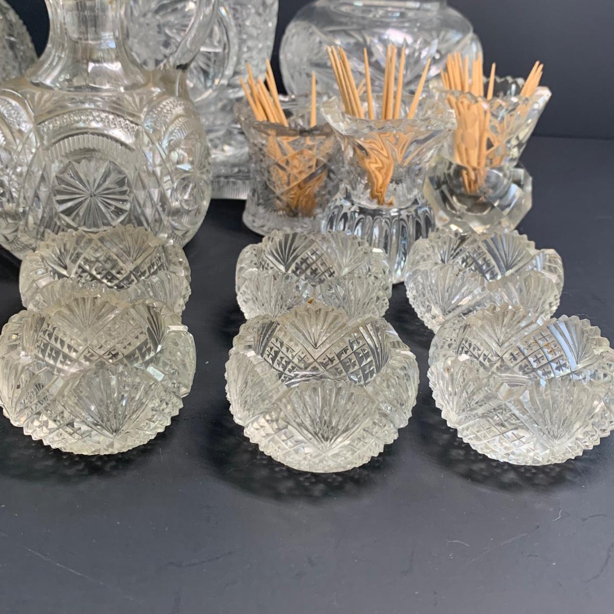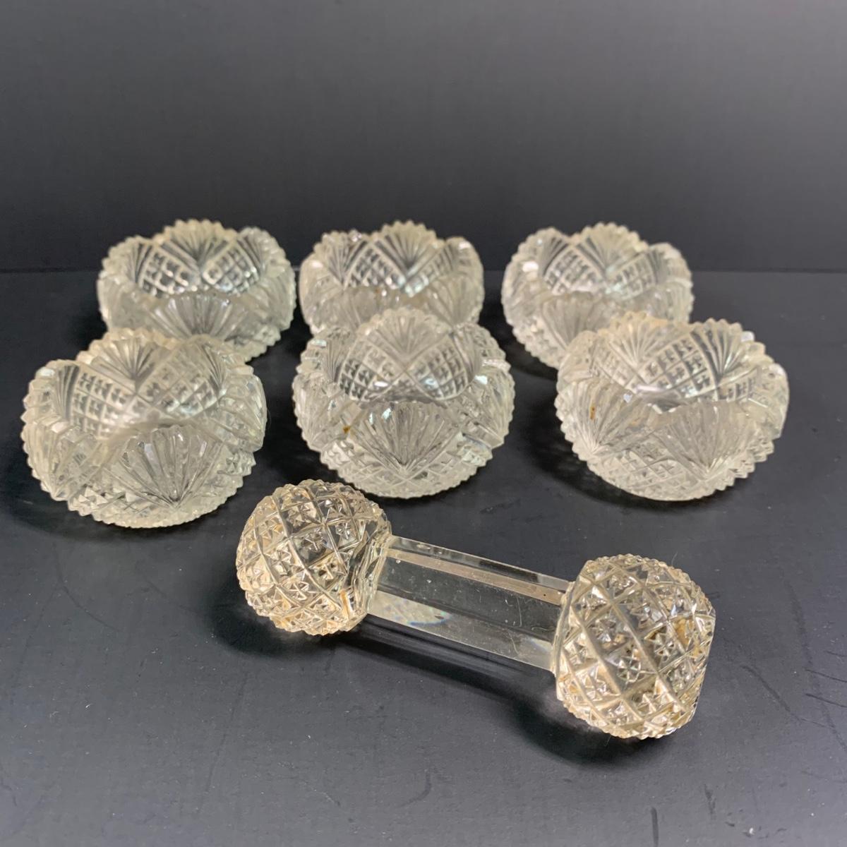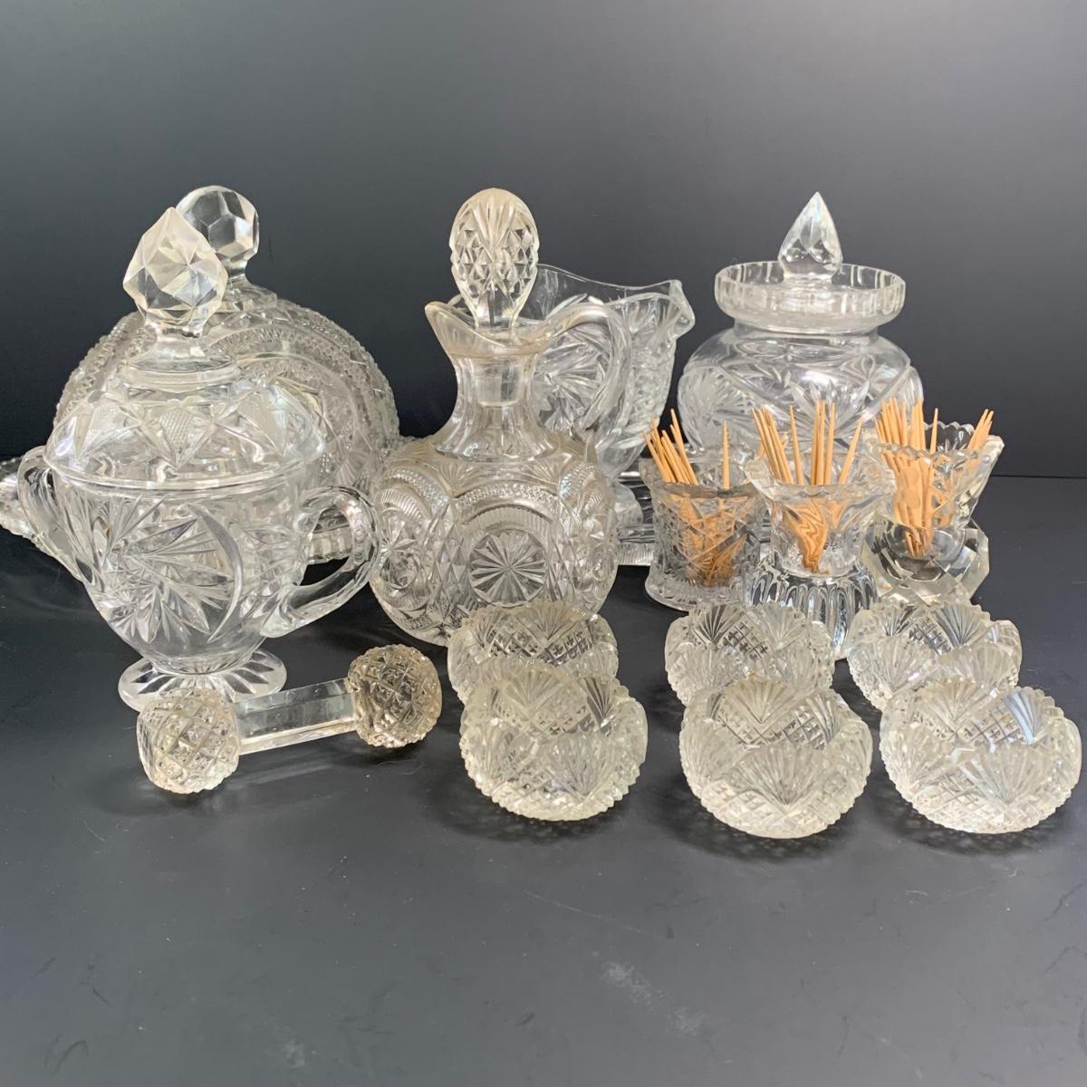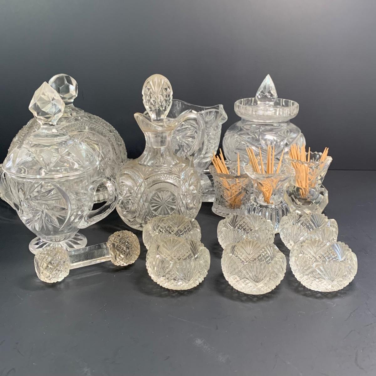 LOT 57R: Clear Glass Collection: Salt Dishes, Crystal Knife Rest, Toothpick Holders, Sugar Bowl/Creamer & More