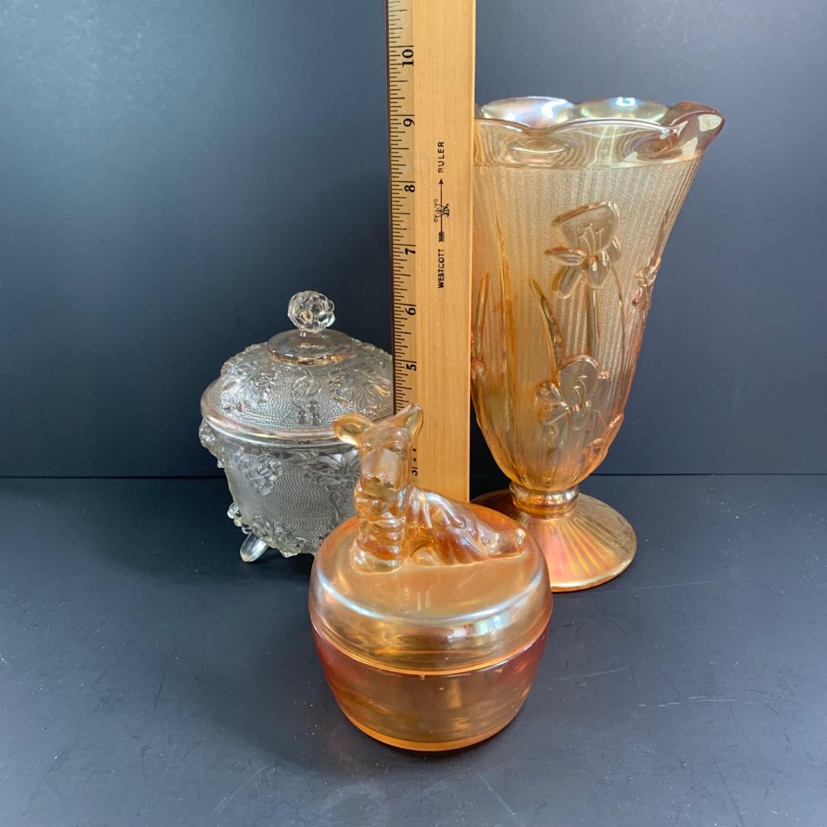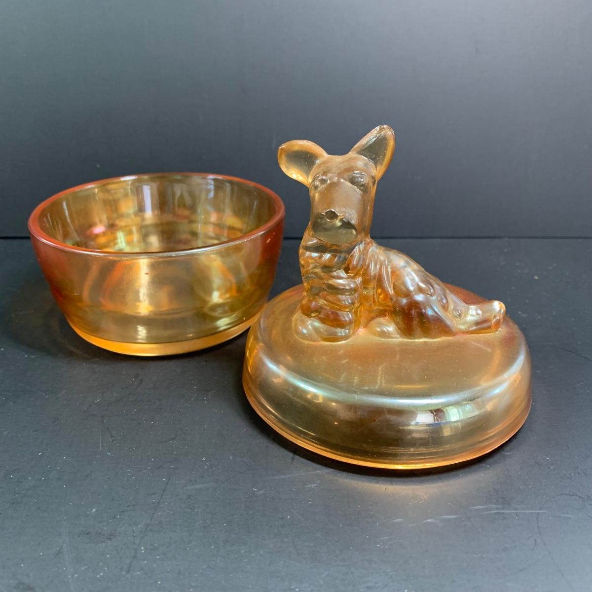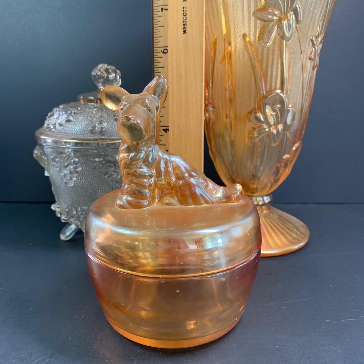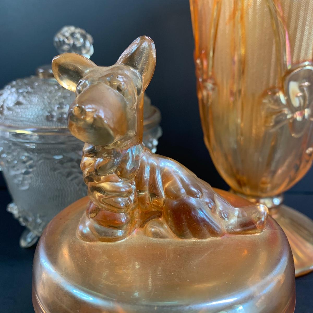 LOT 69R: Vintage Marigold Carnival Glass Powder Jar w/Scottish Terrier, Marigold Carnival Glass Vae & More