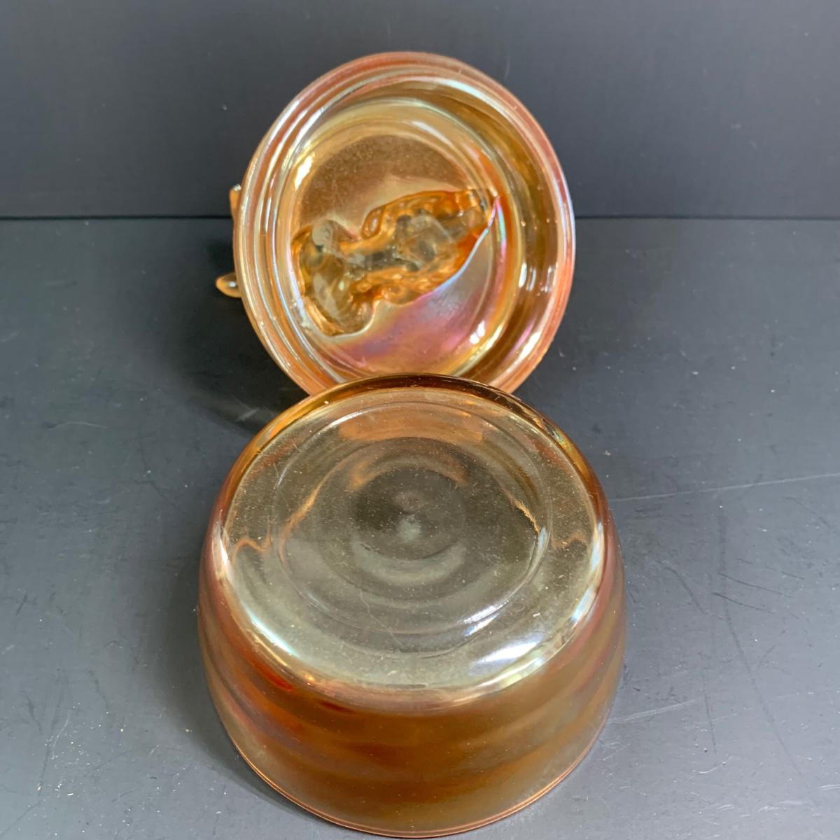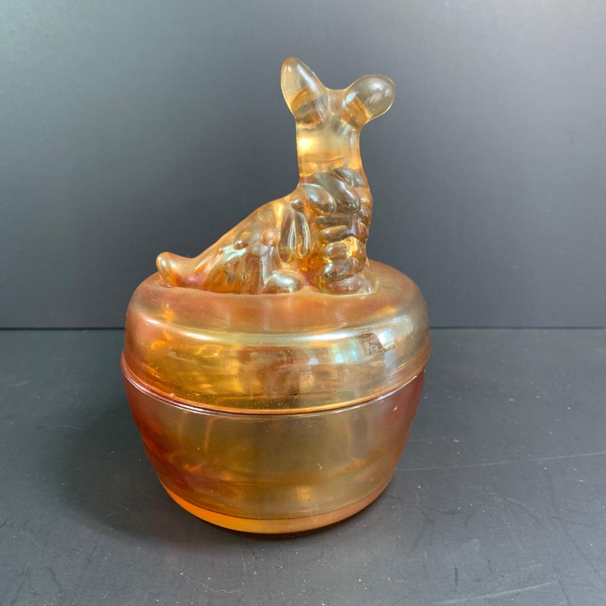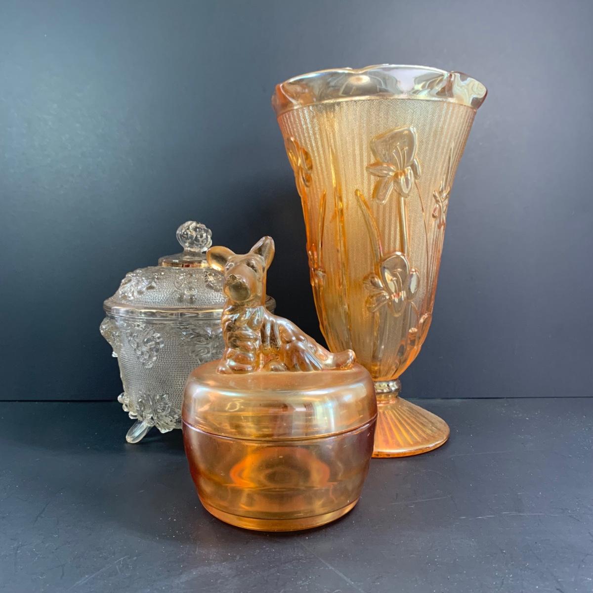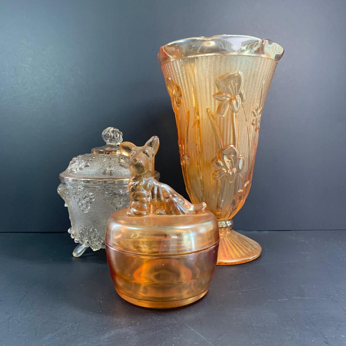LOT 69R: Vintage Marigold Carnival Glass Powder Jar w/Scottish Terrier, Marigold Carnival Glass Vae & More