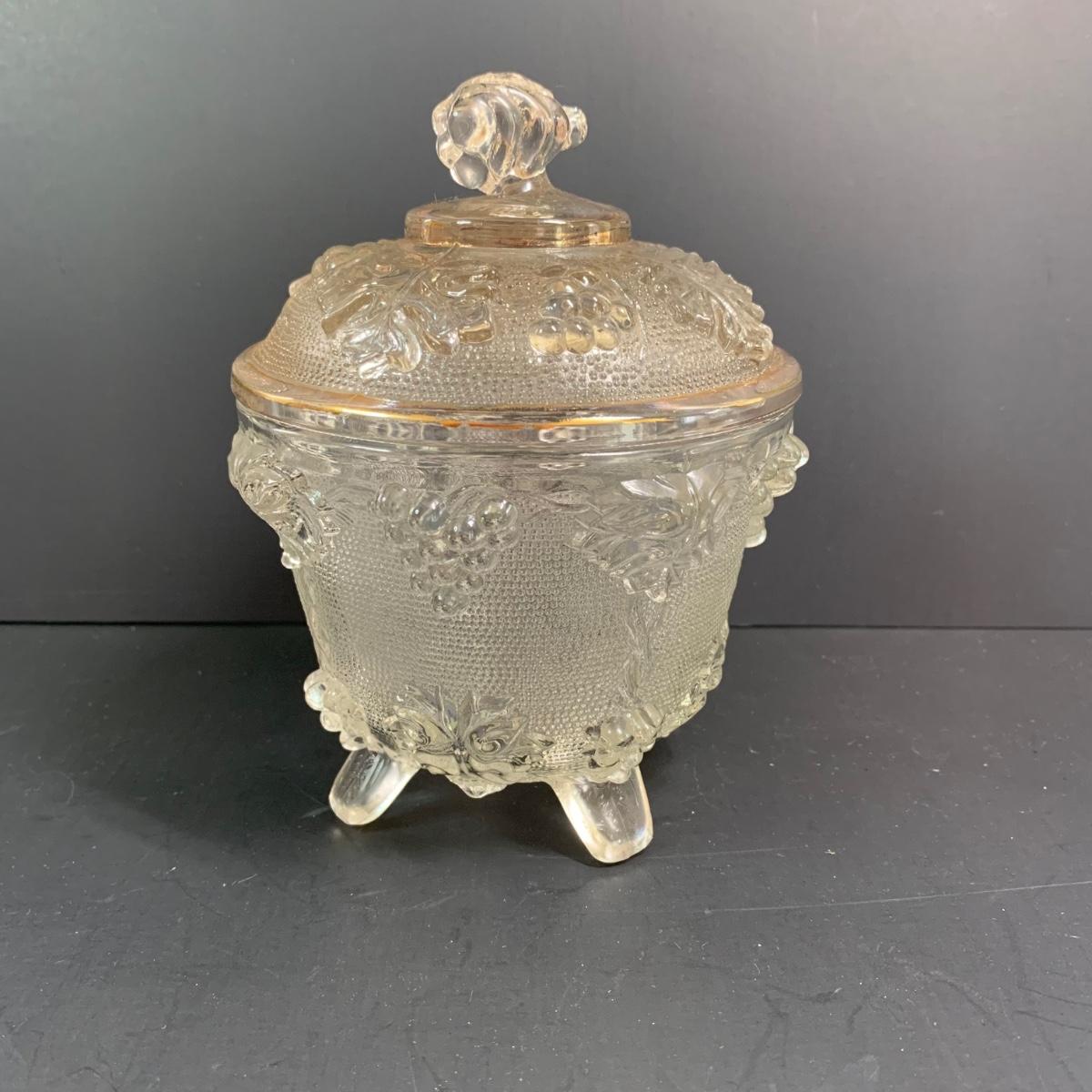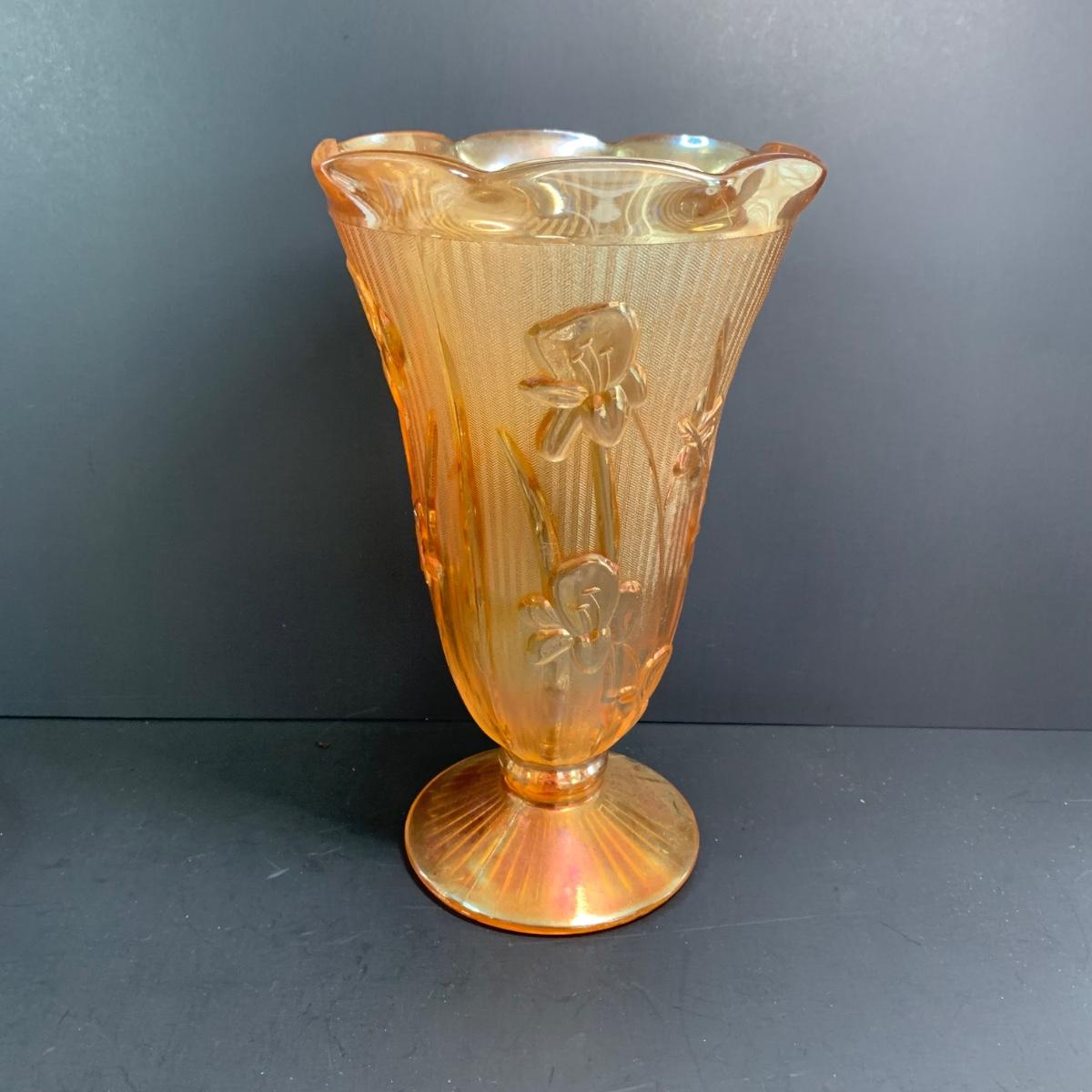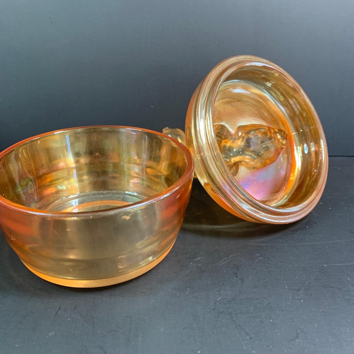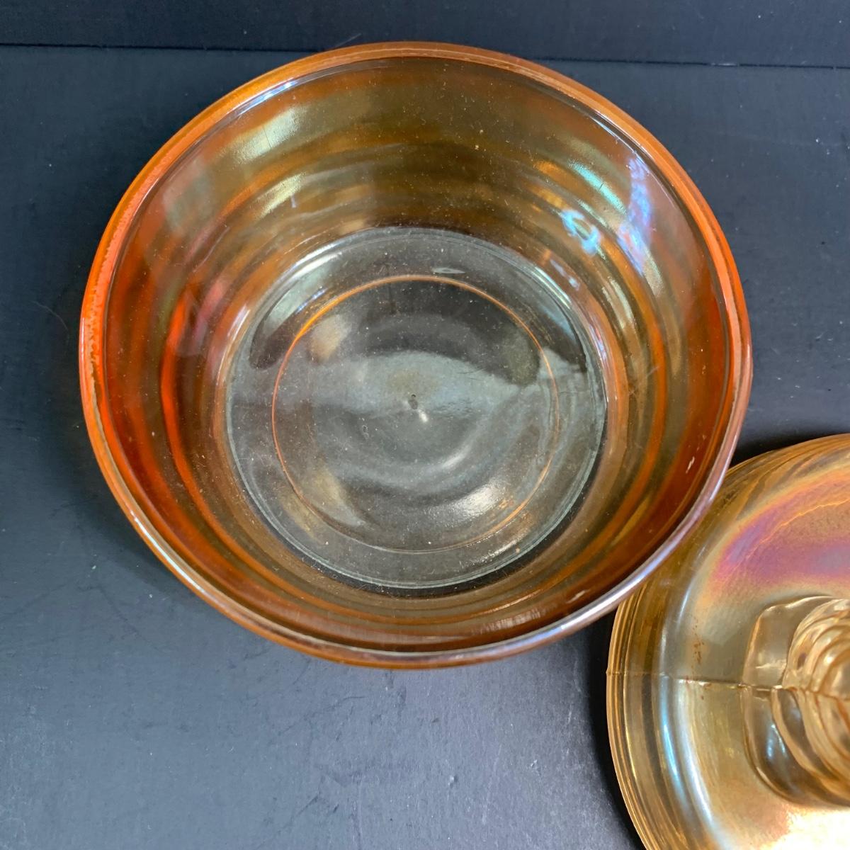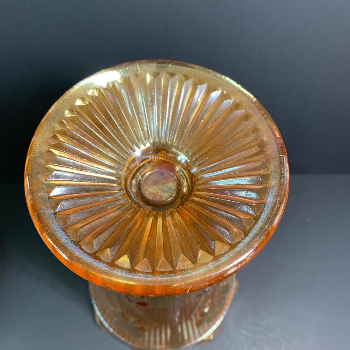 LOT 69R: Vintage Marigold Carnival Glass Powder Jar w/Scottish Terrier, Marigold Carnival Glass Vae & More