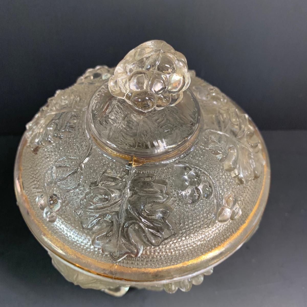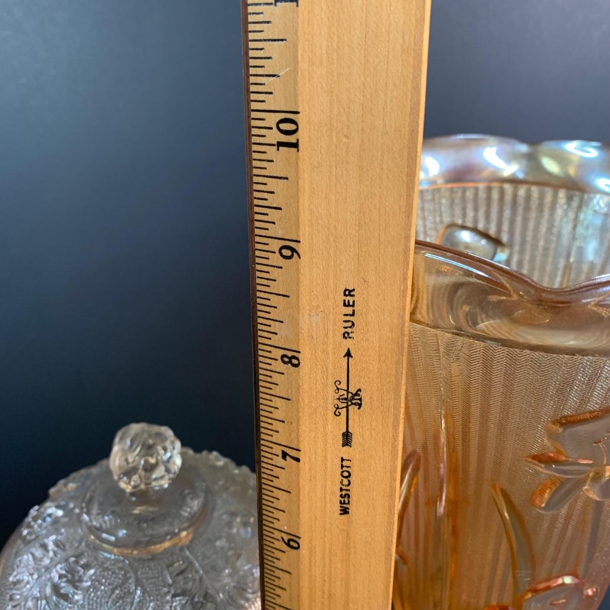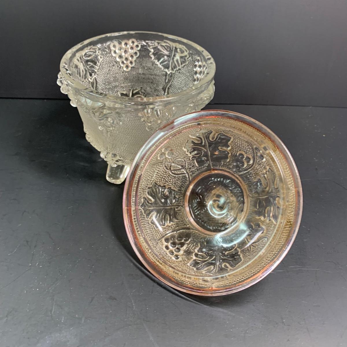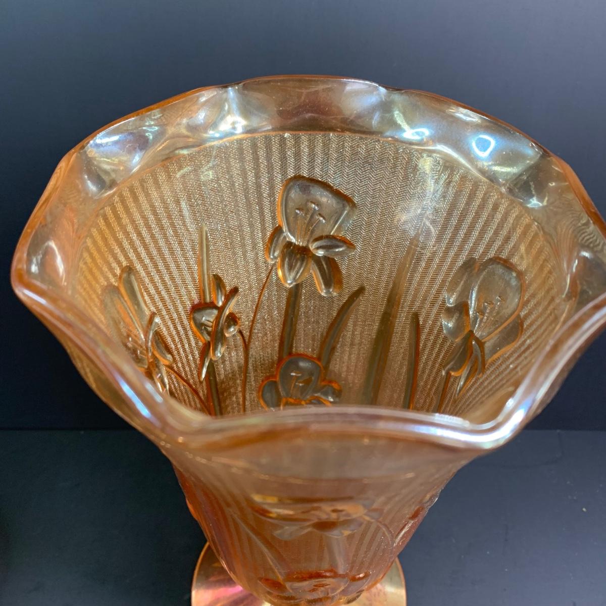 LOT 69R: Vintage Marigold Carnival Glass Powder Jar w/Scottish Terrier, Marigold Carnival Glass Vae & More