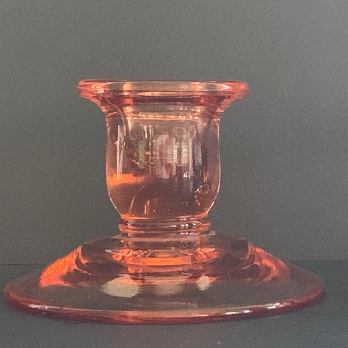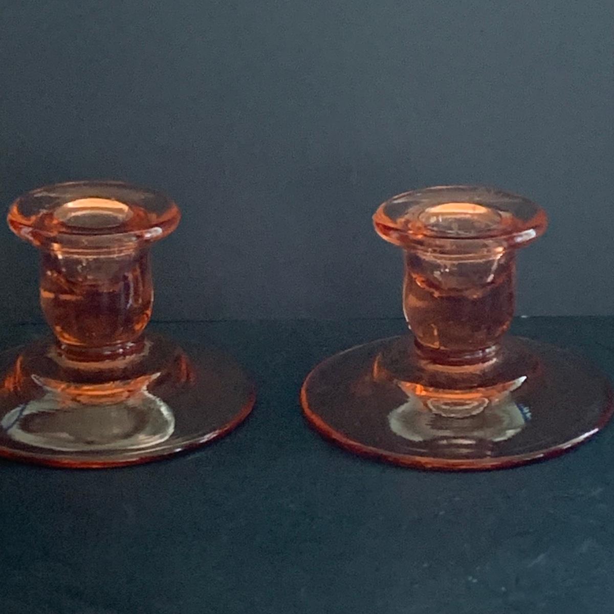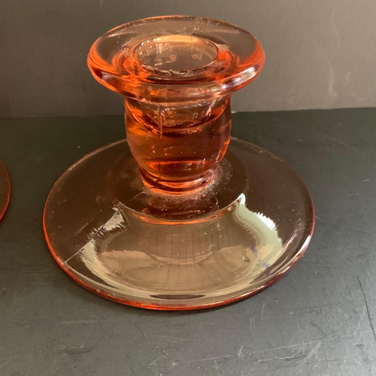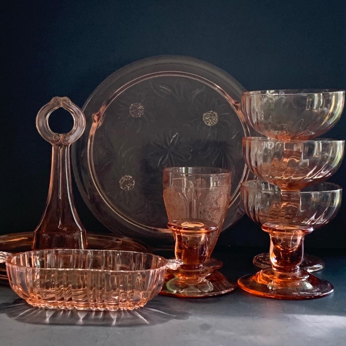 LOT 77R: Pink Depression Glass Collection: Candlesticks, Glass Caddy, Dessert Dishes & More