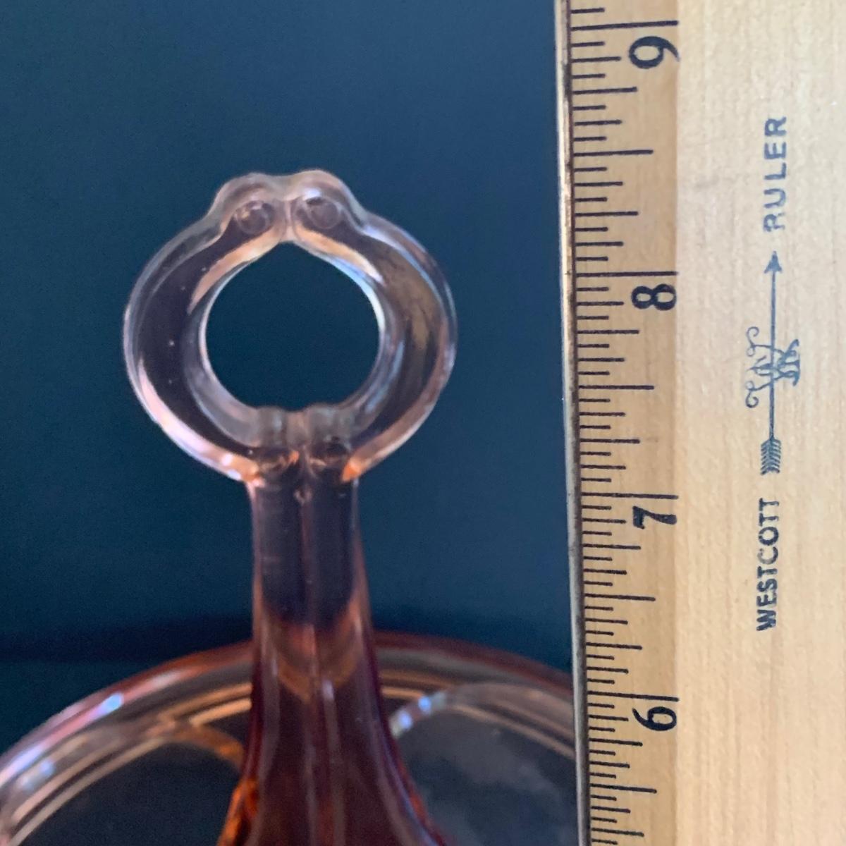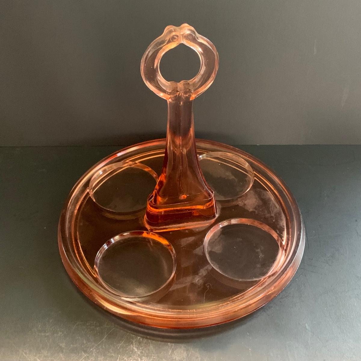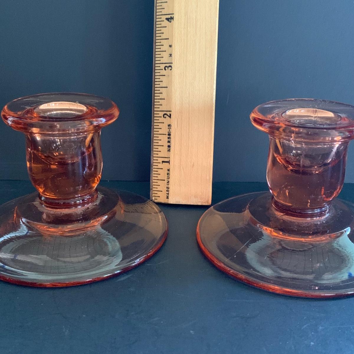 LOT 77R: Pink Depression Glass Collection: Candlesticks, Glass Caddy, Dessert Dishes & More