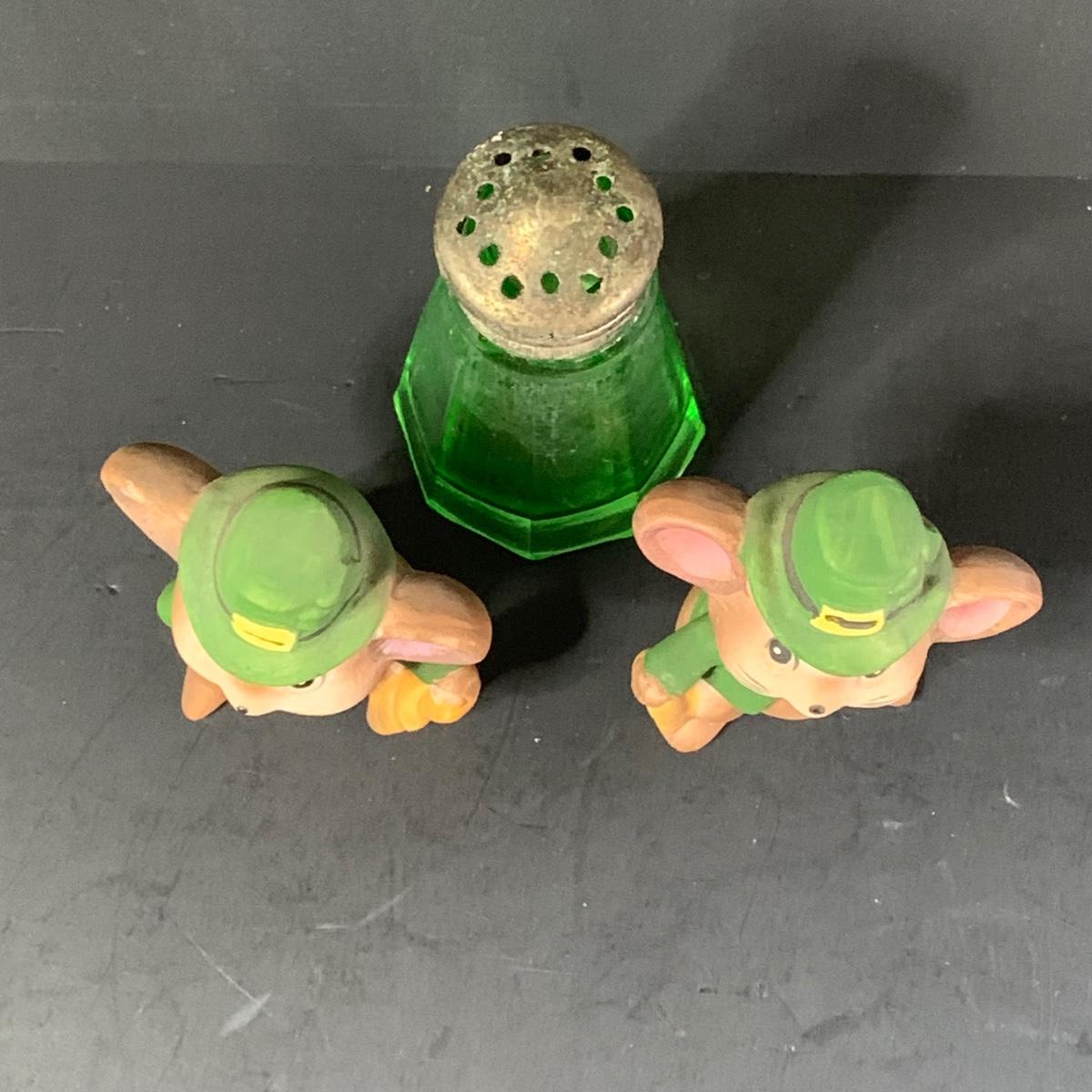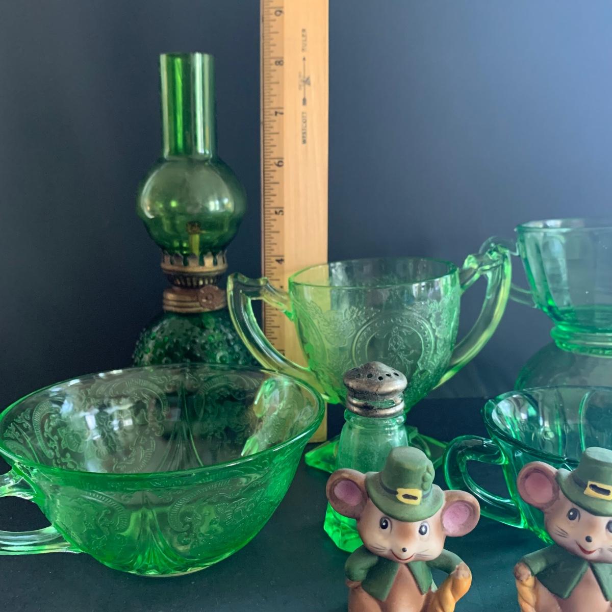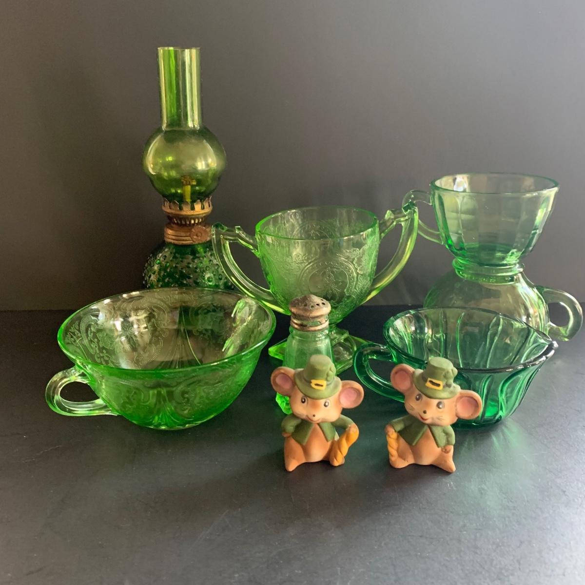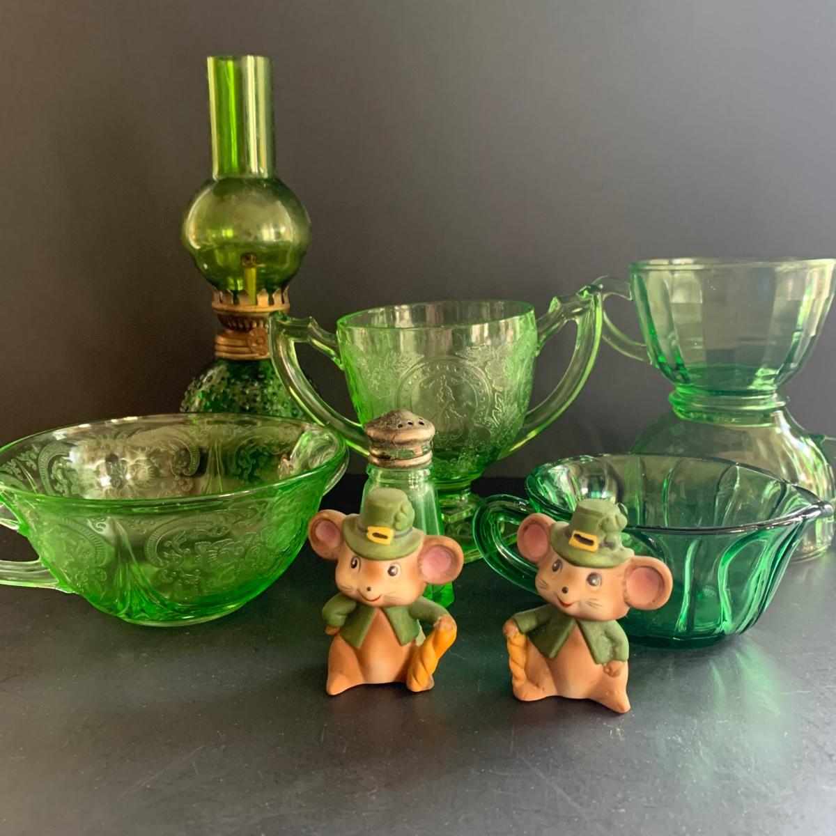 LOT 78R: Vintage Uranium Glass, Green Oil Lamp, Lucky Leprechaun Mouse Figures
