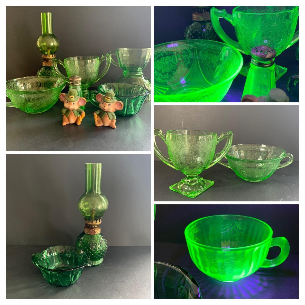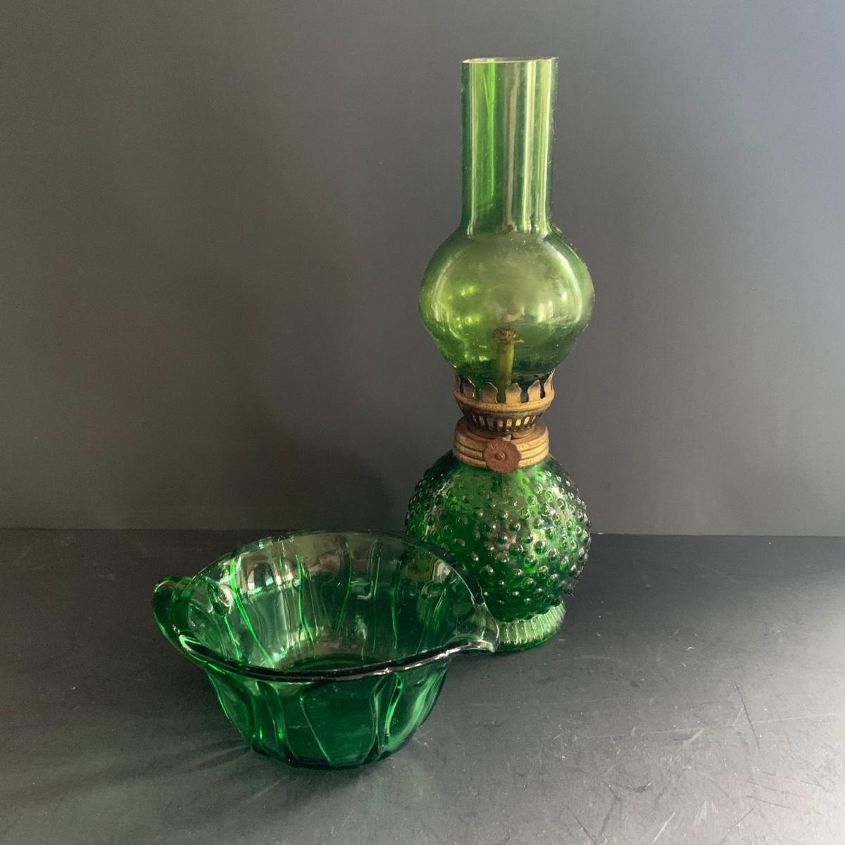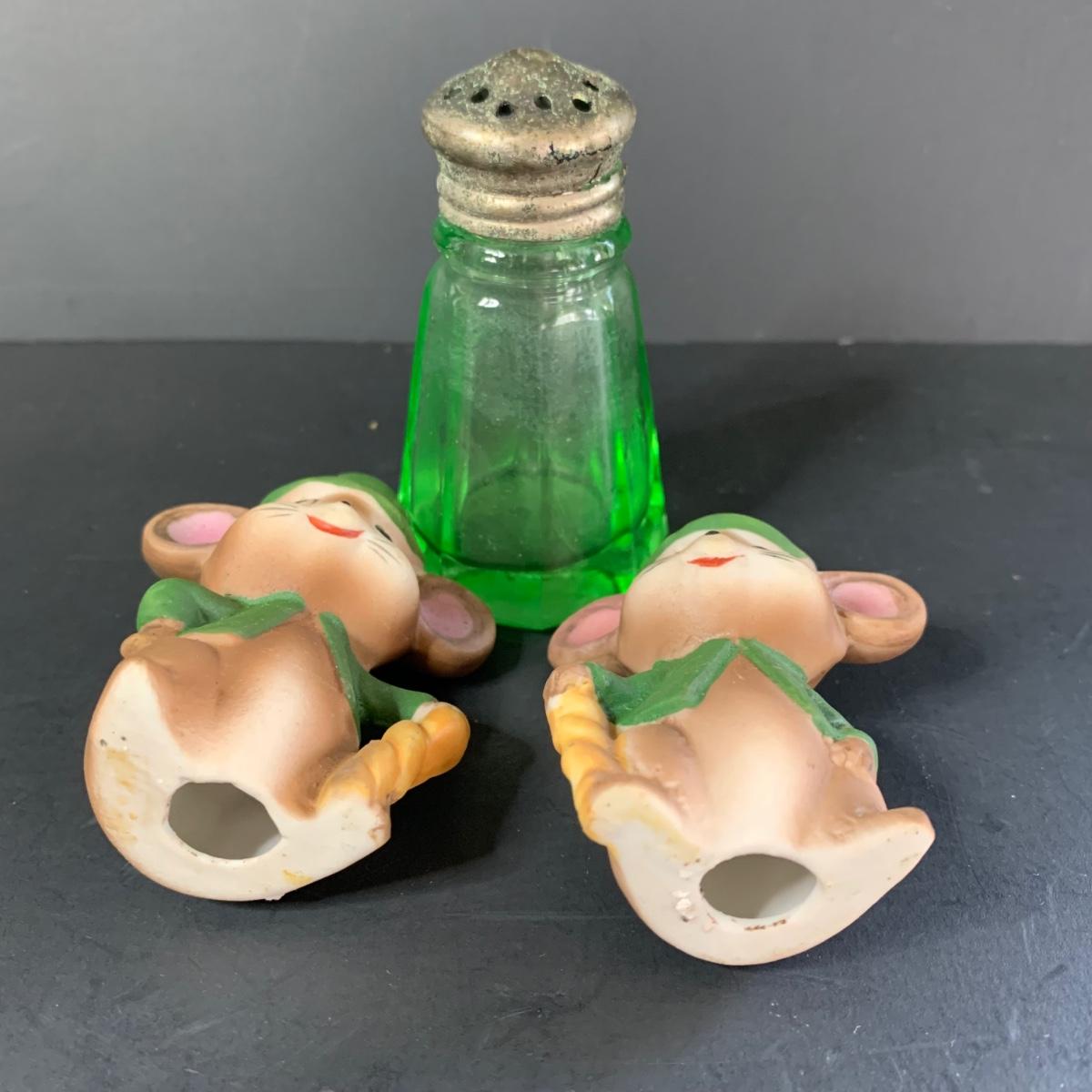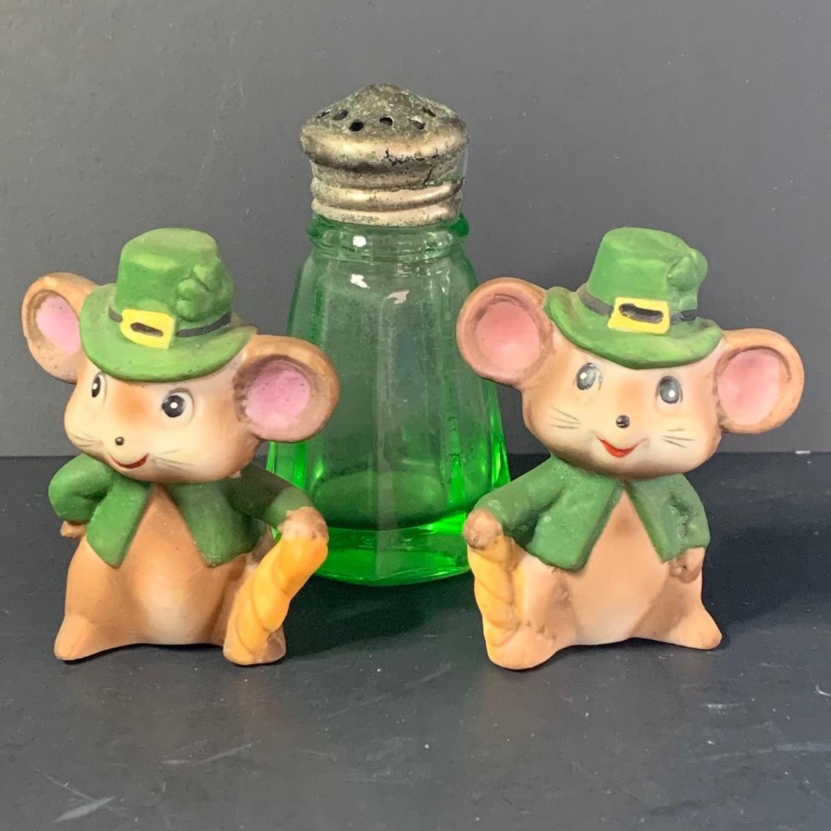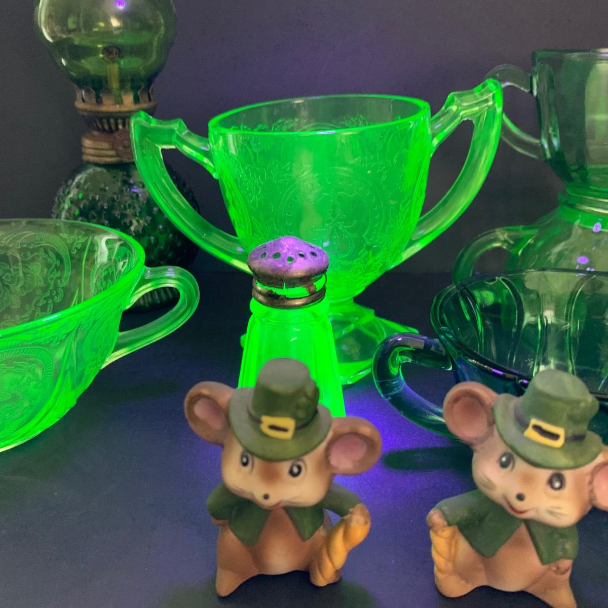 LOT 78R: Vintage Uranium Glass, Green Oil Lamp, Lucky Leprechaun Mouse Figures