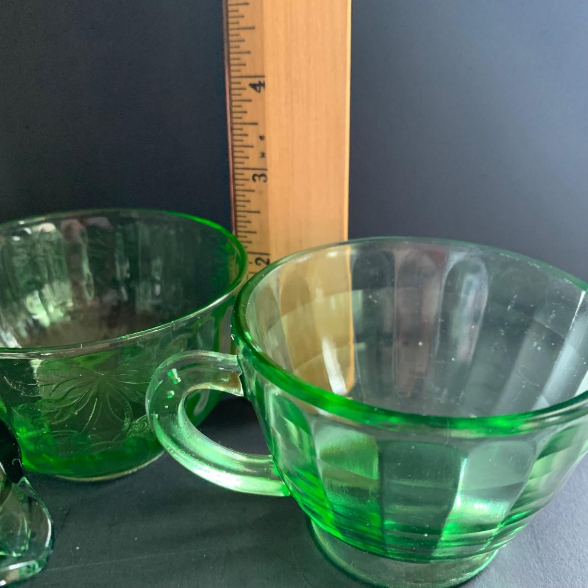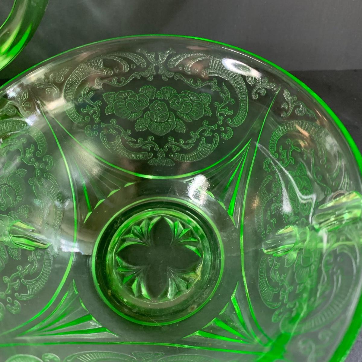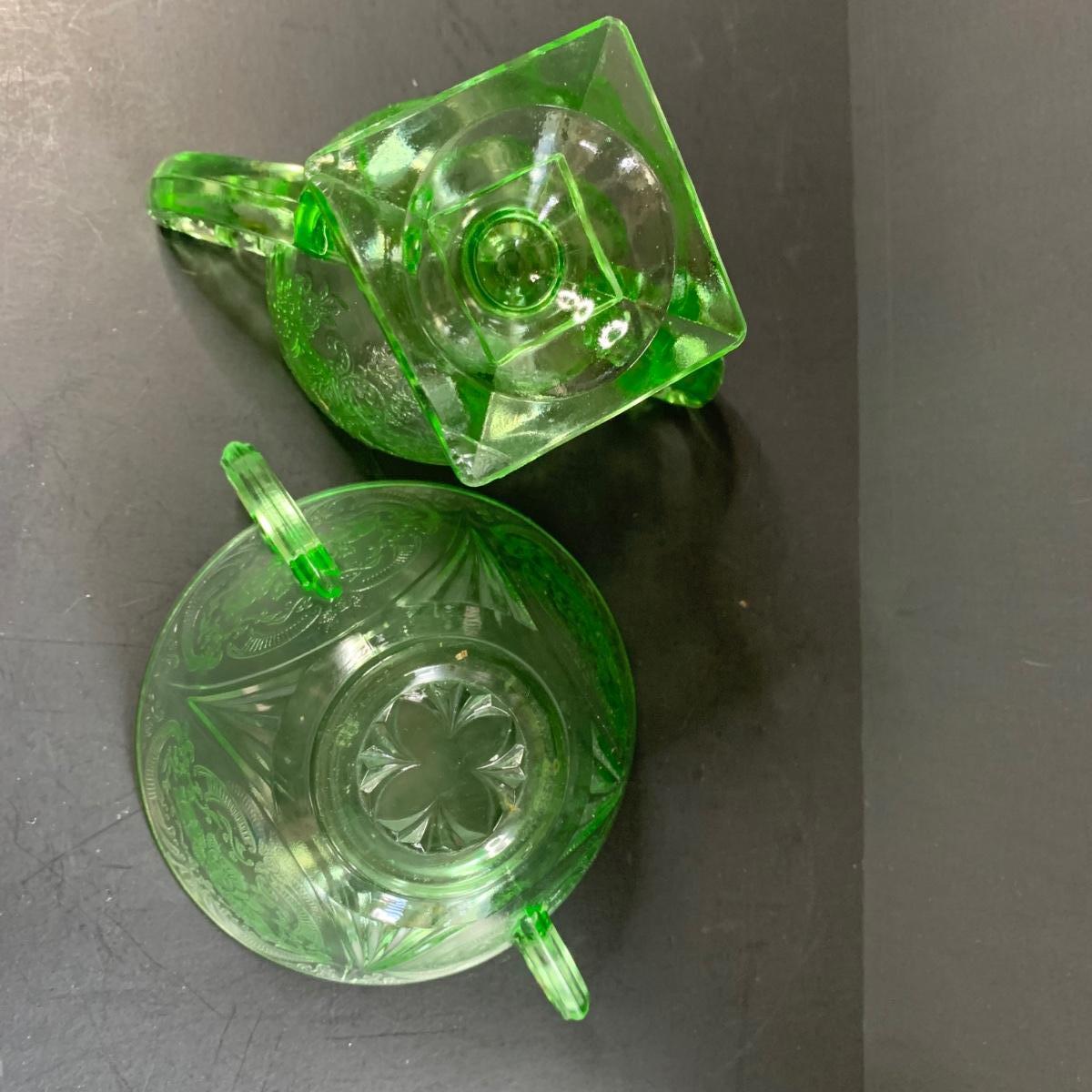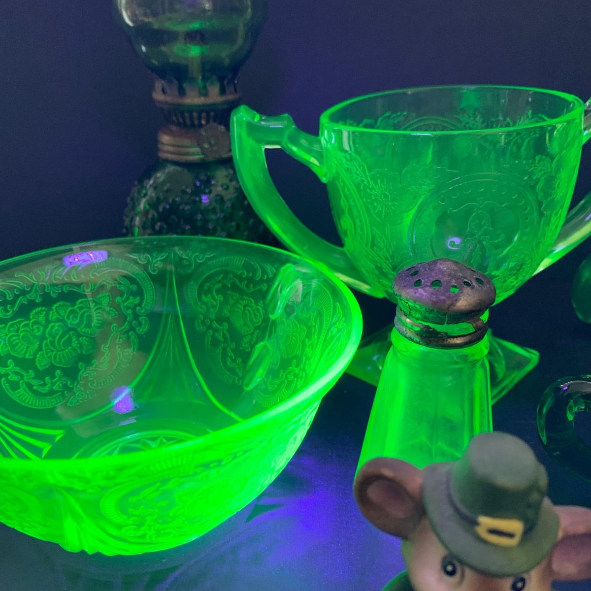 LOT 78R: Vintage Uranium Glass, Green Oil Lamp, Lucky Leprechaun Mouse Figures