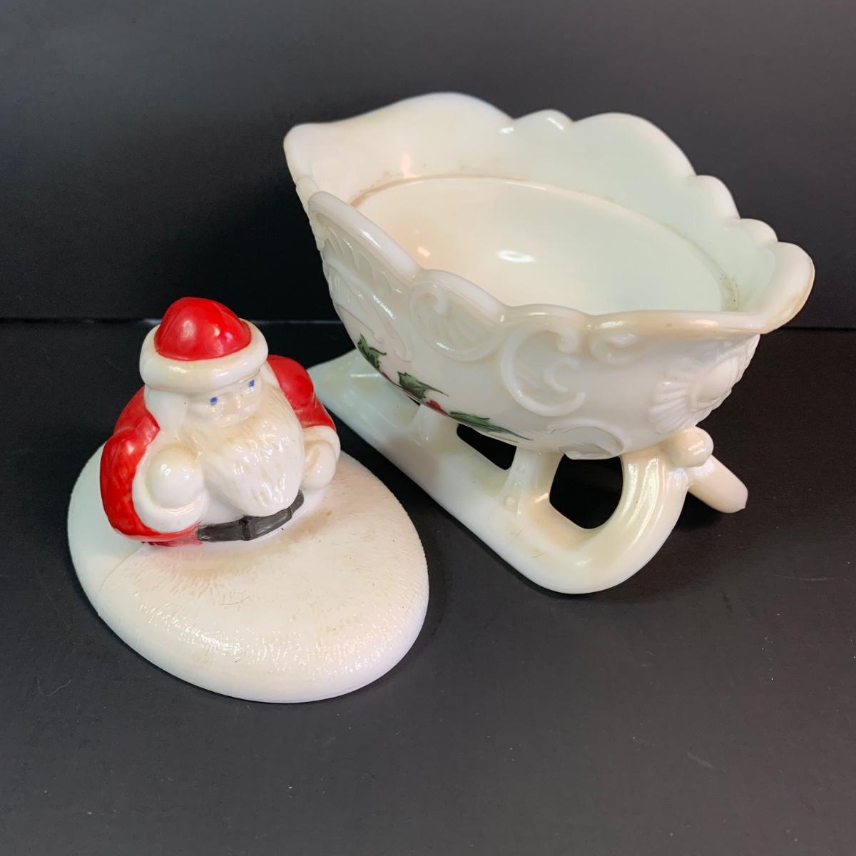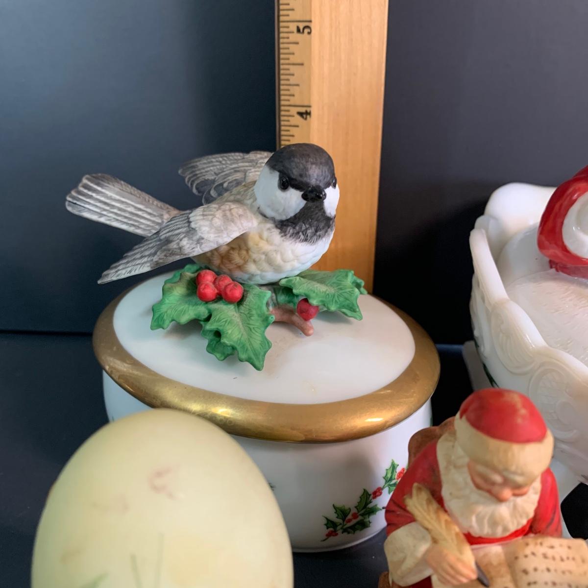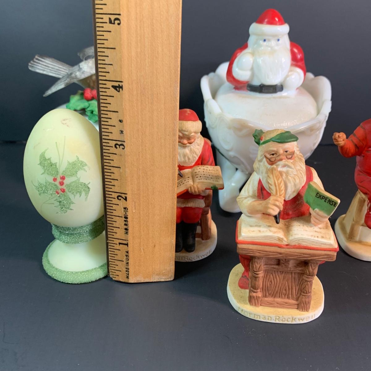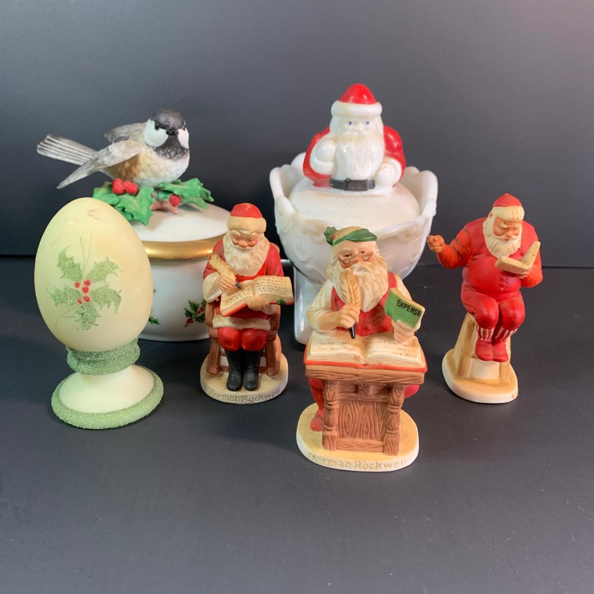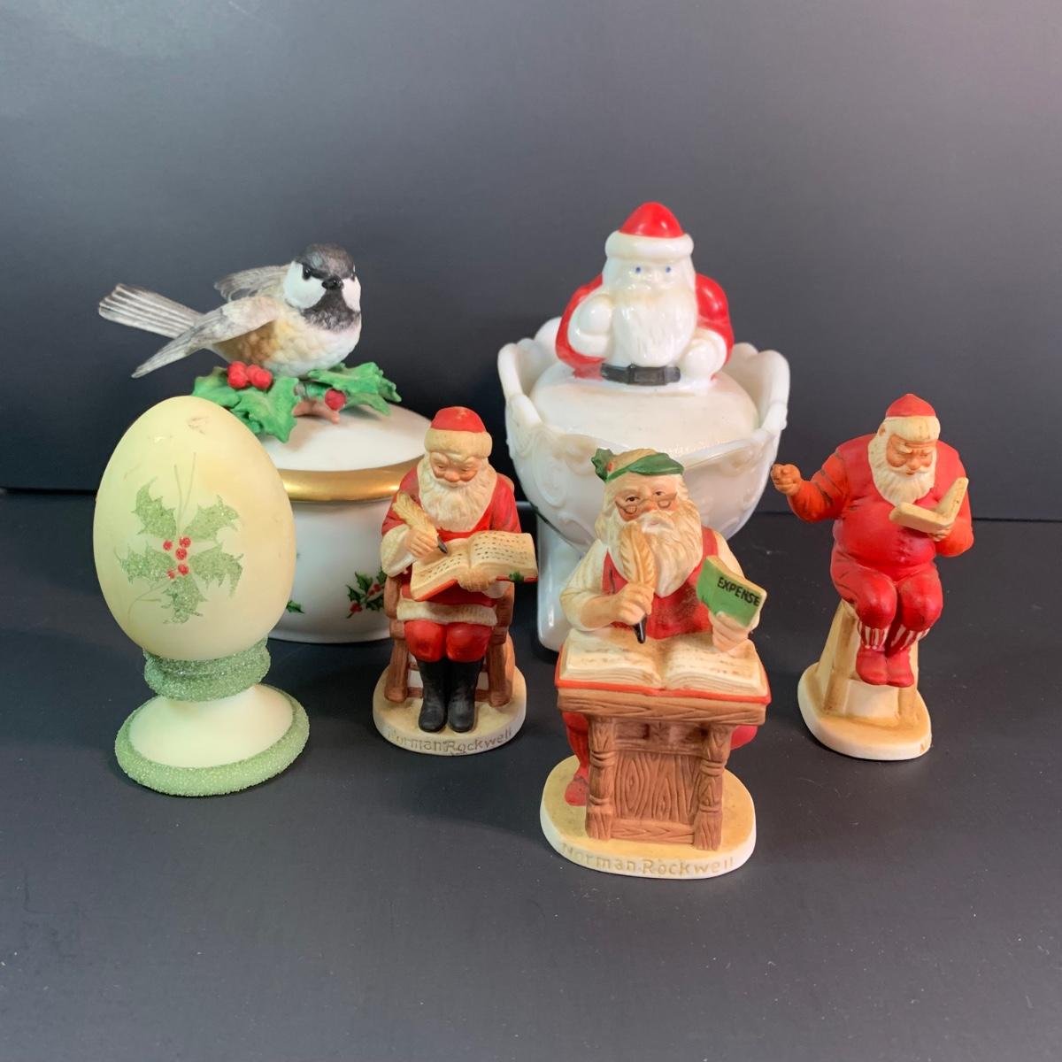 LOT 88R: Westmoreland Santa on Sleigh, Lennox Chick-a-Dee Music Box, Fenton Egg on Pedestal & Normal Rockwell Figures