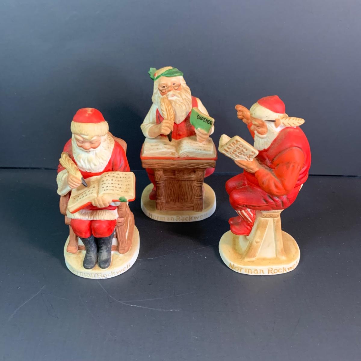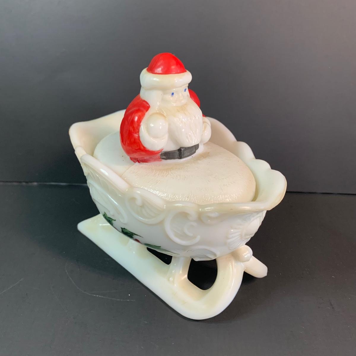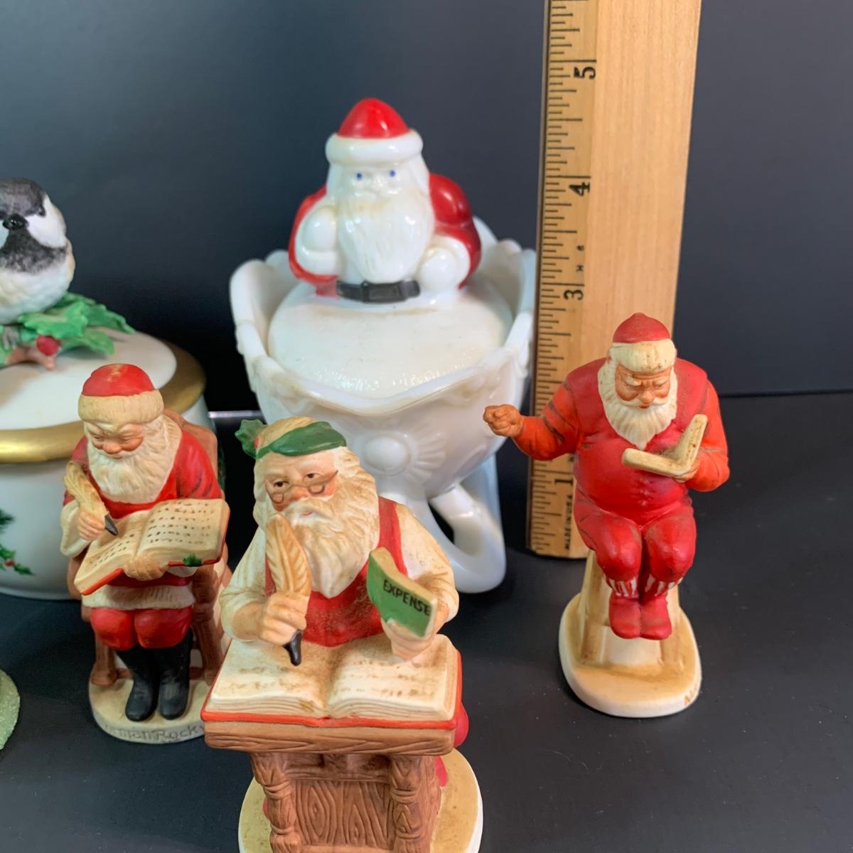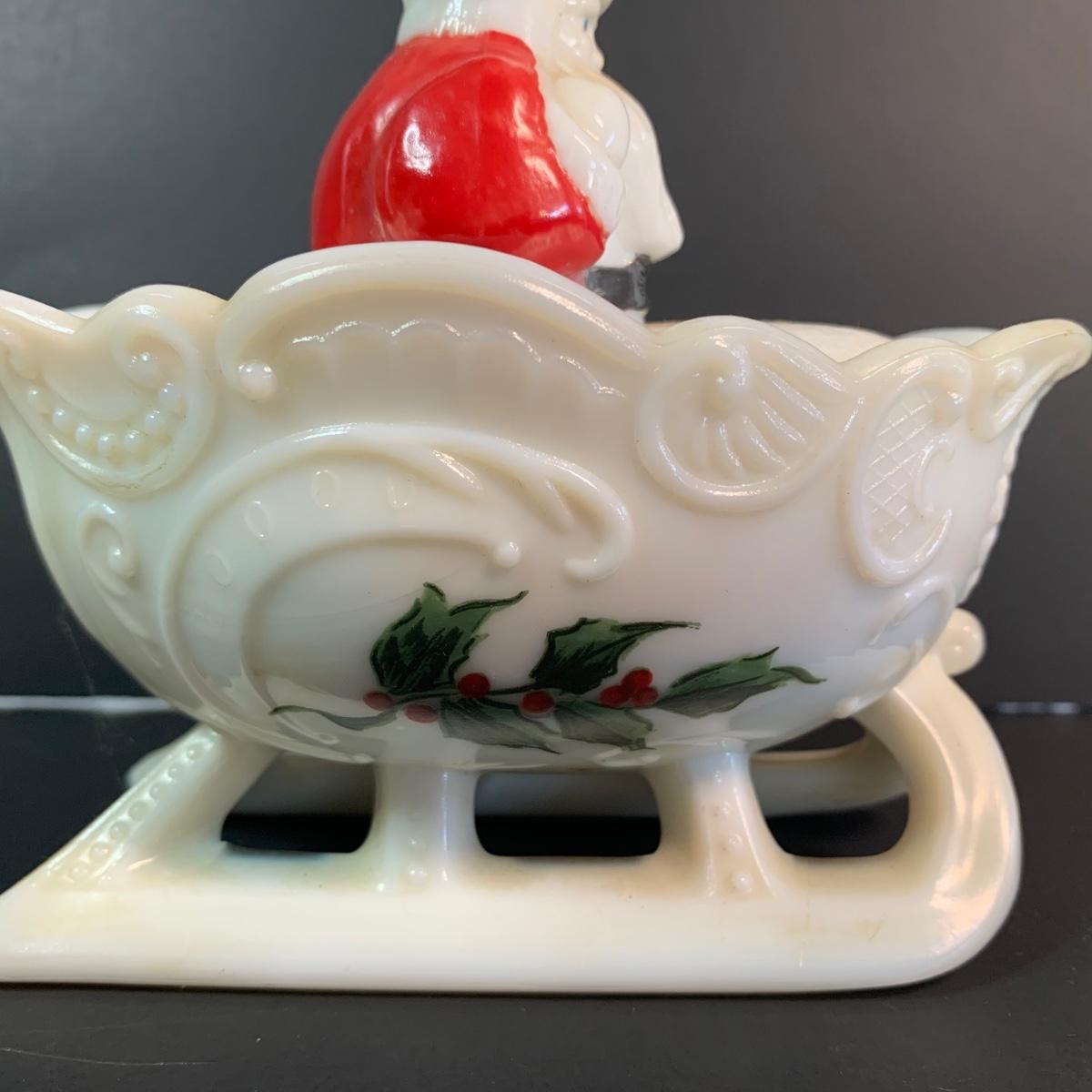 LOT 88R: Westmoreland Santa on Sleigh, Lennox Chick-a-Dee Music Box, Fenton Egg on Pedestal & Normal Rockwell Figures