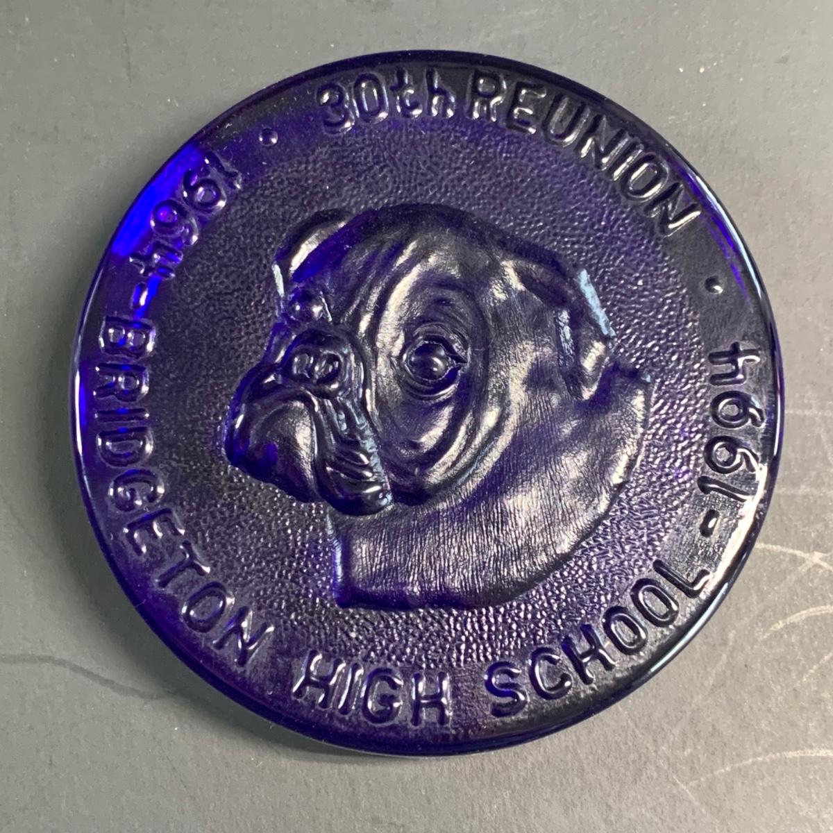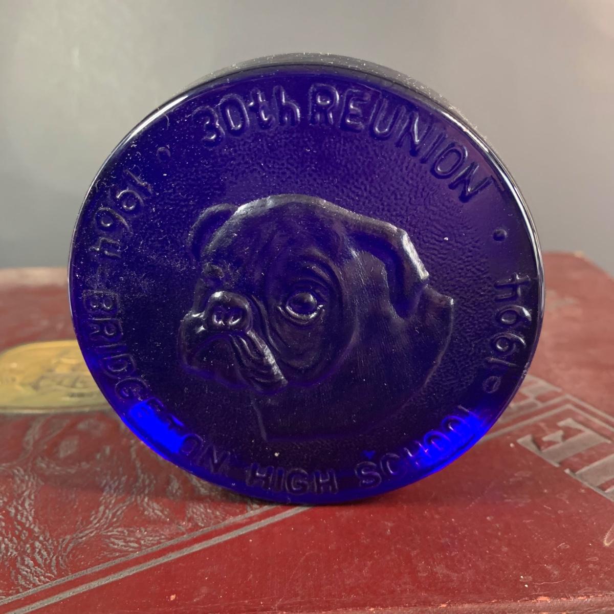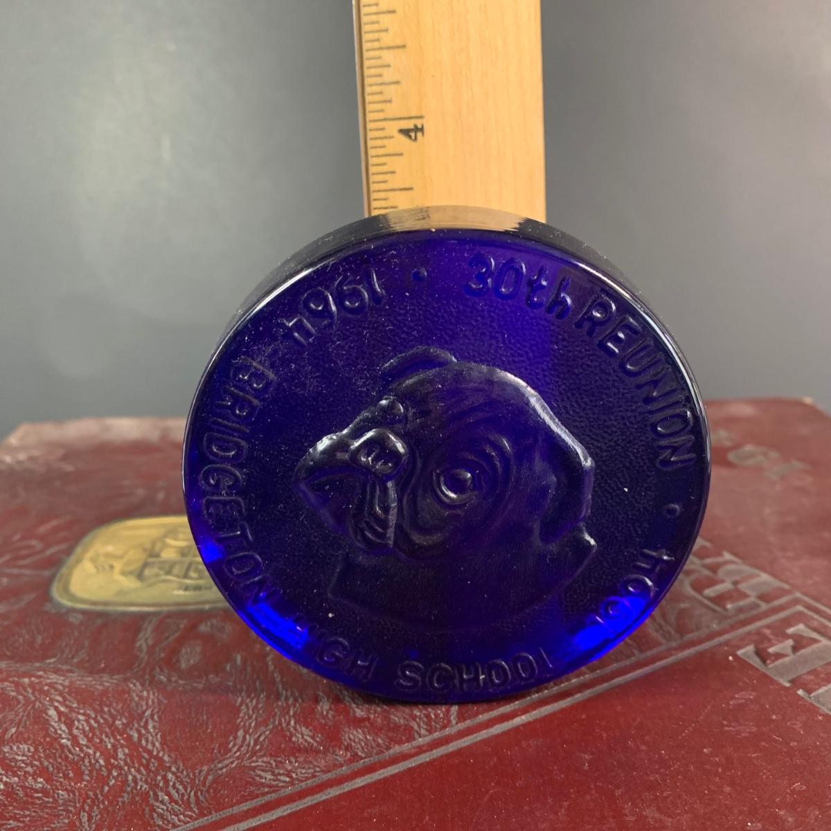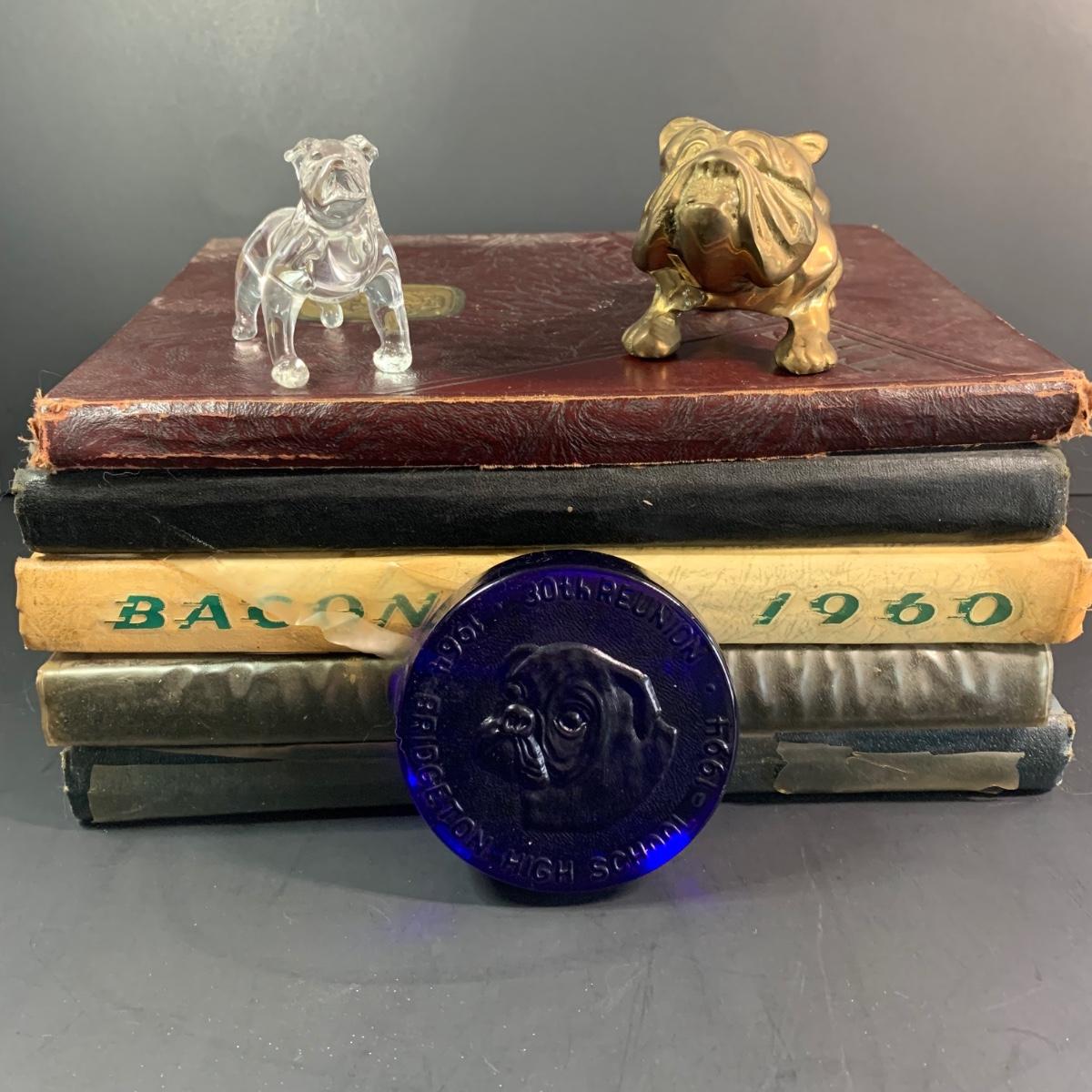 LOT 95R: Vintage Yearbooks, Brass Bulldog, Glass Bulldog & 1964 Bridgeton High School Paperweight