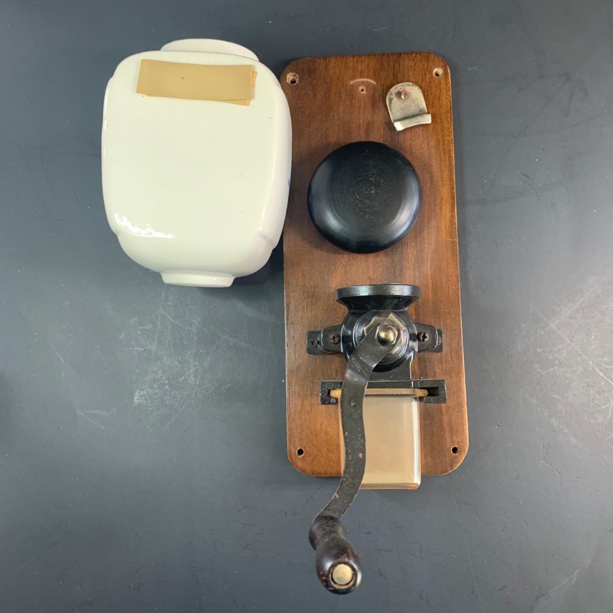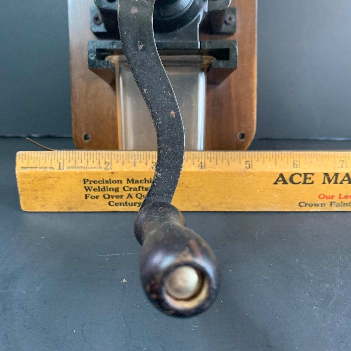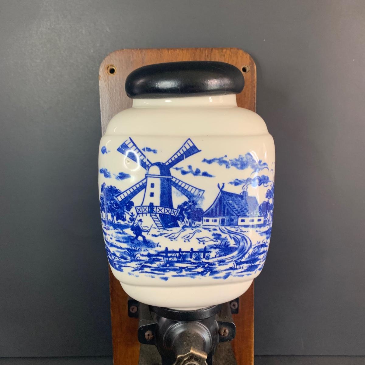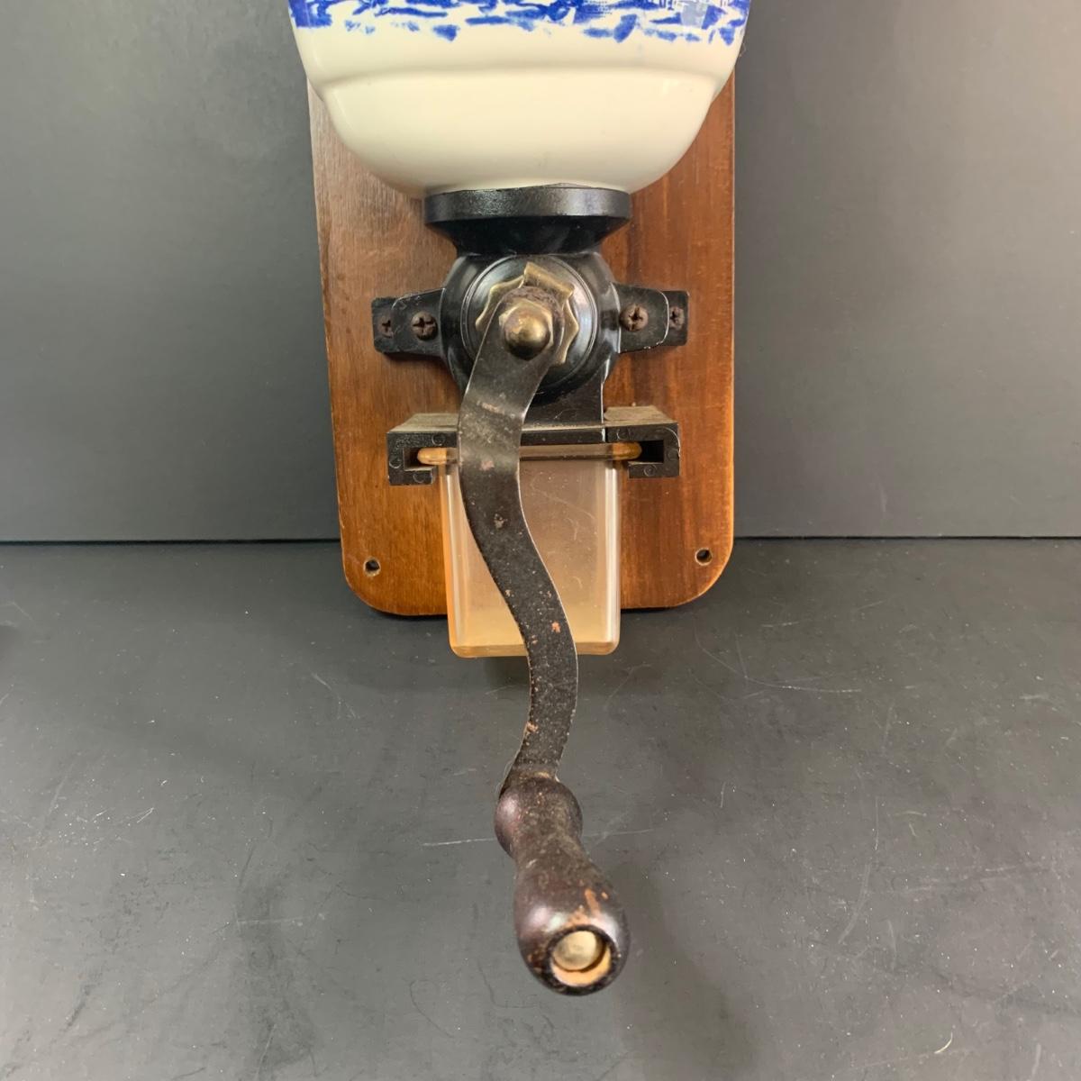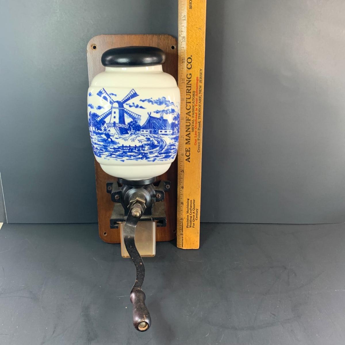 Wall Mount Windmill Coffee Grinder w/plastic receiving hopper, handle, grinder is plastic also and lid is wooden.
