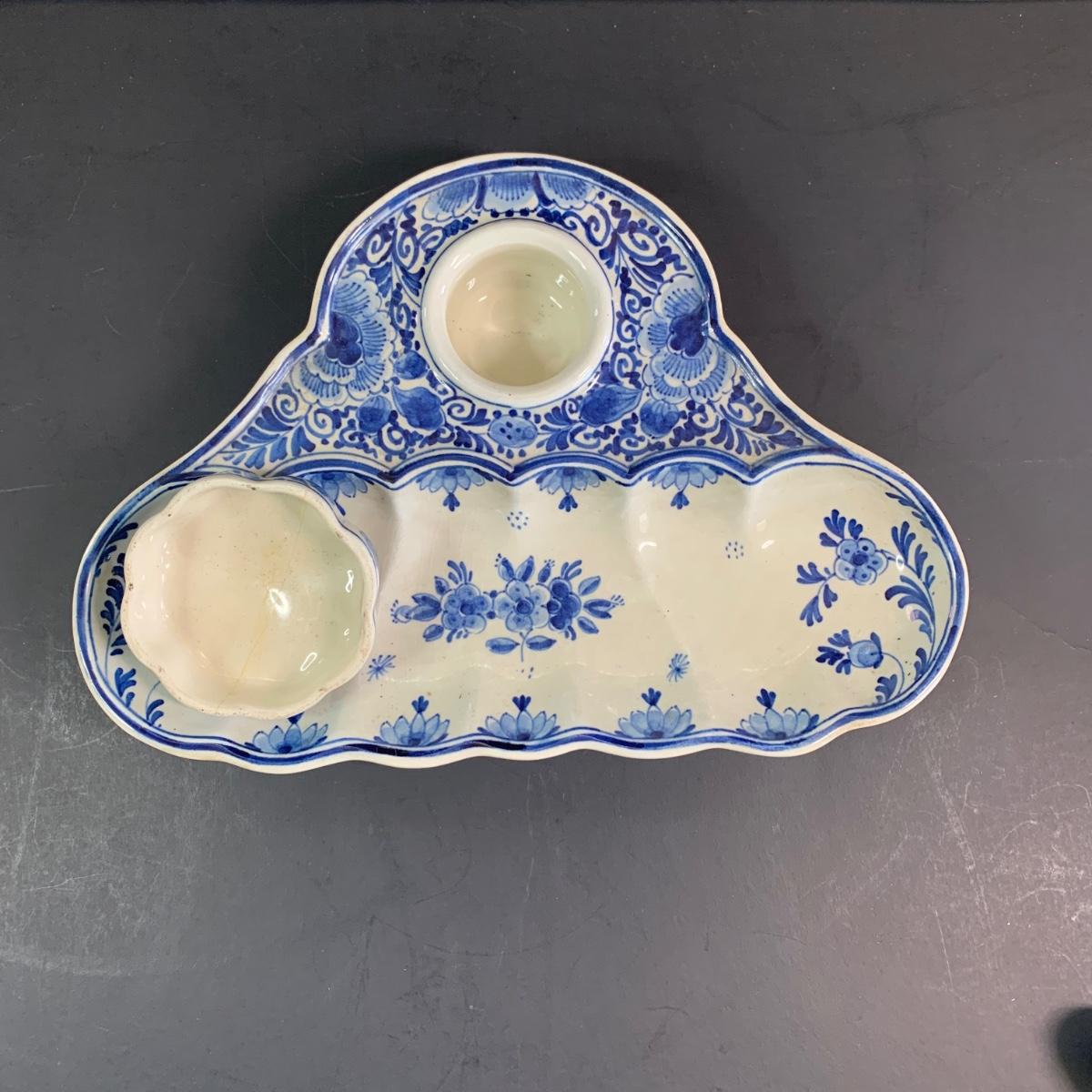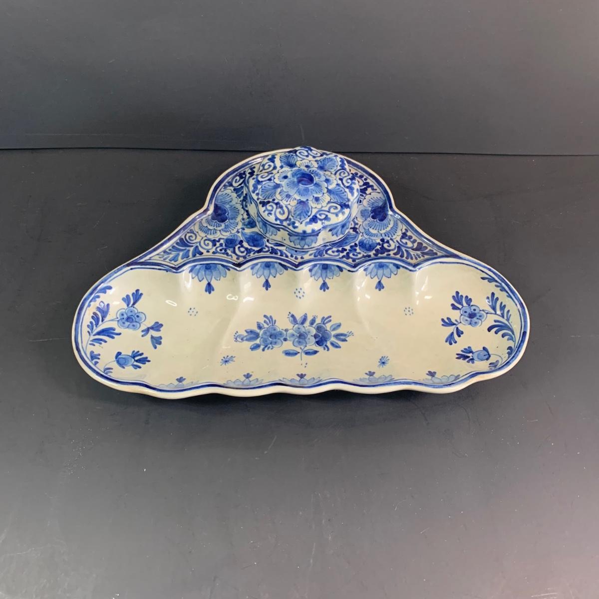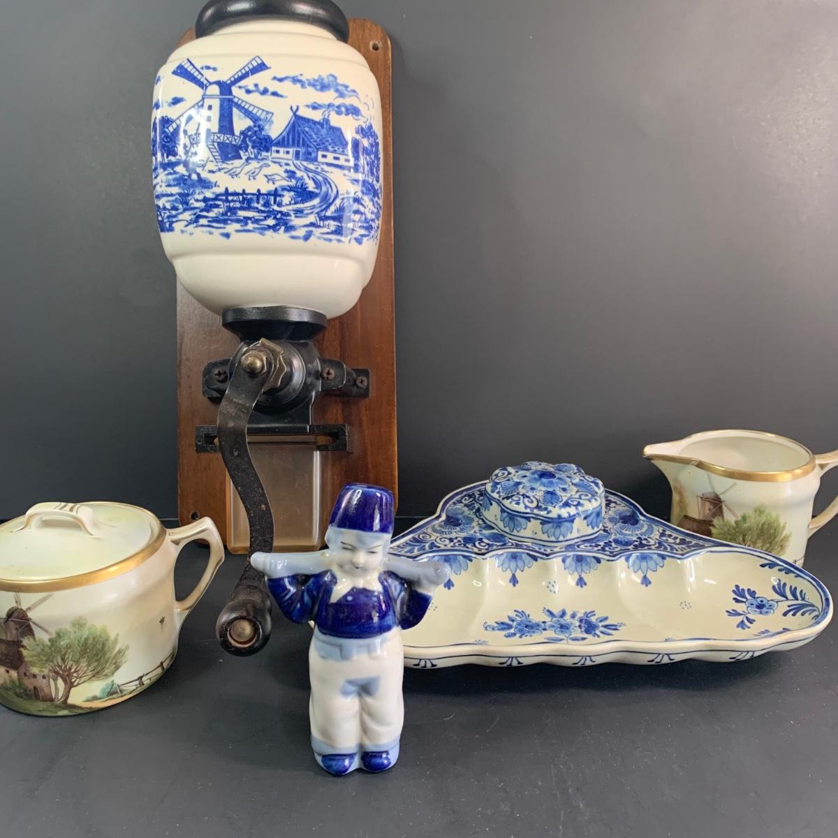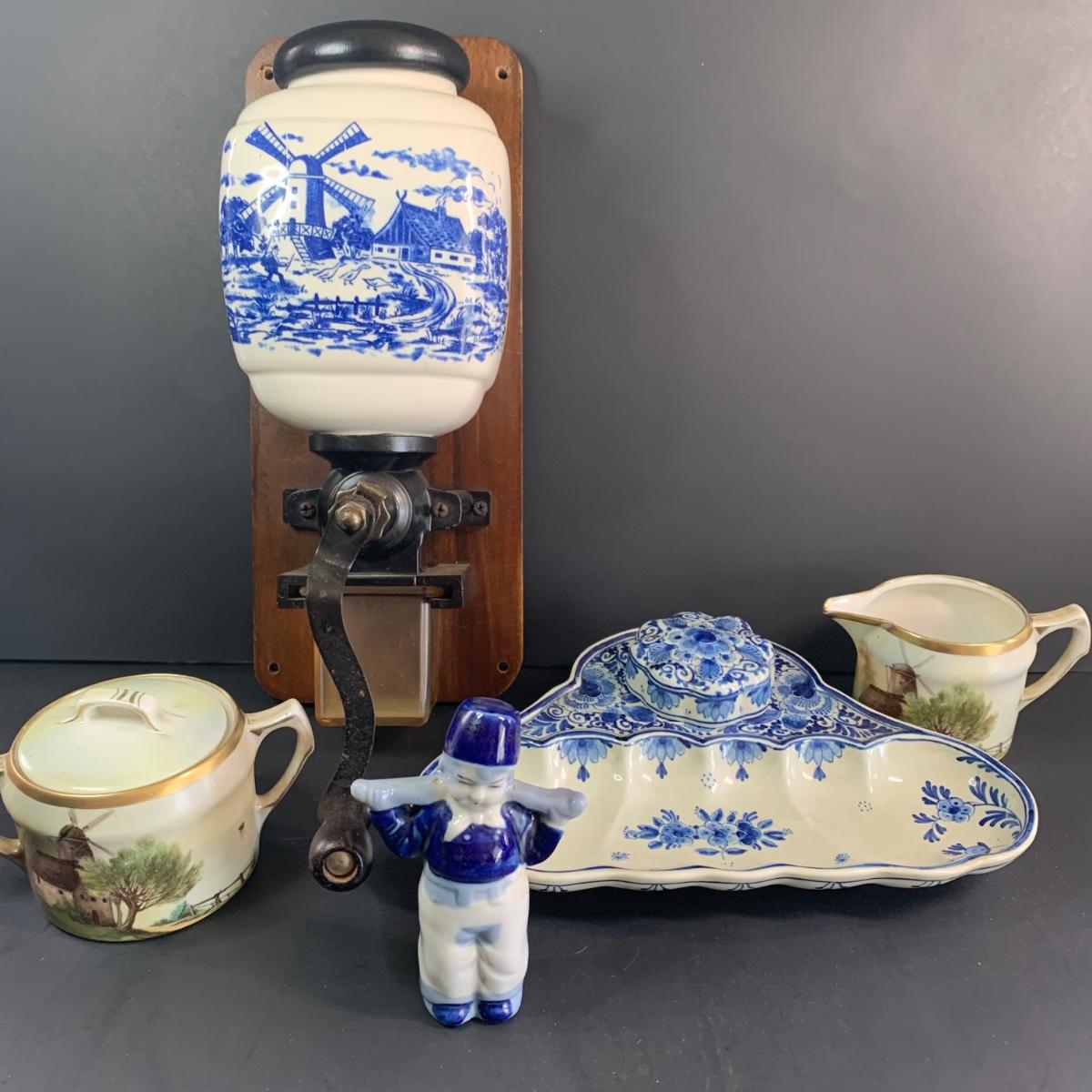 LOT 97R: Royal Delft Blue & White Porcelain Inkwell Pen Tray, Sugar& Creamer Set-made in Germany, Wall Mount Windmill Coffee Grinde