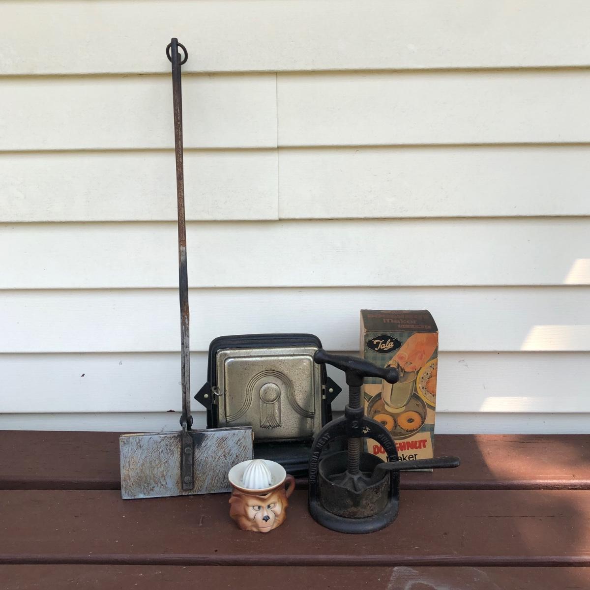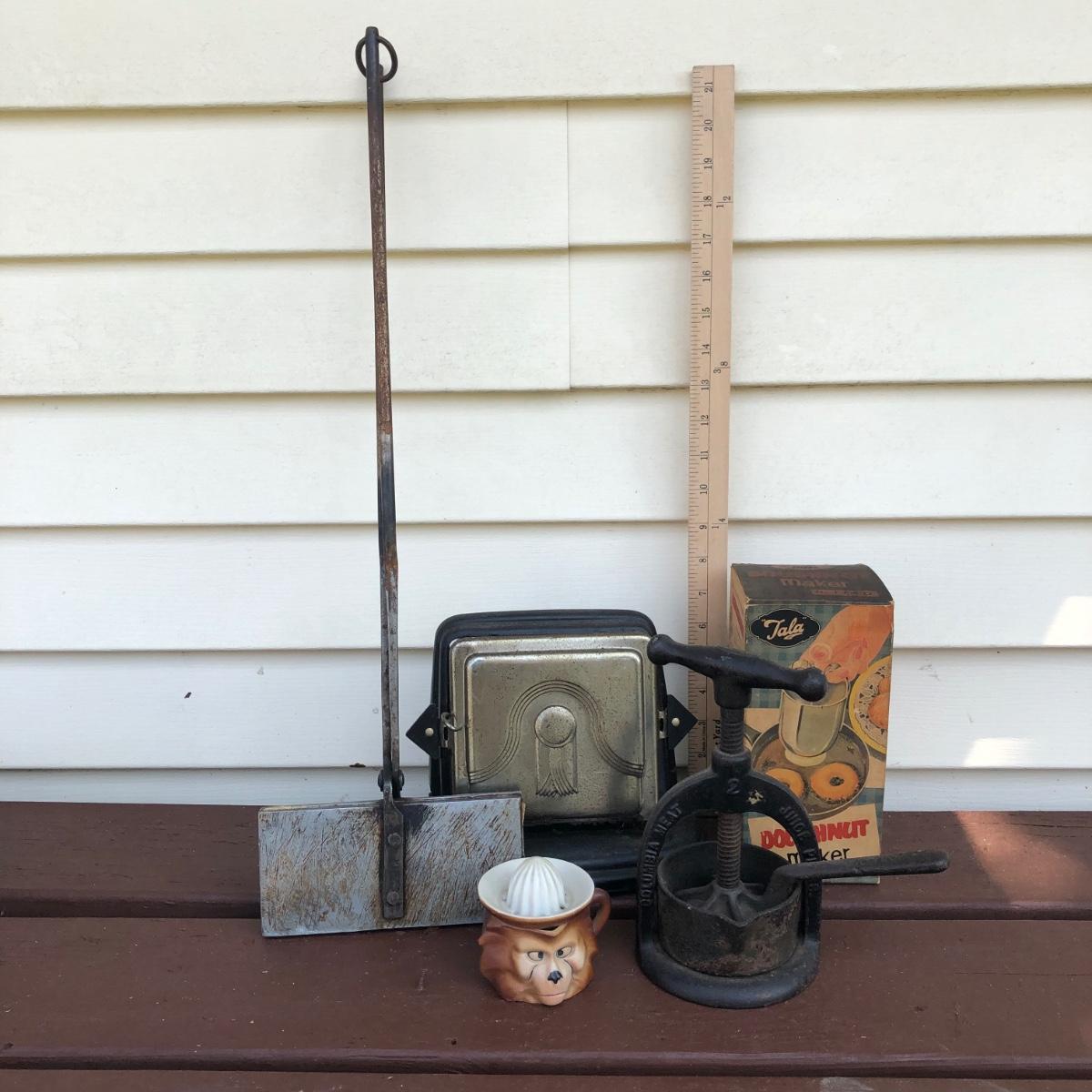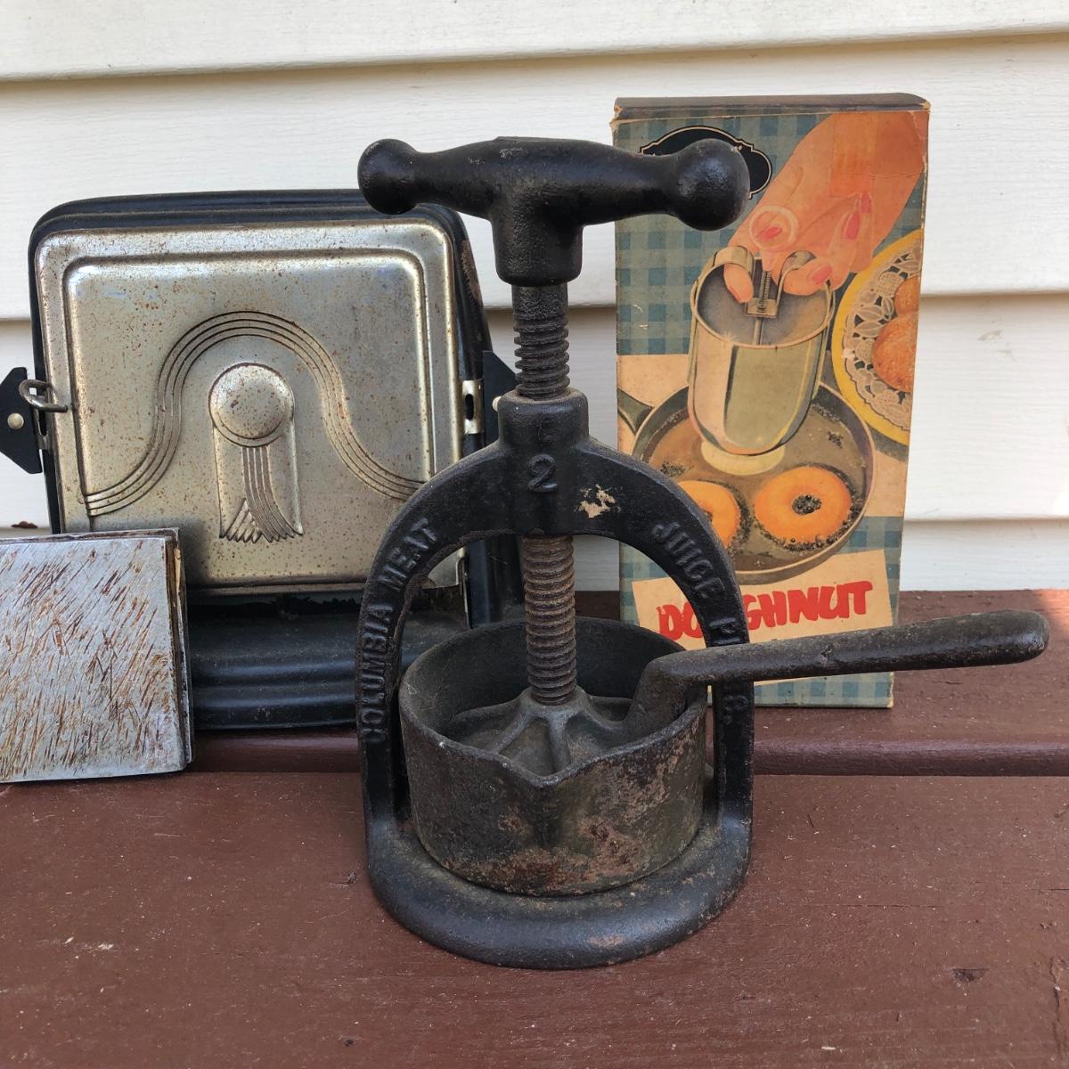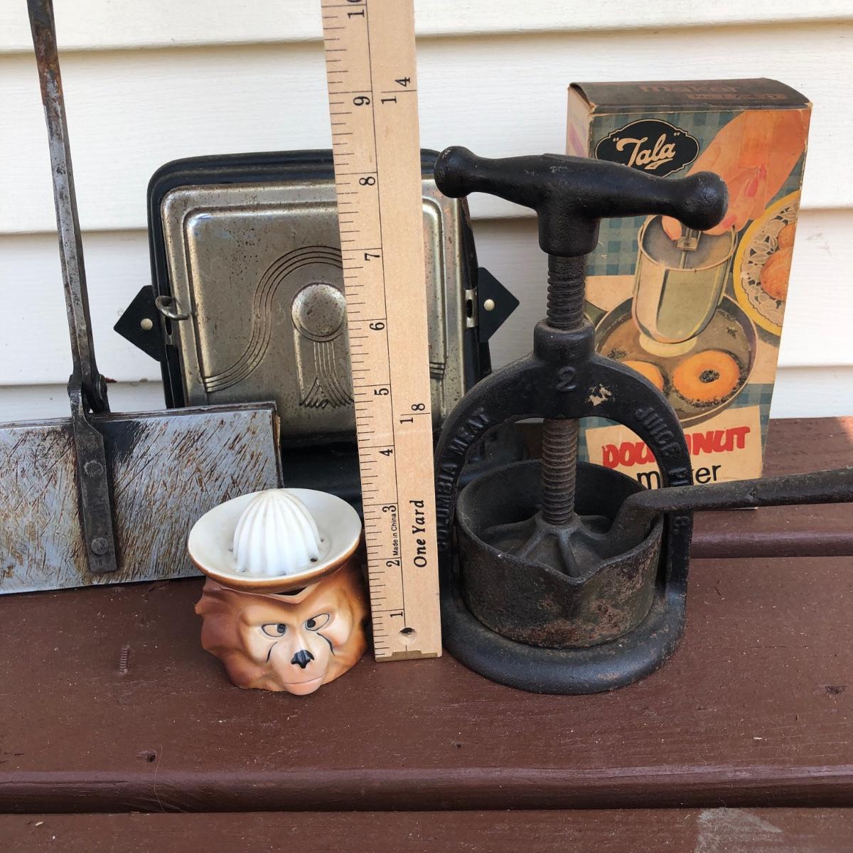 LOT 127: Vintage Kitchen - Columbia Meat Iron Juicer, Kid's Monkey Head Juicer Cup, Toaster, Doughnut Maker & More