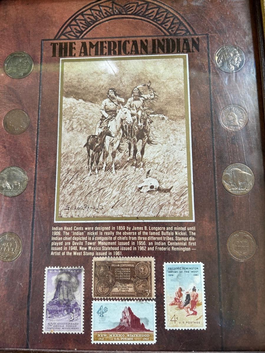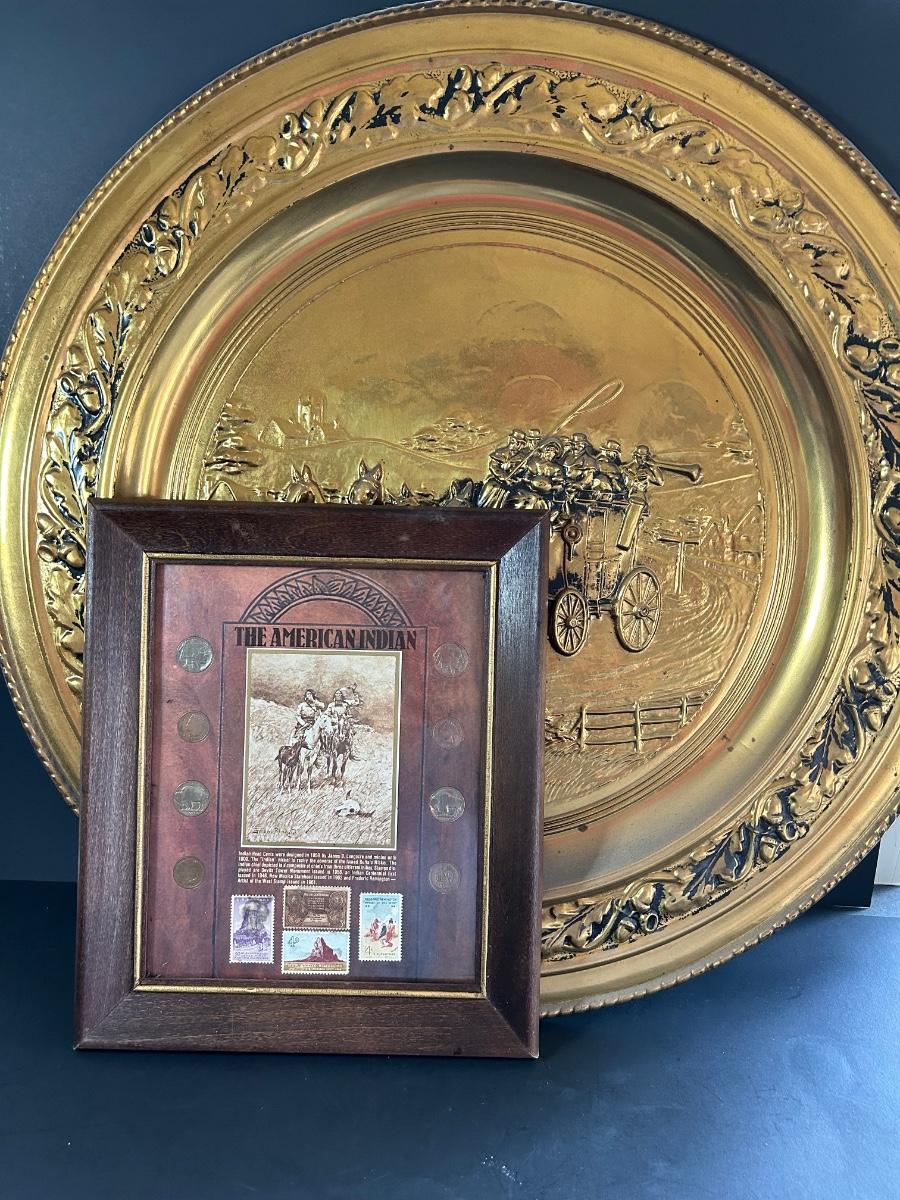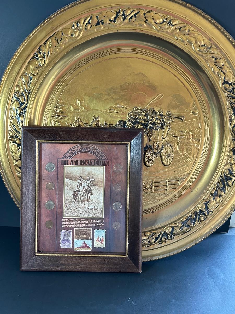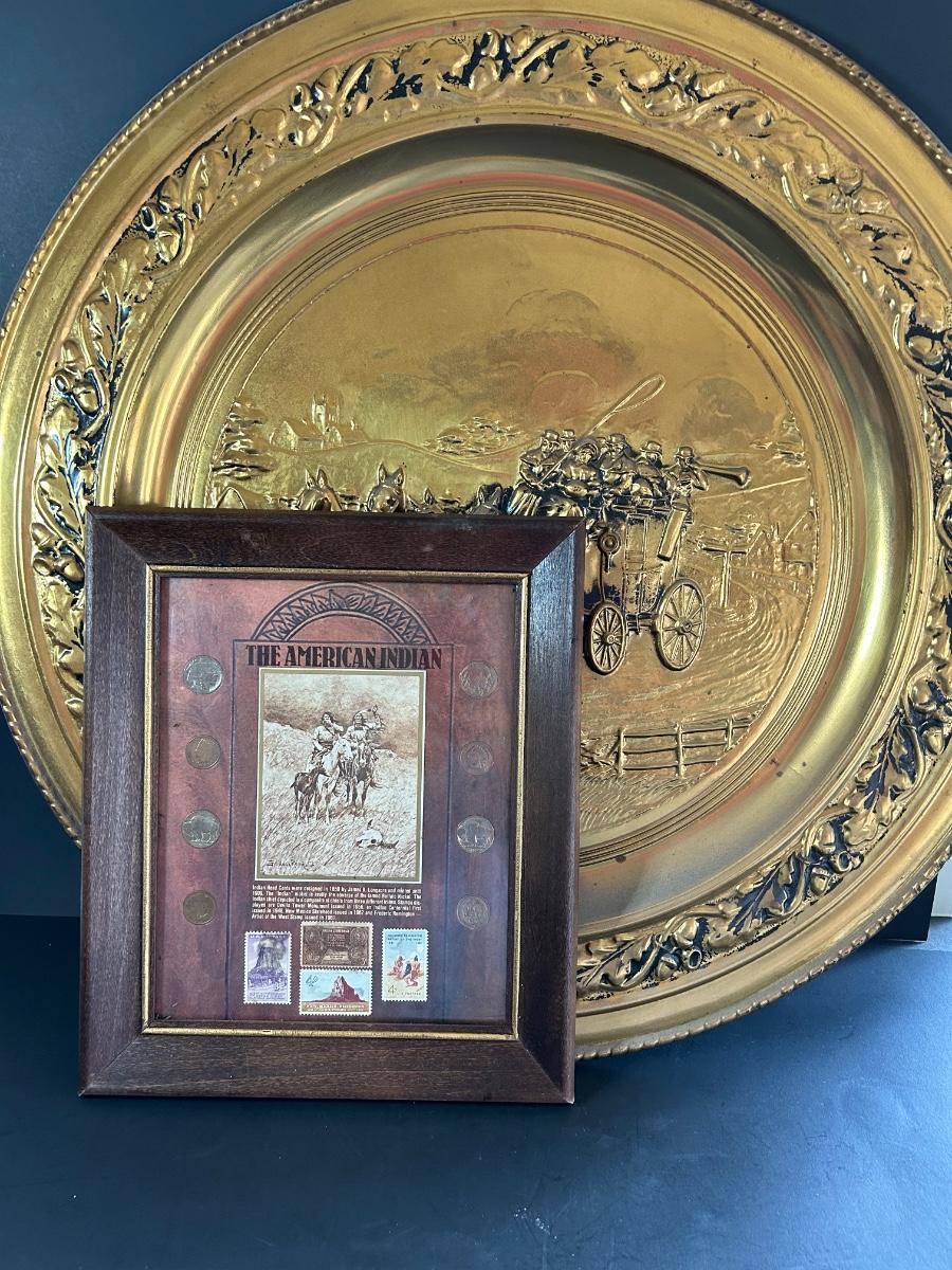 LOT 225: "The American Indian" Coin & Stamp Collection & Vintage Metal Embossed Stagecoach Wall Hanging