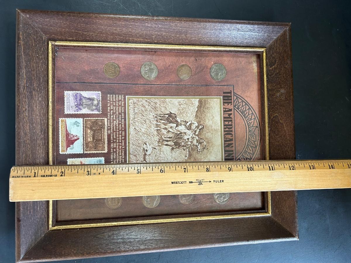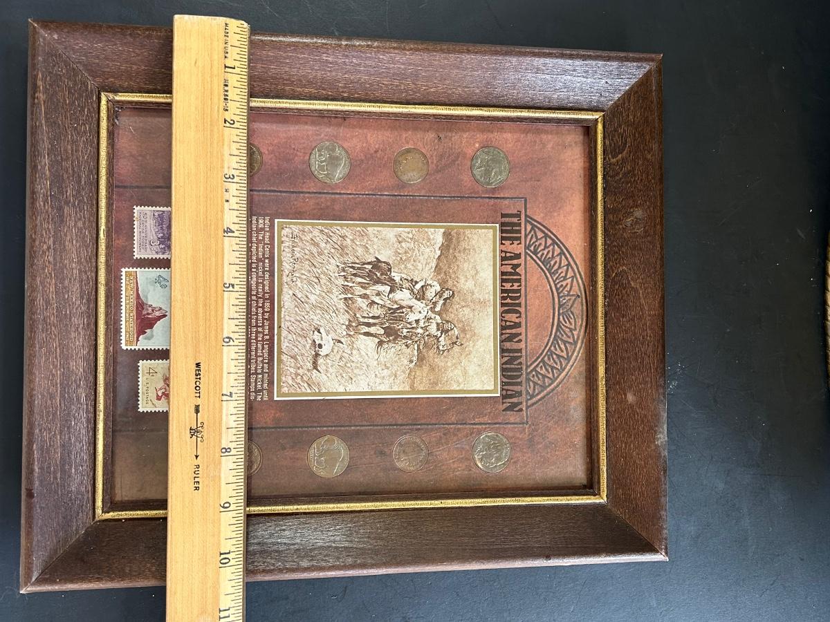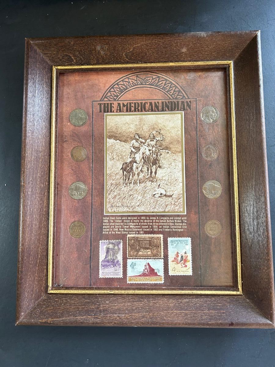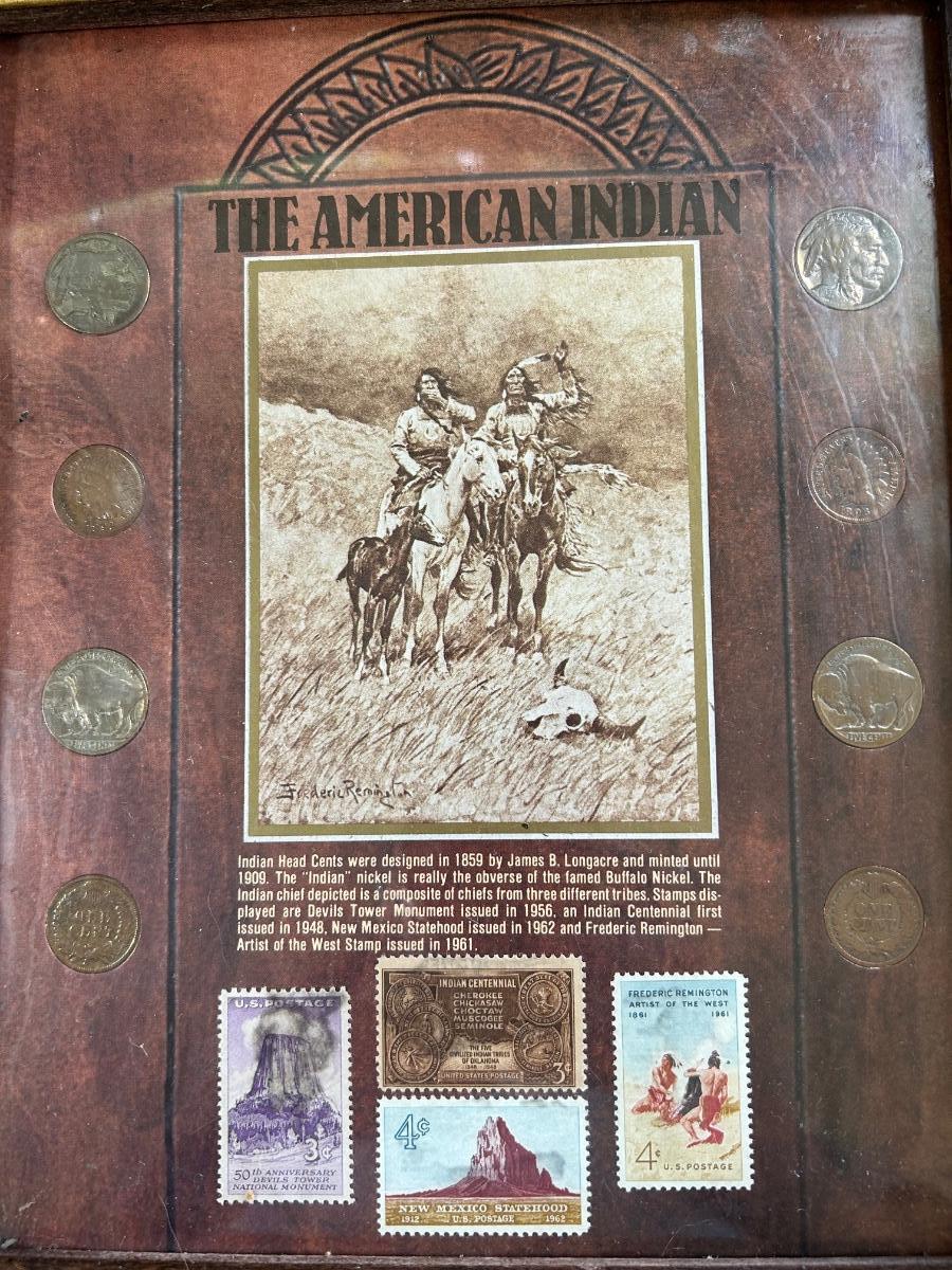 LOT 225: "The American Indian" Coin & Stamp Collection & Vintage Metal Embossed Stagecoach Wall Hanging