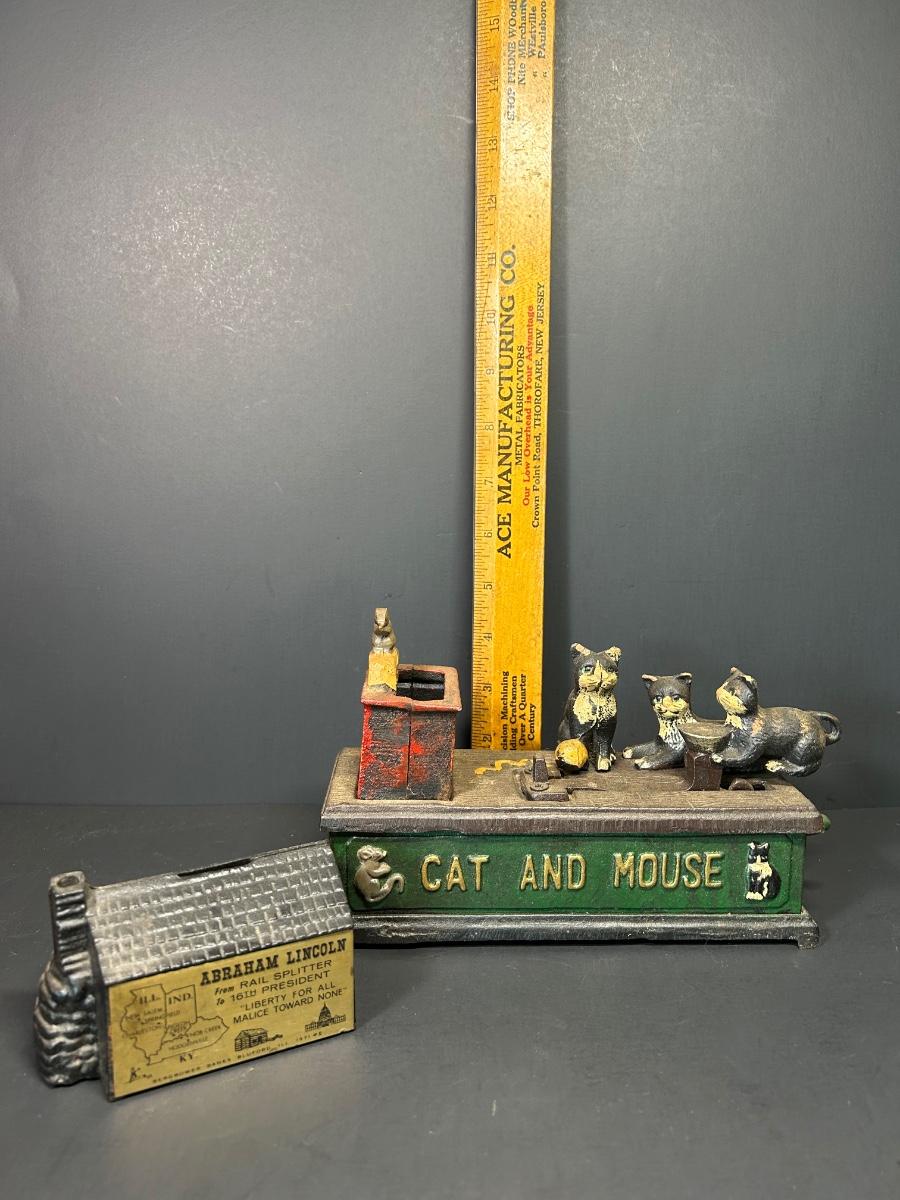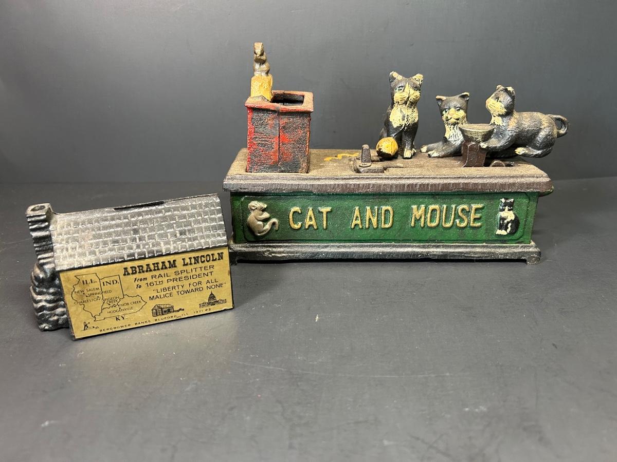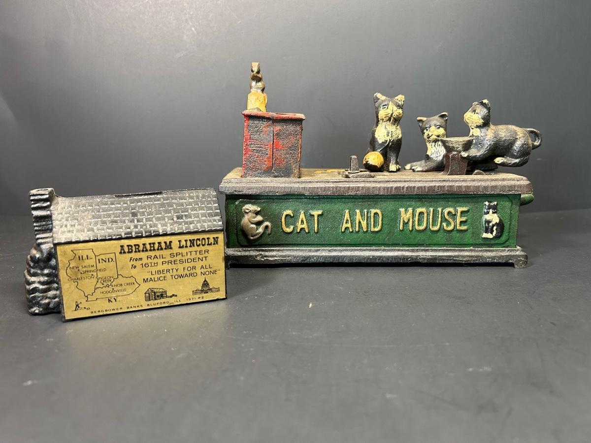 LOT 230/ 231: Cast Iron & Brass Abraham Lincoln Bank & Reproduction Cat & Mouse Bank