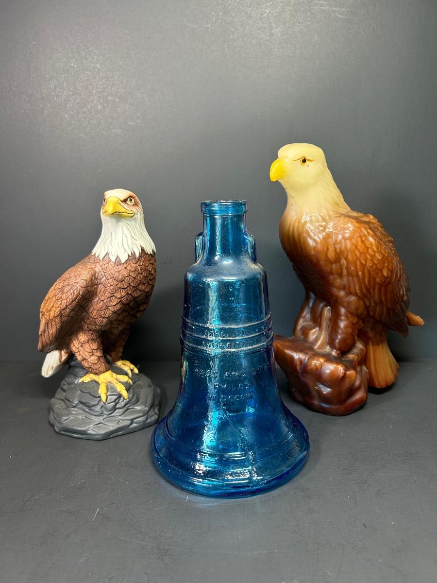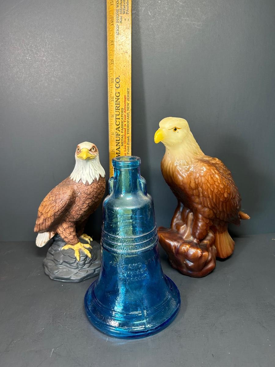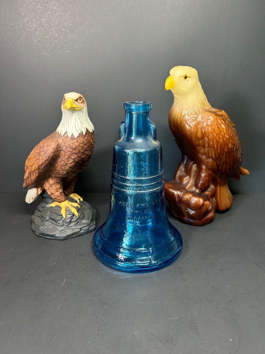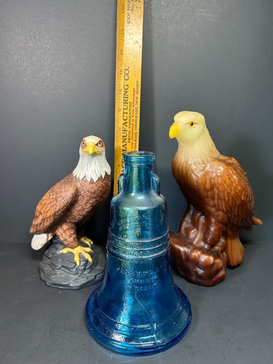 LOT 232: Blue Liberty Bell Decanter, Eagle Candle & Avon Pride of America Ceramic Eagle