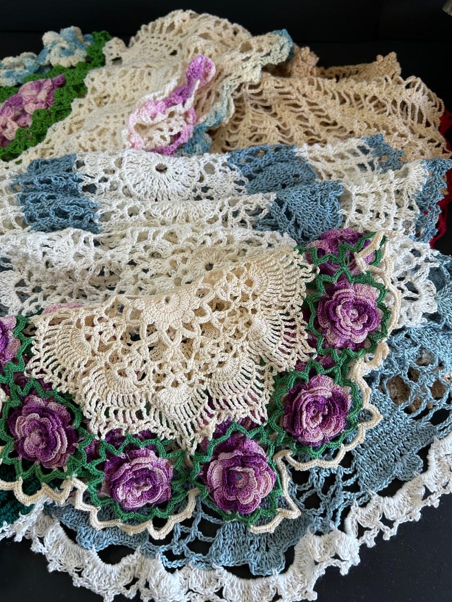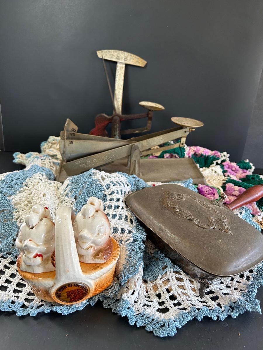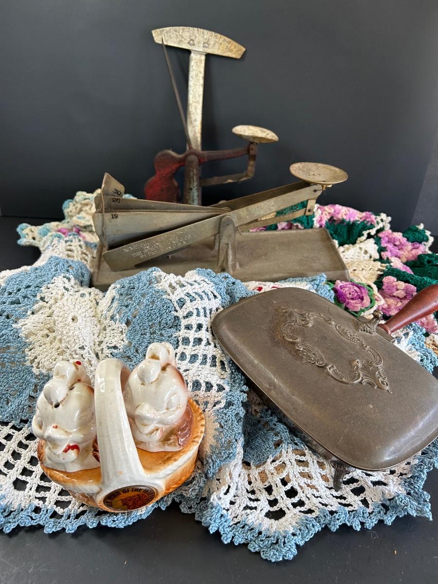 LOT 238: Vintage Egg Weighers, Chicken Salt n Pepper, Crocheted Doilies & Crumb Catcher