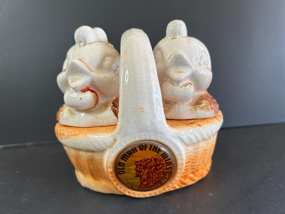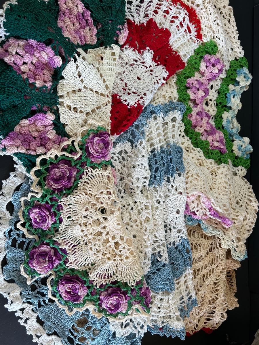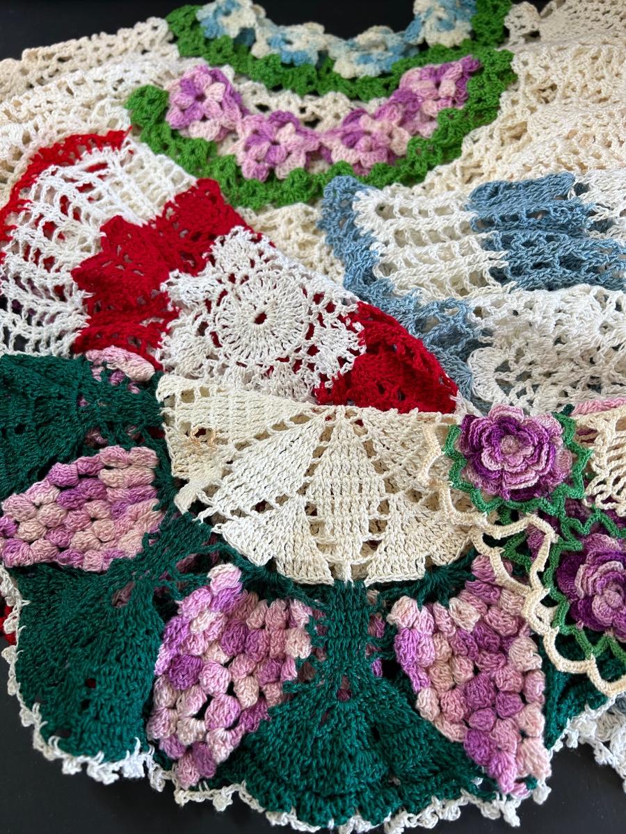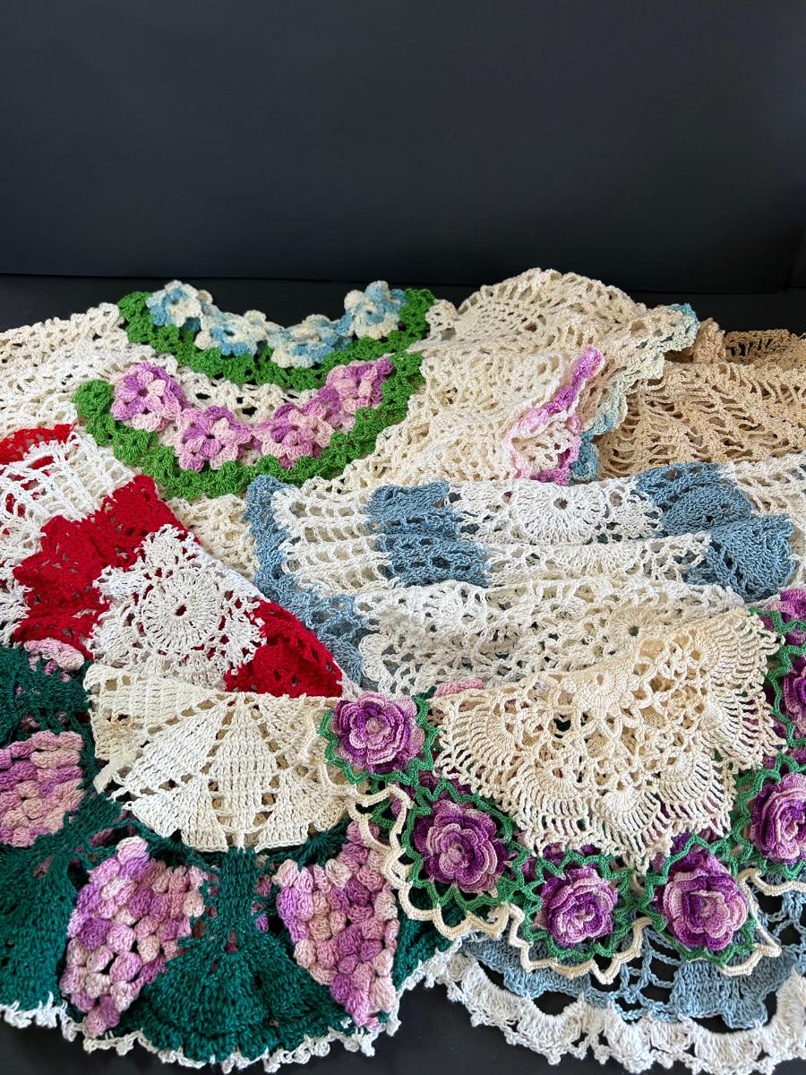 LOT 238: Vintage Egg Weighers, Chicken Salt n Pepper, Crocheted Doilies & Crumb Catcher