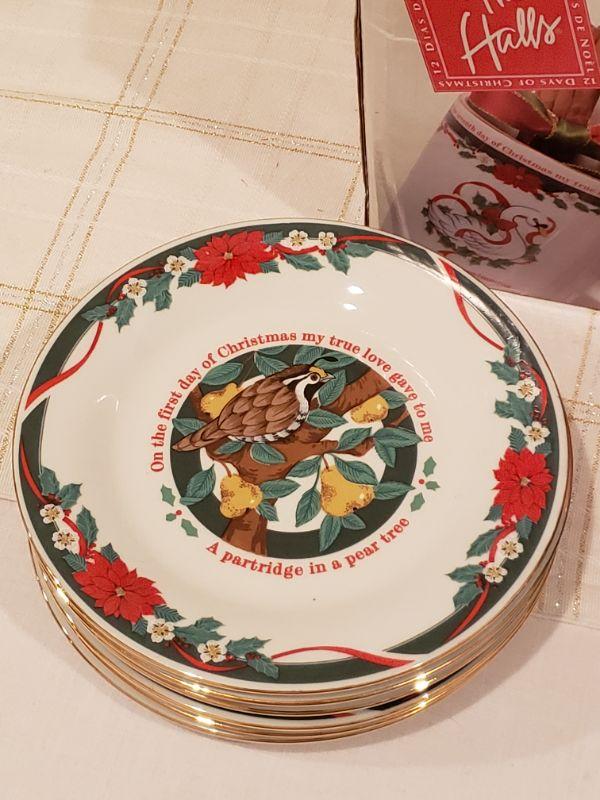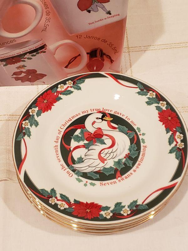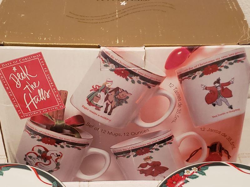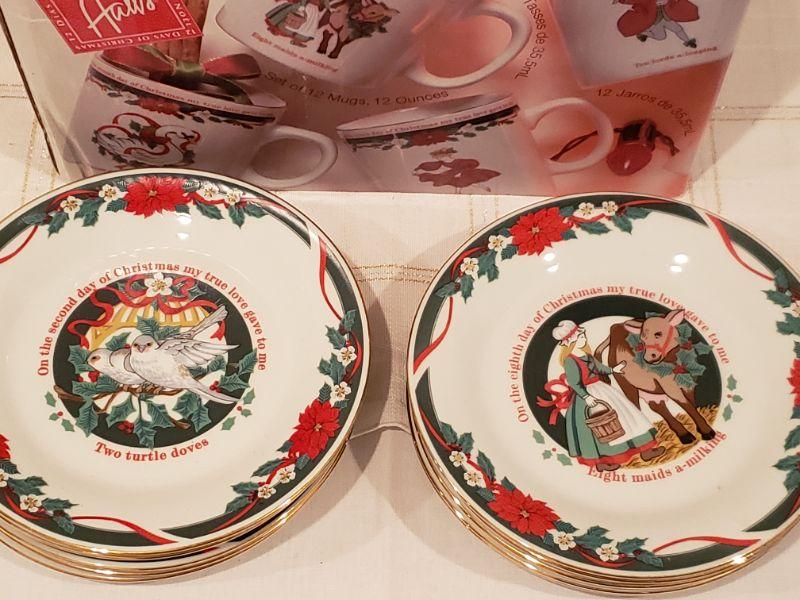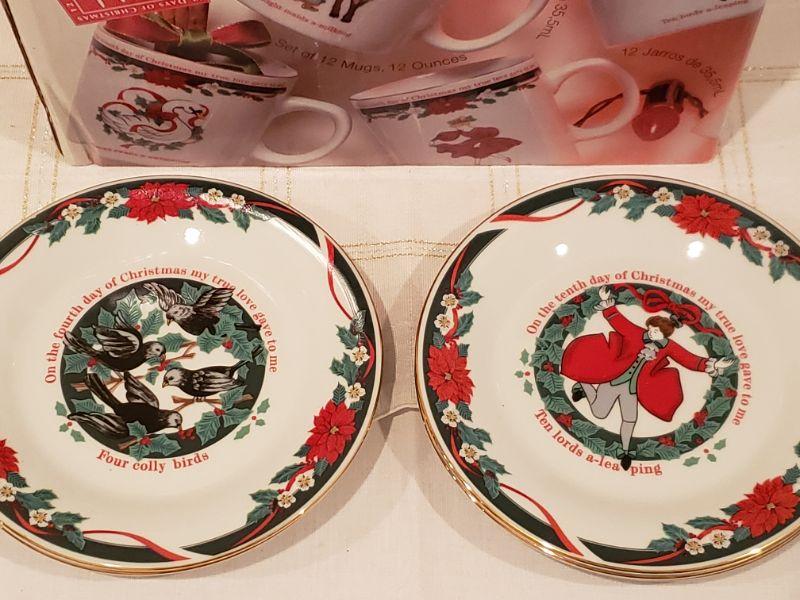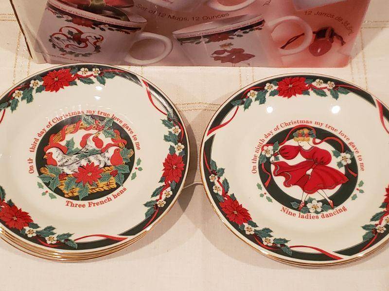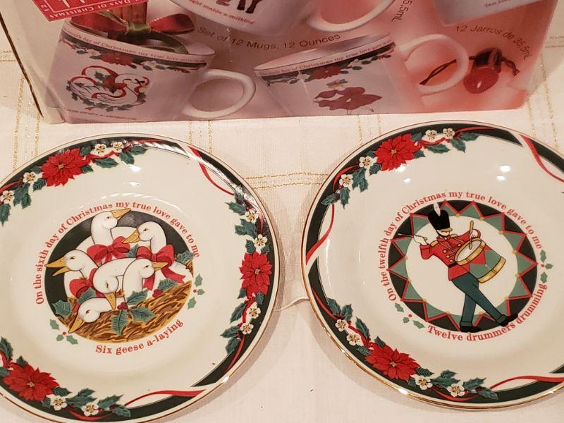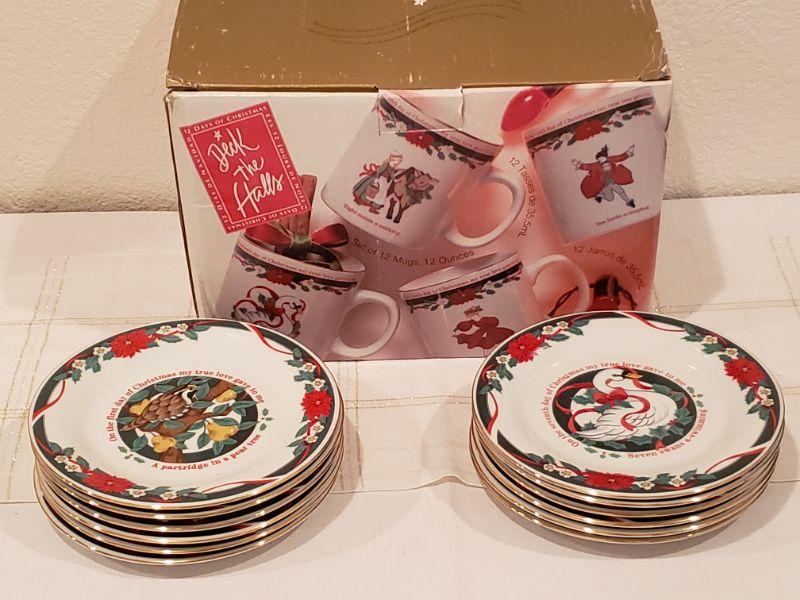 Lot 914: New/Old Stock 12 Days of Christmas Mugs and Dessert Plates- Complete Set of Both