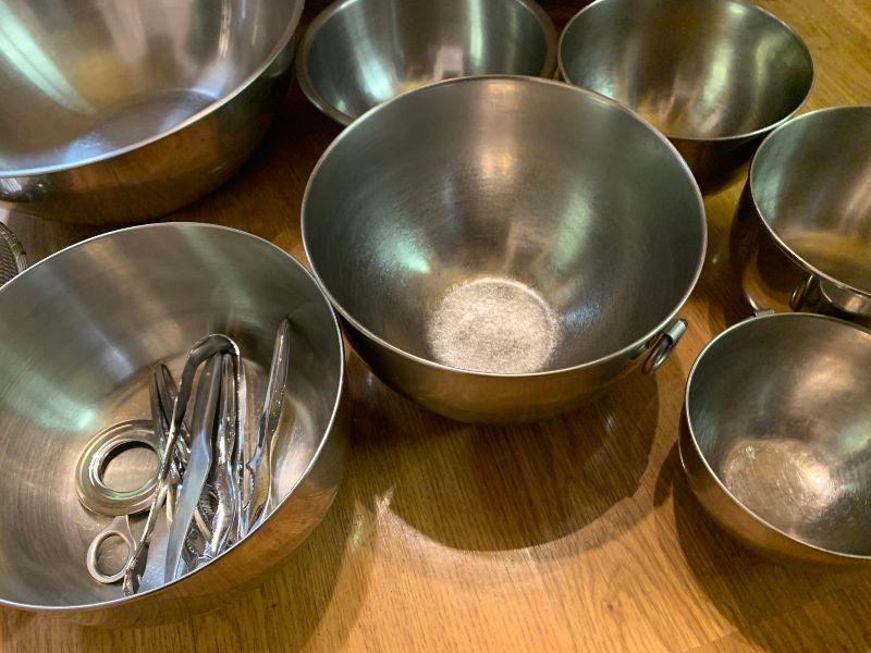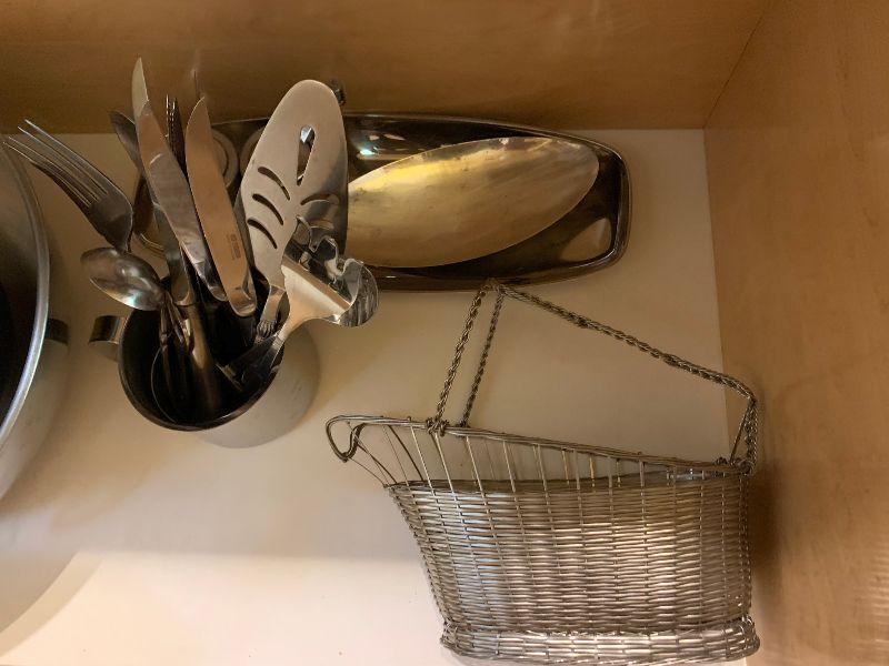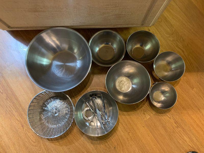 Metal Ware 7 mixing bowls, 2 metal baskets, 2 sets of serving utensils, 6 steak knives - Viking and more. 31 items total