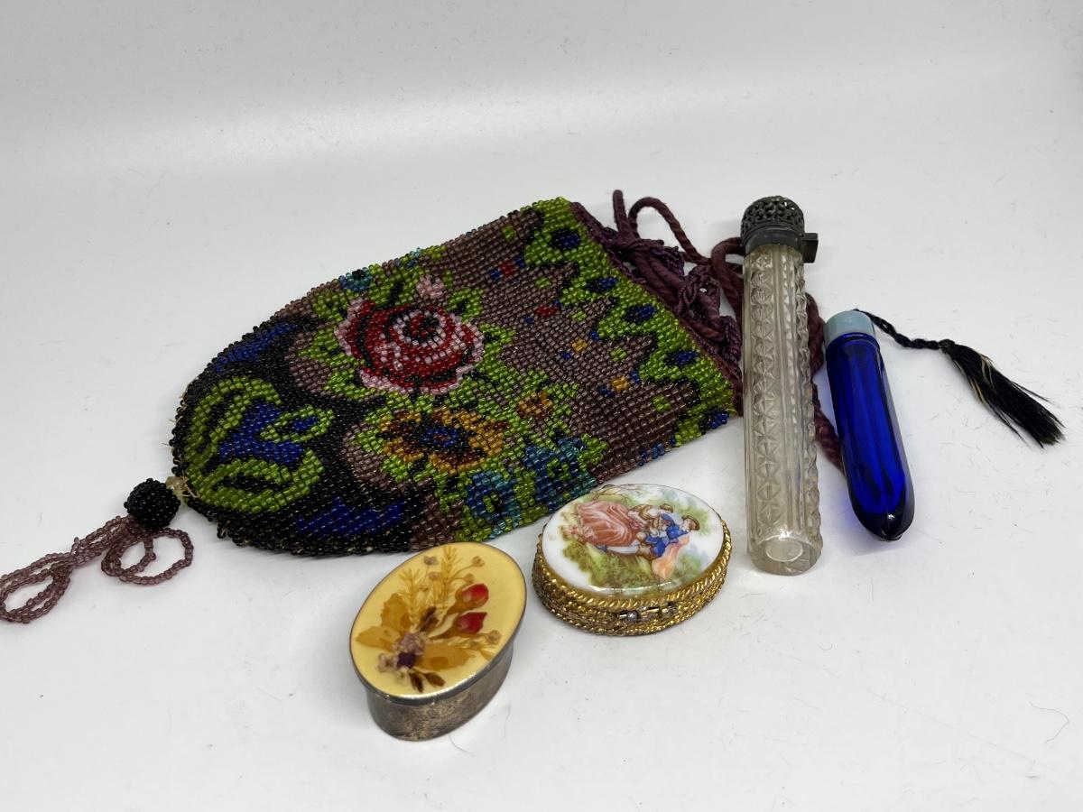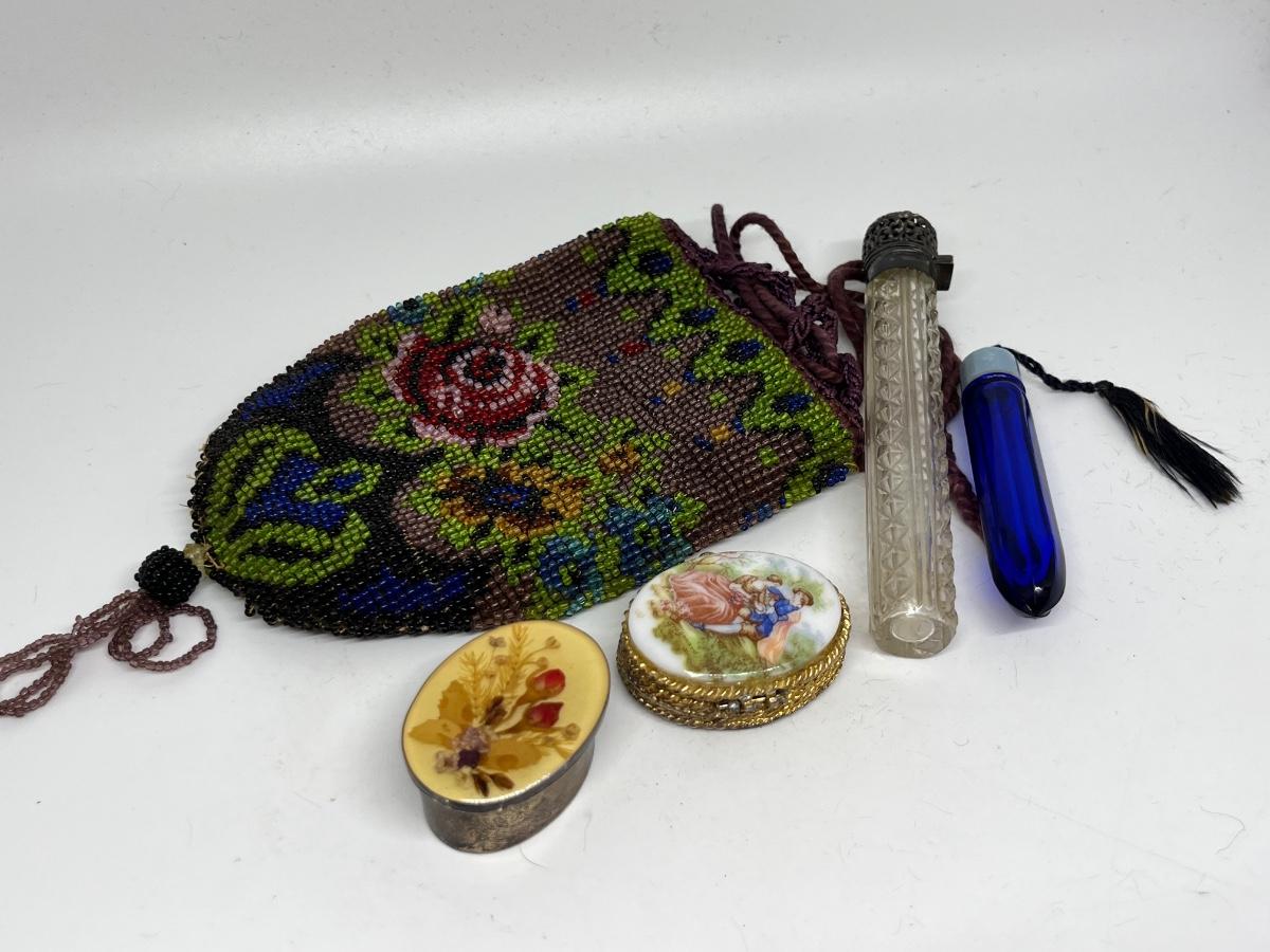 LOT 149: Vintage Beaded Purse, Sterling Pill Box, Perfume Bottles + More