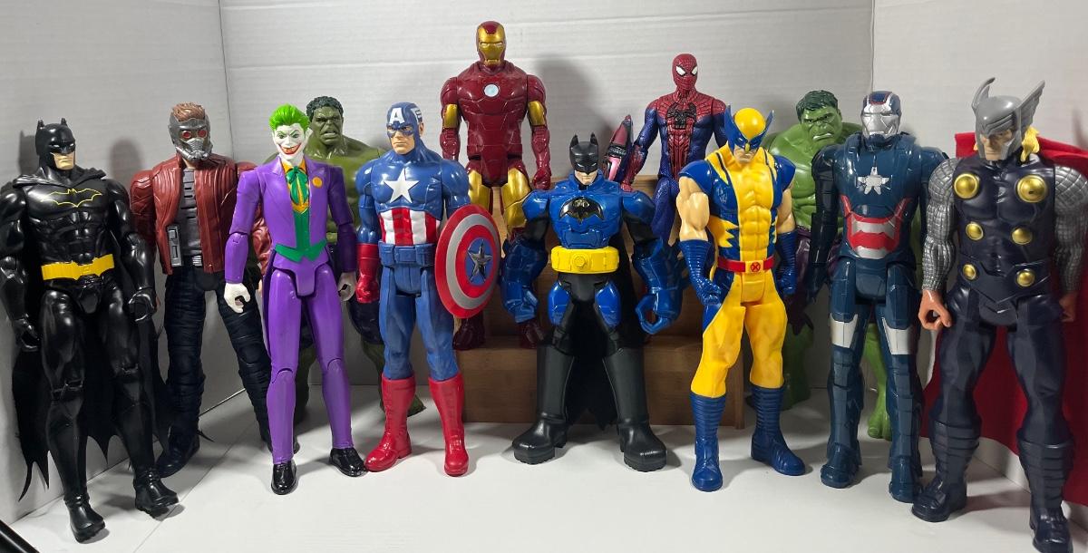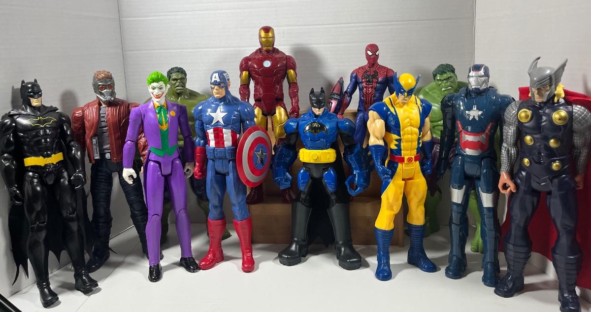 LOT 304: Collection of 12 inch Action Figures - Marvel, DC , Talking Hulk, Hulkbuster, Spider-Man, Batman, and More