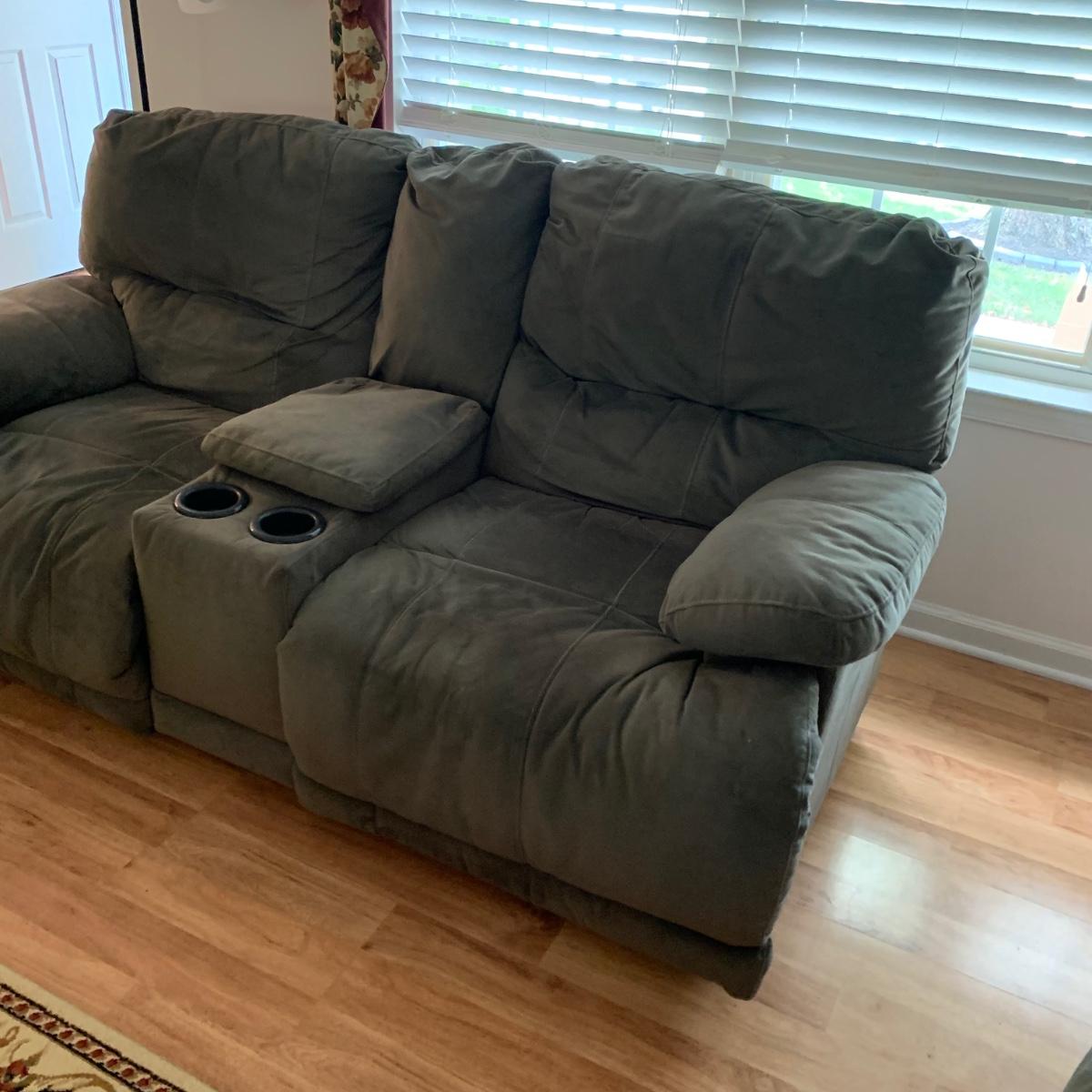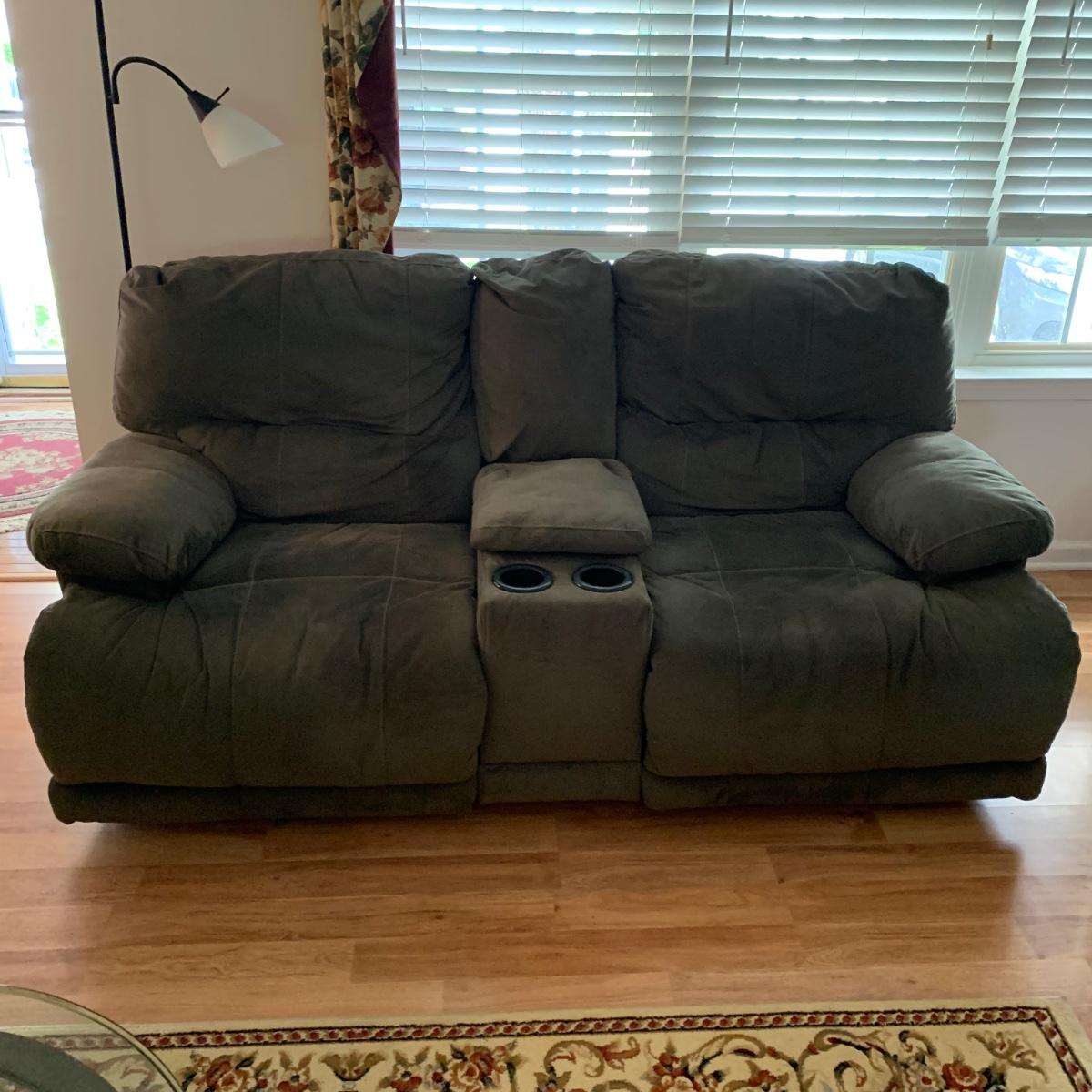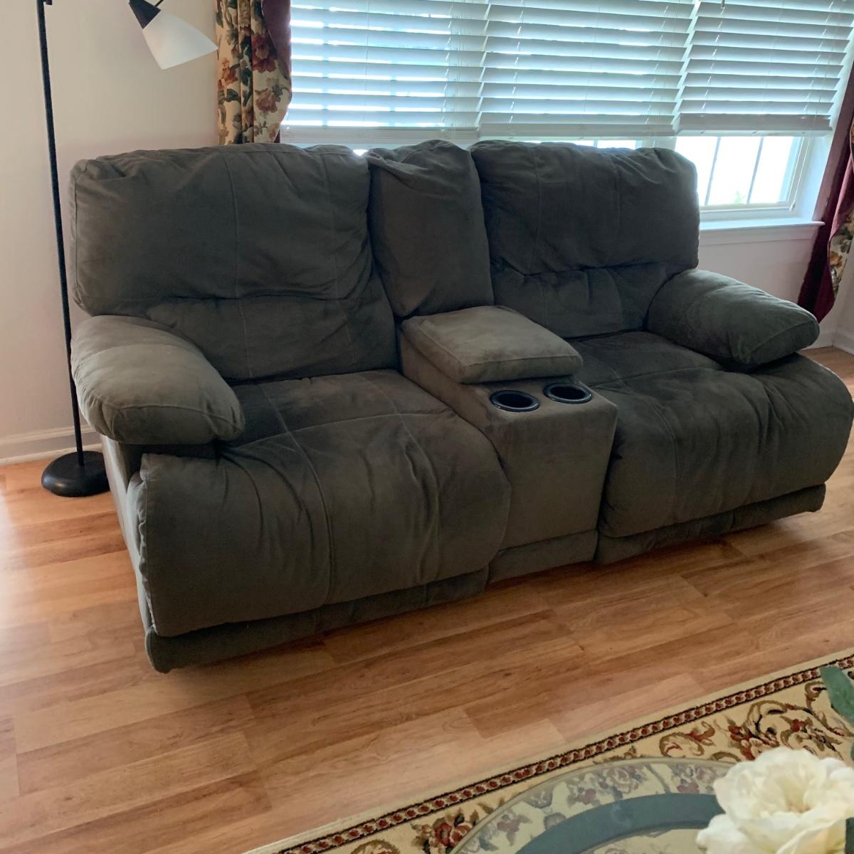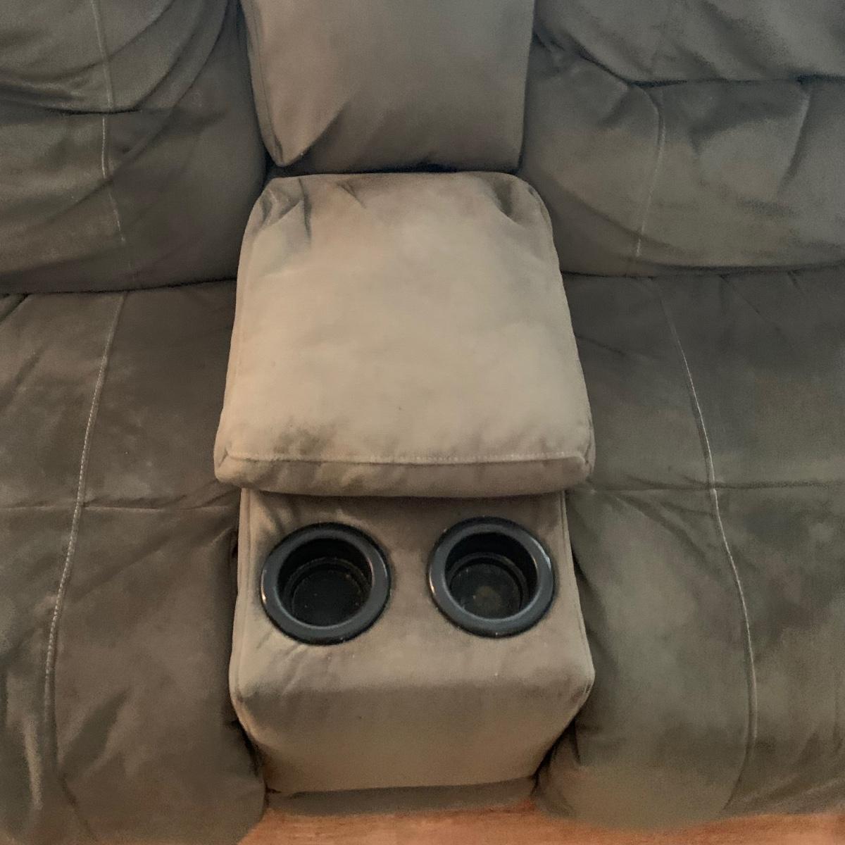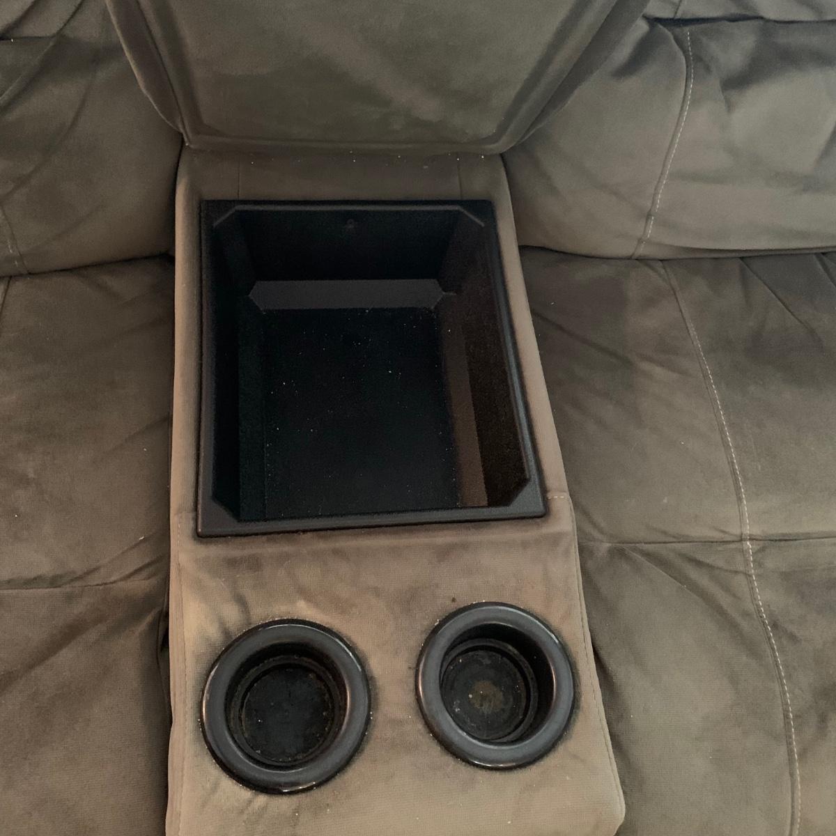 LOT 47R: Grey Reclining Love Seat w/Center Storage & Cup Holders