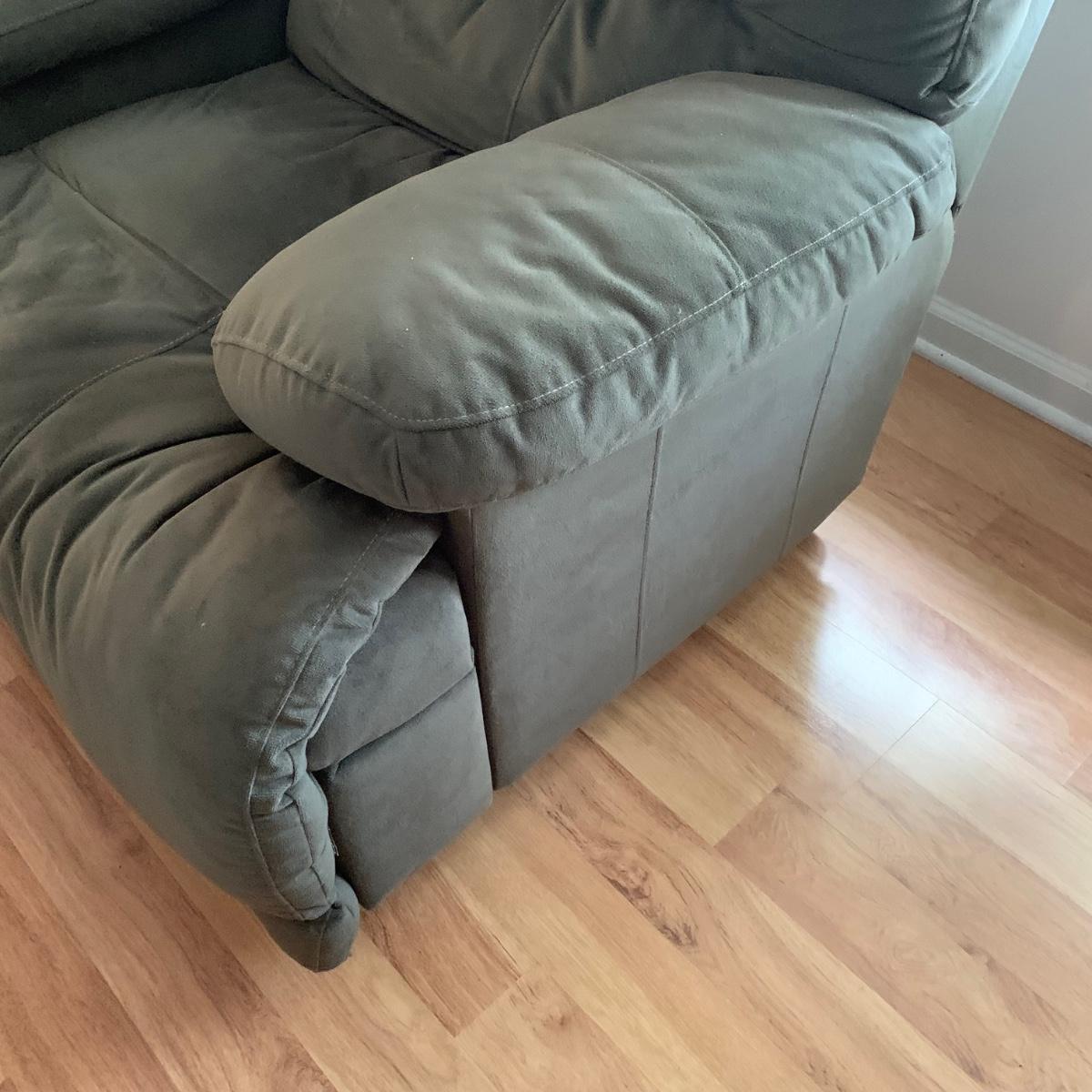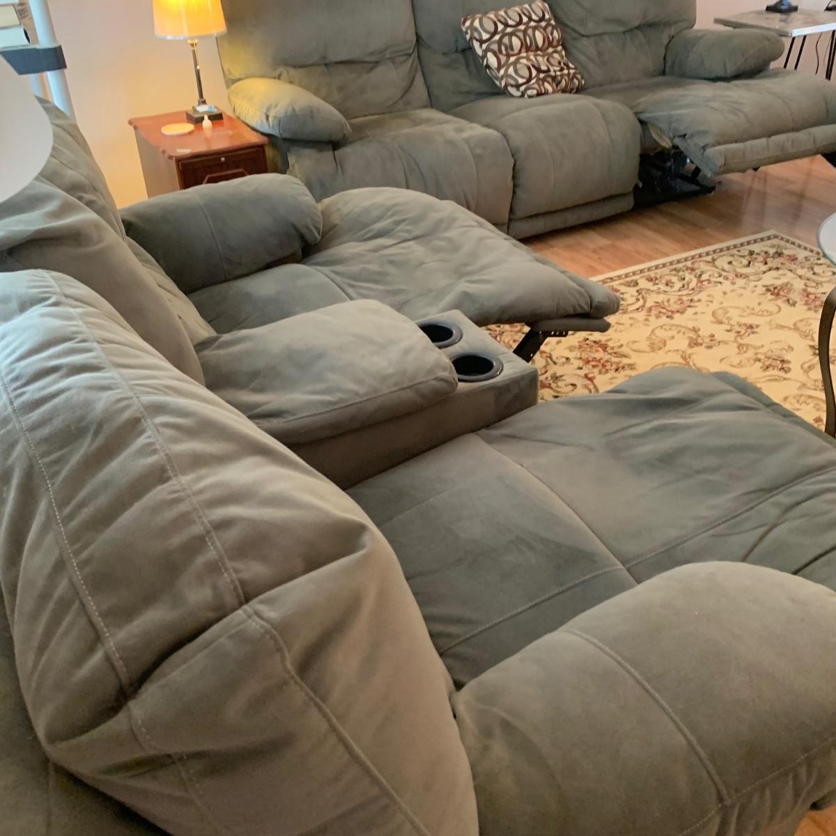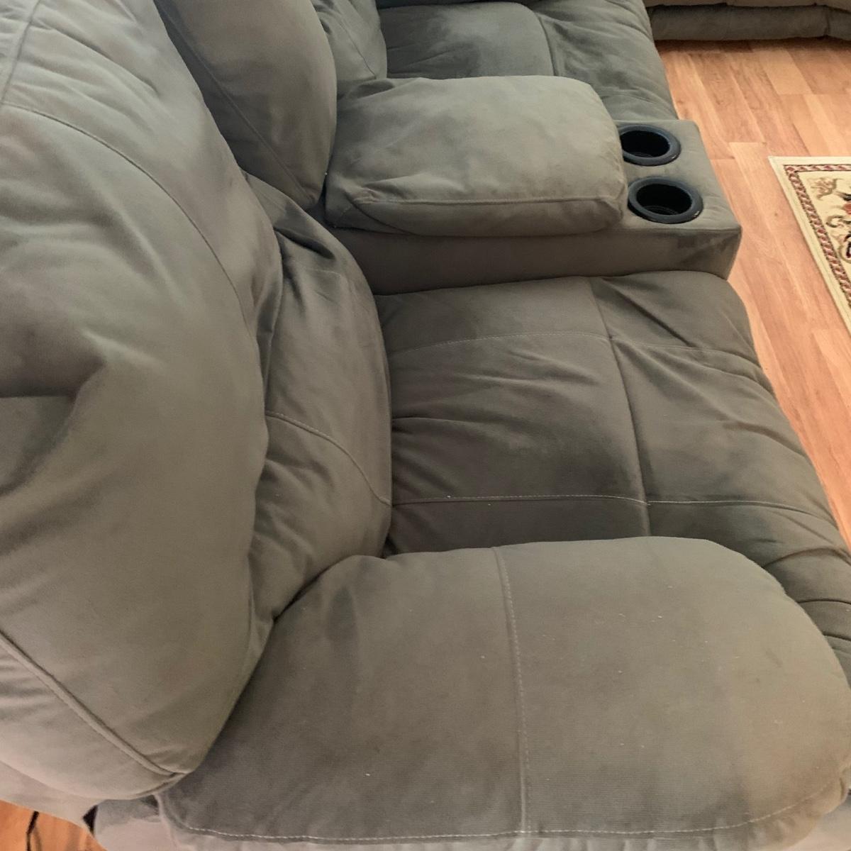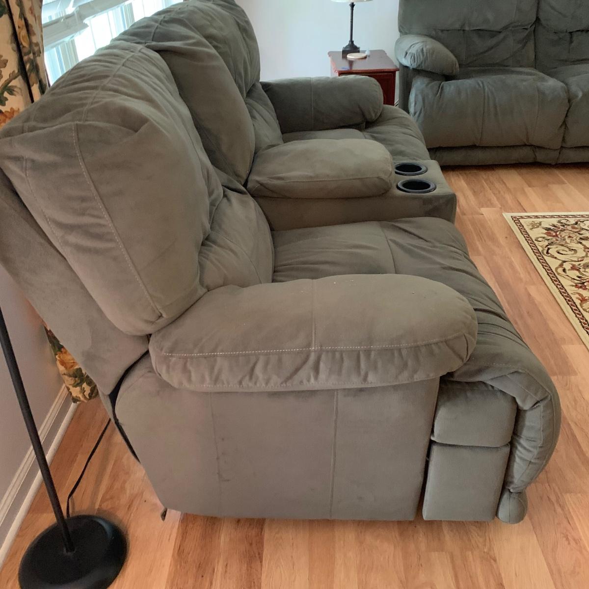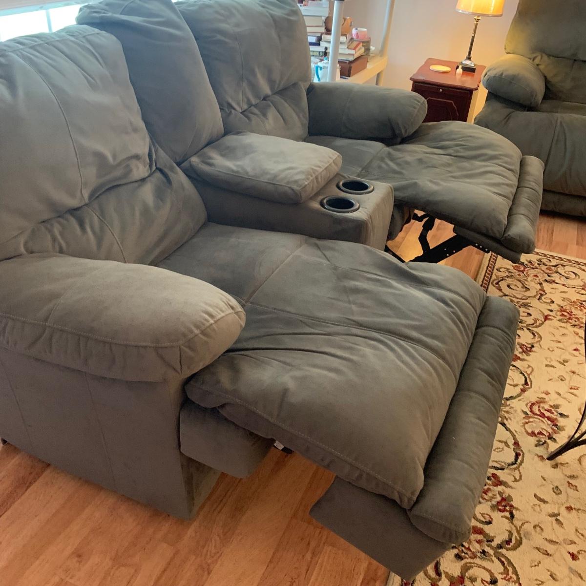 LOT 47R: Grey Reclining Love Seat w/Center Storage & Cup Holders