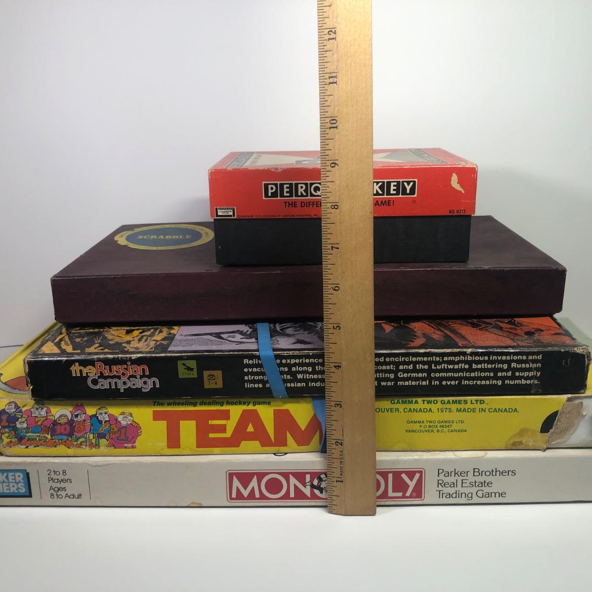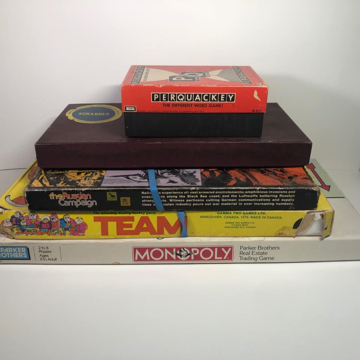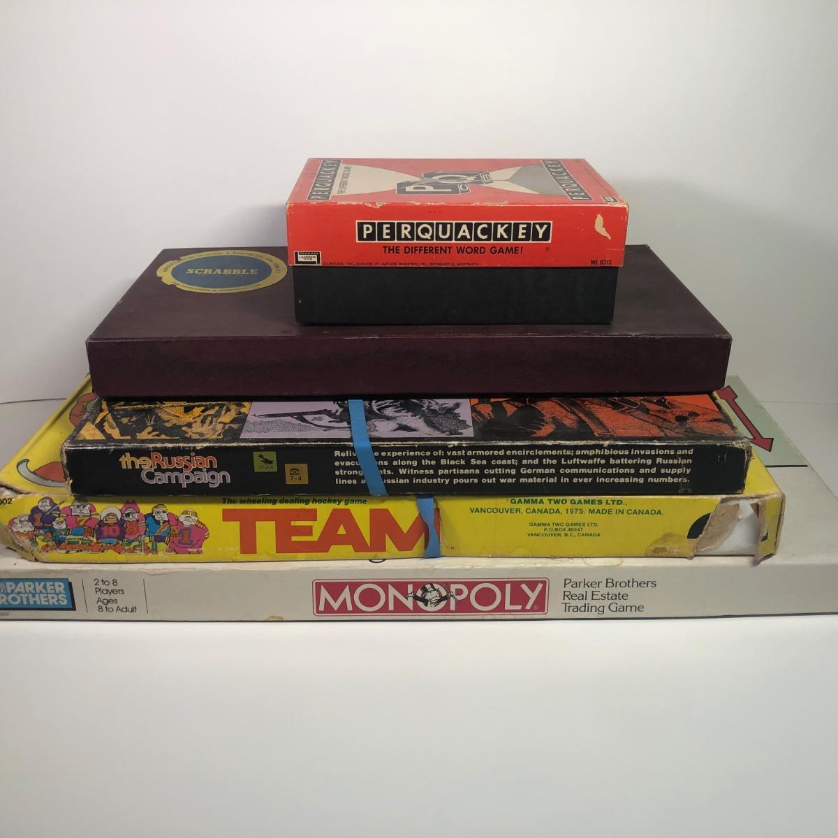 LOT 56M: Board Games - Monopoly, The Russian Campaign, Team, Scrabble & Perquackey