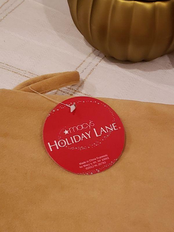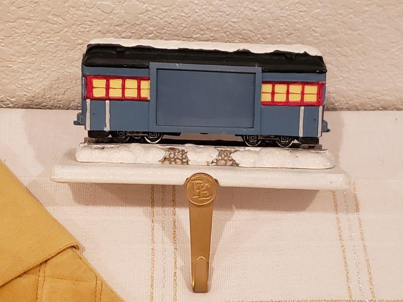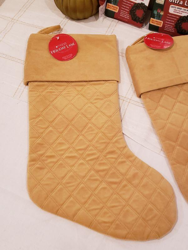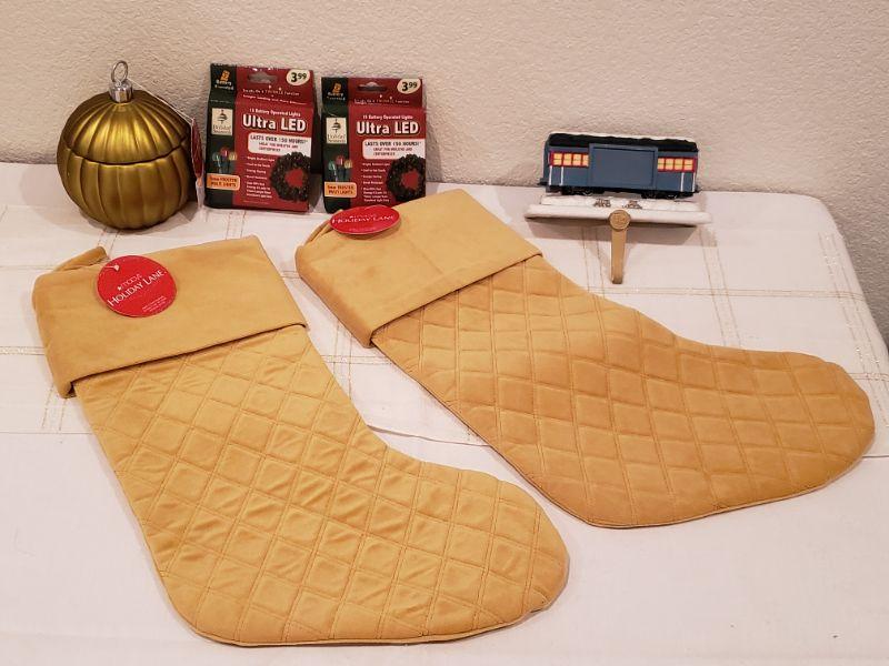 Lot 917: New Macy's Stockings, Polar Express Stocking Hanger, LED Wreath Lights and Candle