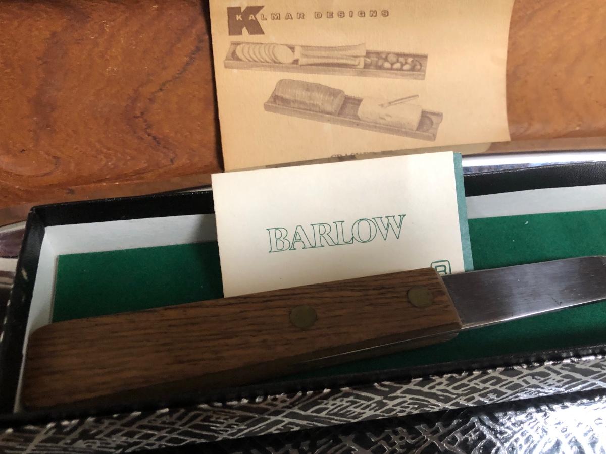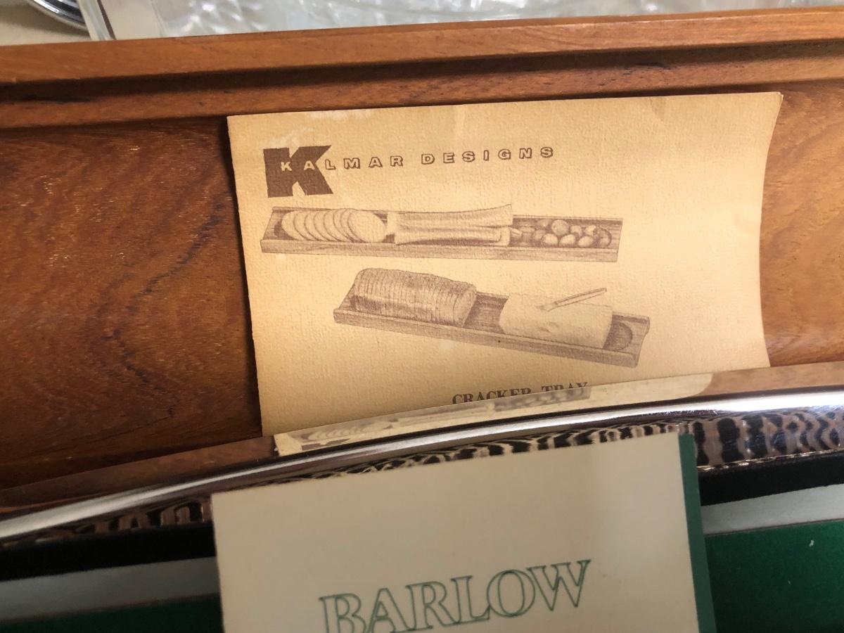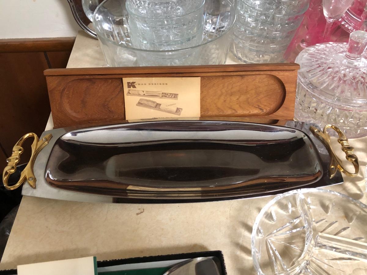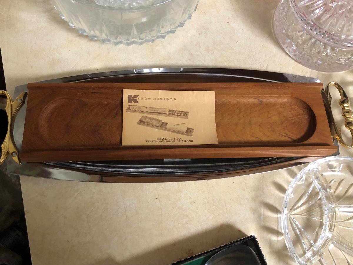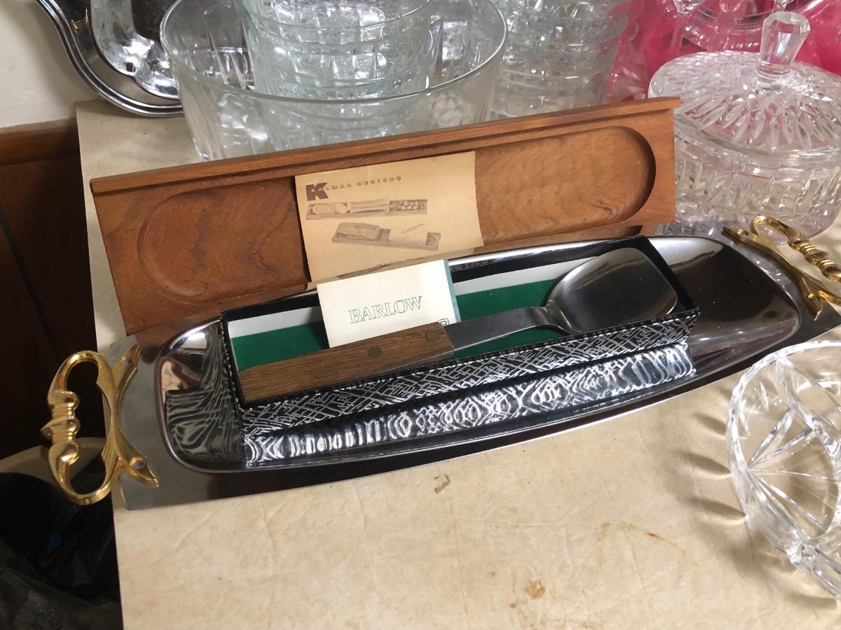 LOT 7M: Barlow Knife, Kalman Designs Teakwood Cracker Tray, Crystal, Tulle Stemware, Platters & More
