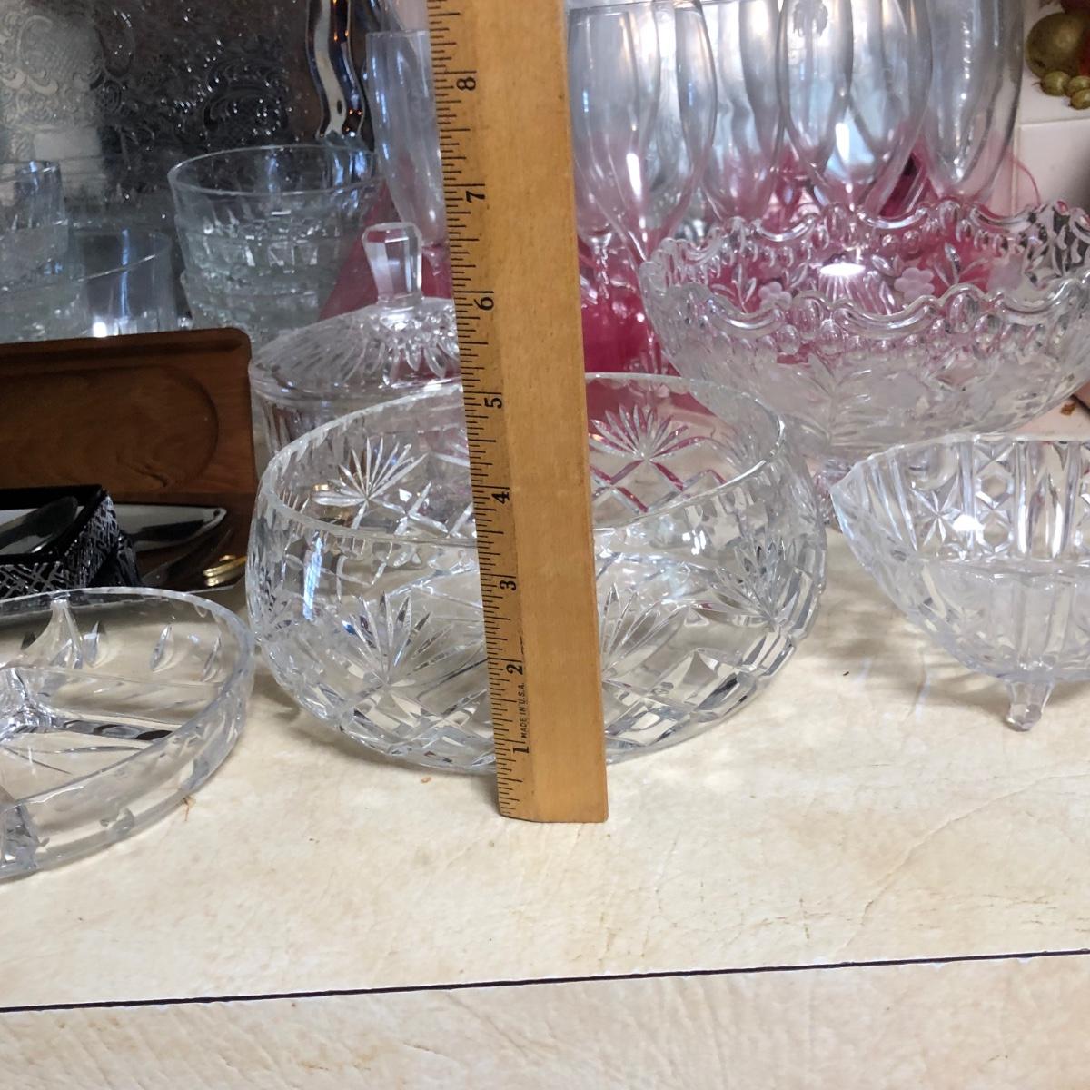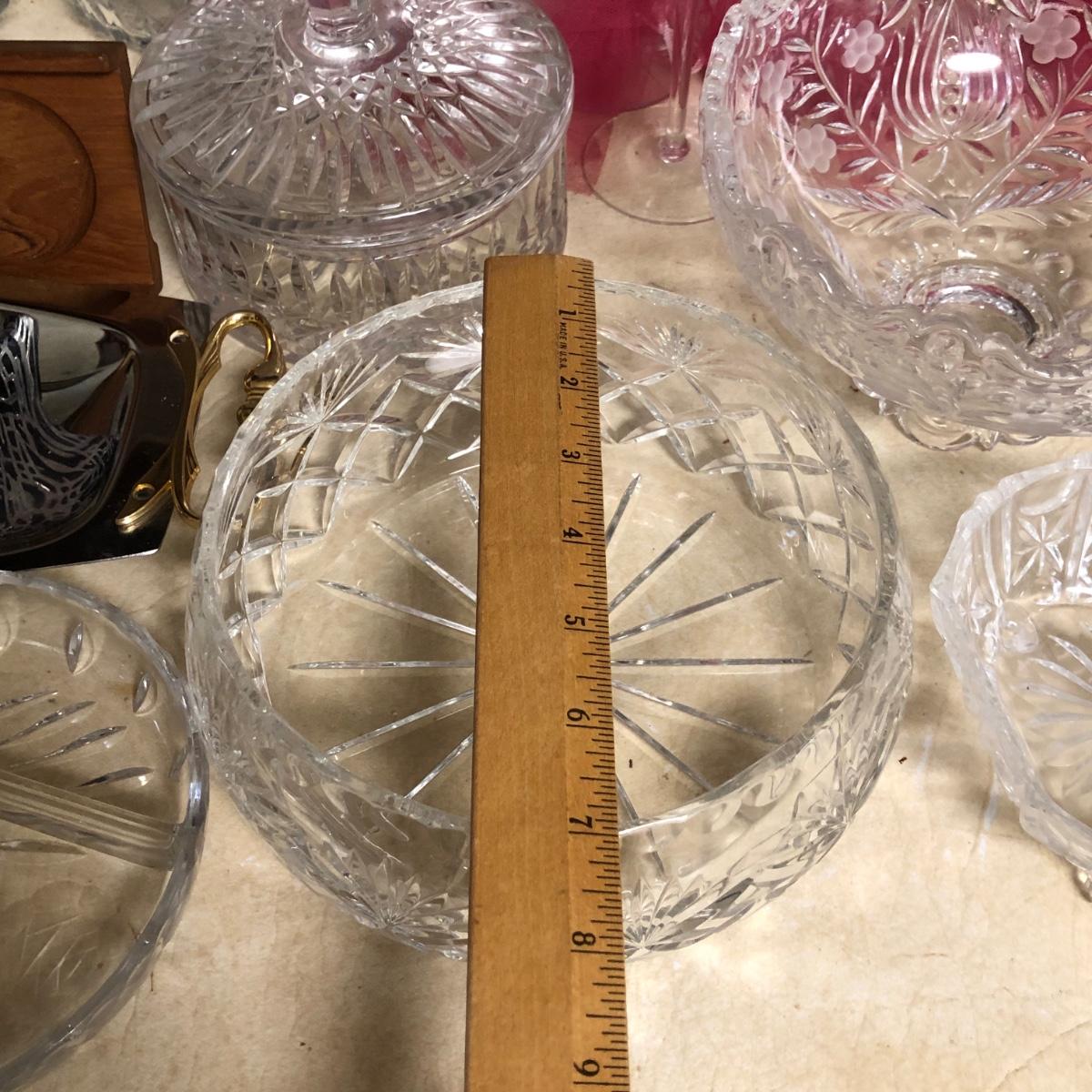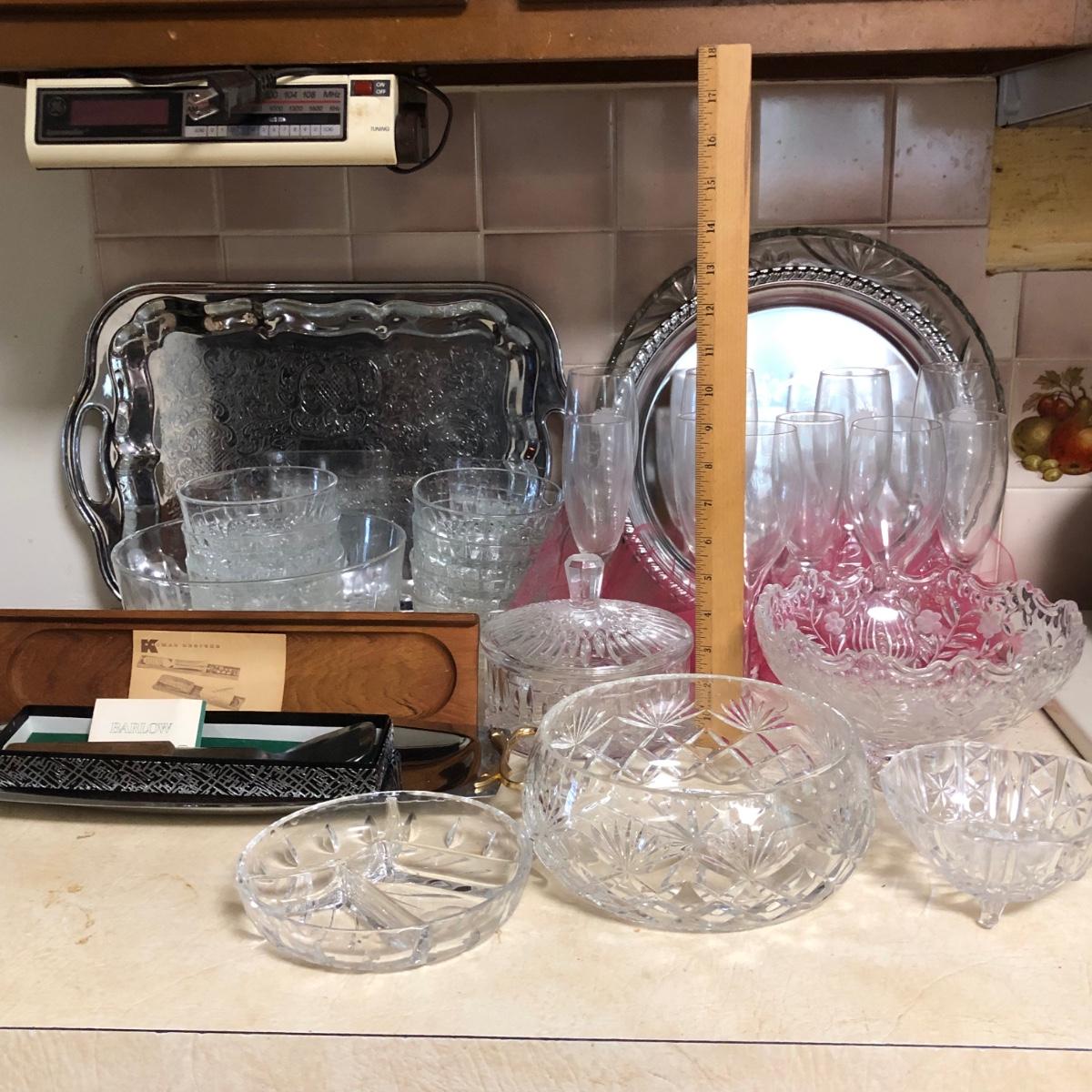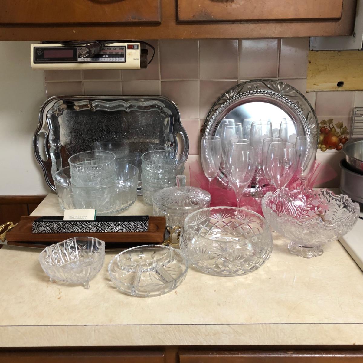 LOT 7M: Barlow Knife, Kalman Designs Teakwood Cracker Tray, Crystal, Tulle Stemware, Platters & More