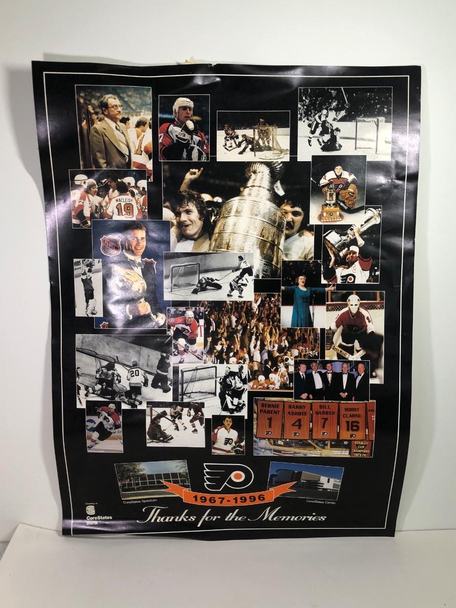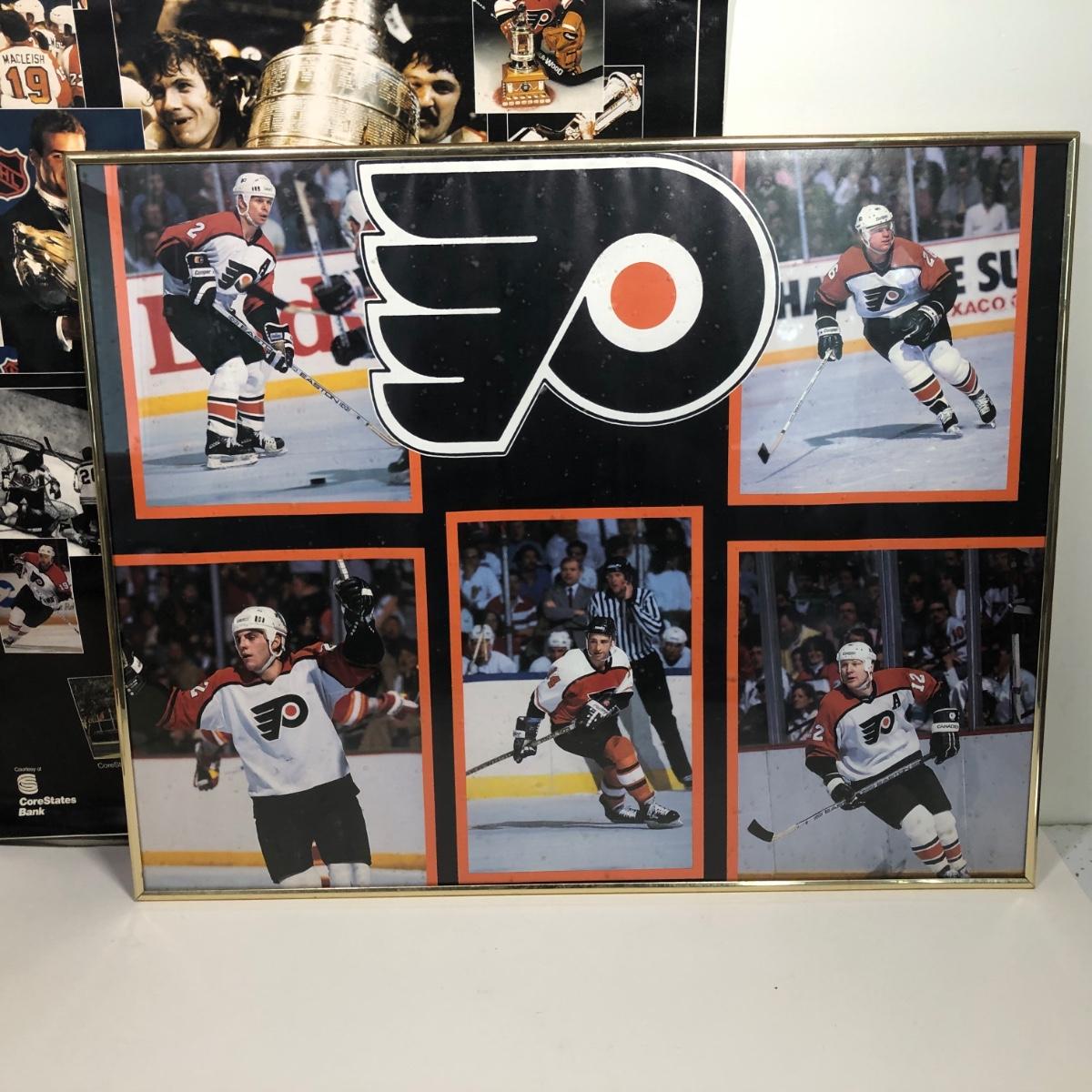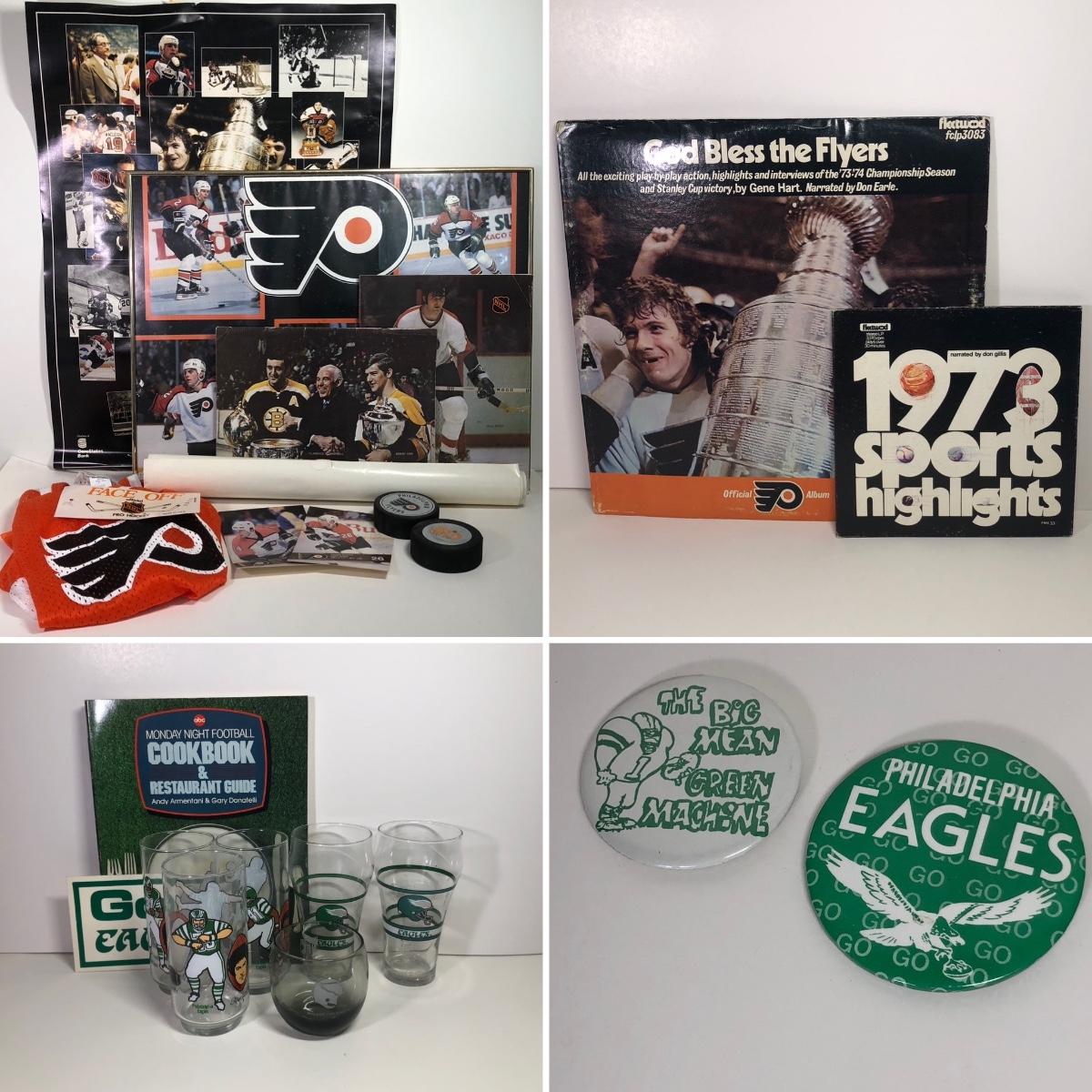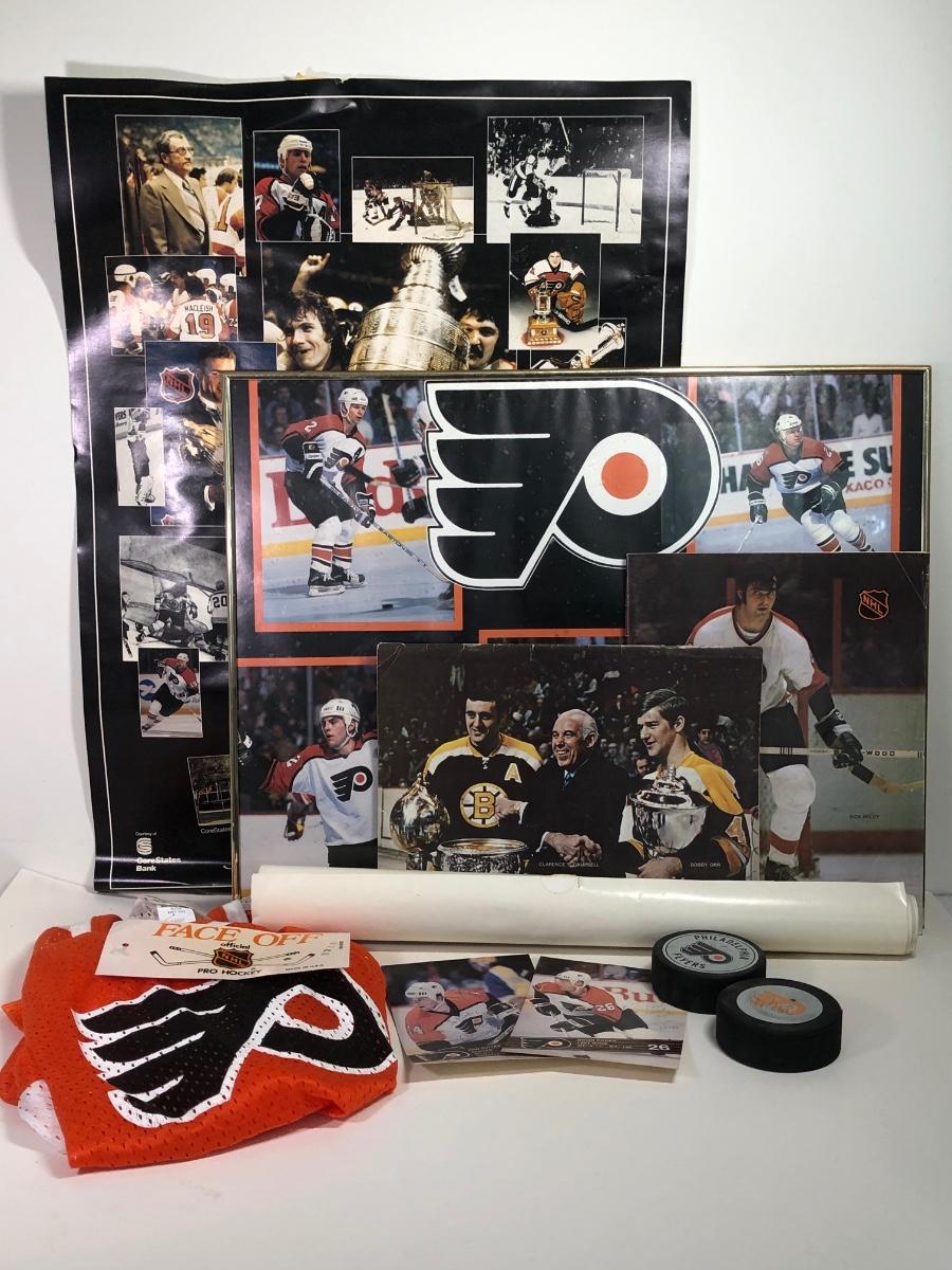 LOT 17M: Philly Sports Collection - Flyers Posters, Child's Jersey, Hockey Pucks & More / Eagles Glasses, Buttons & More