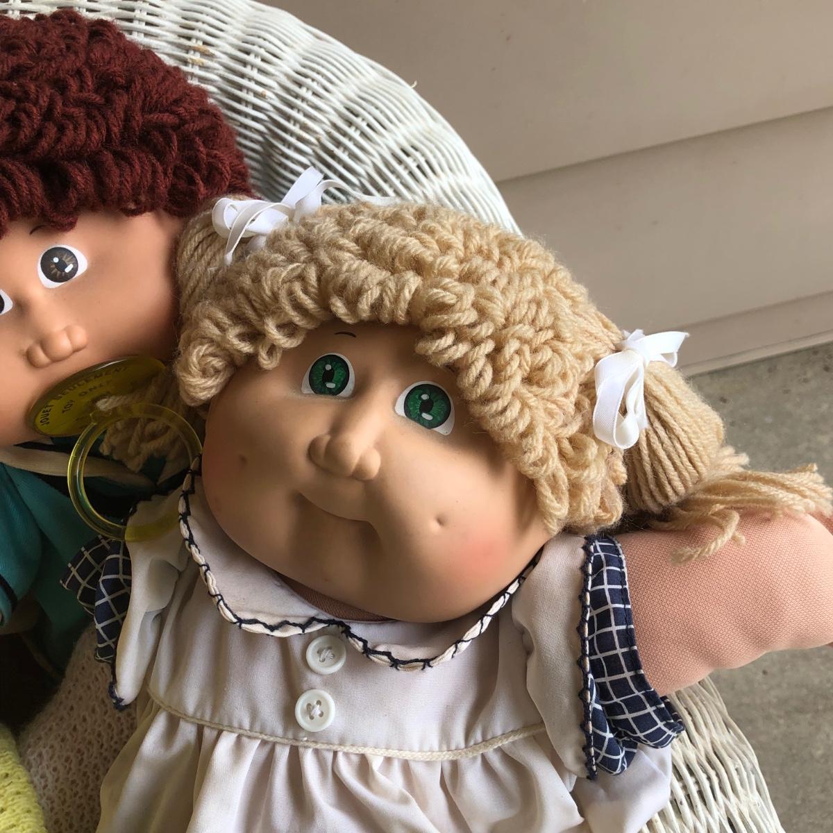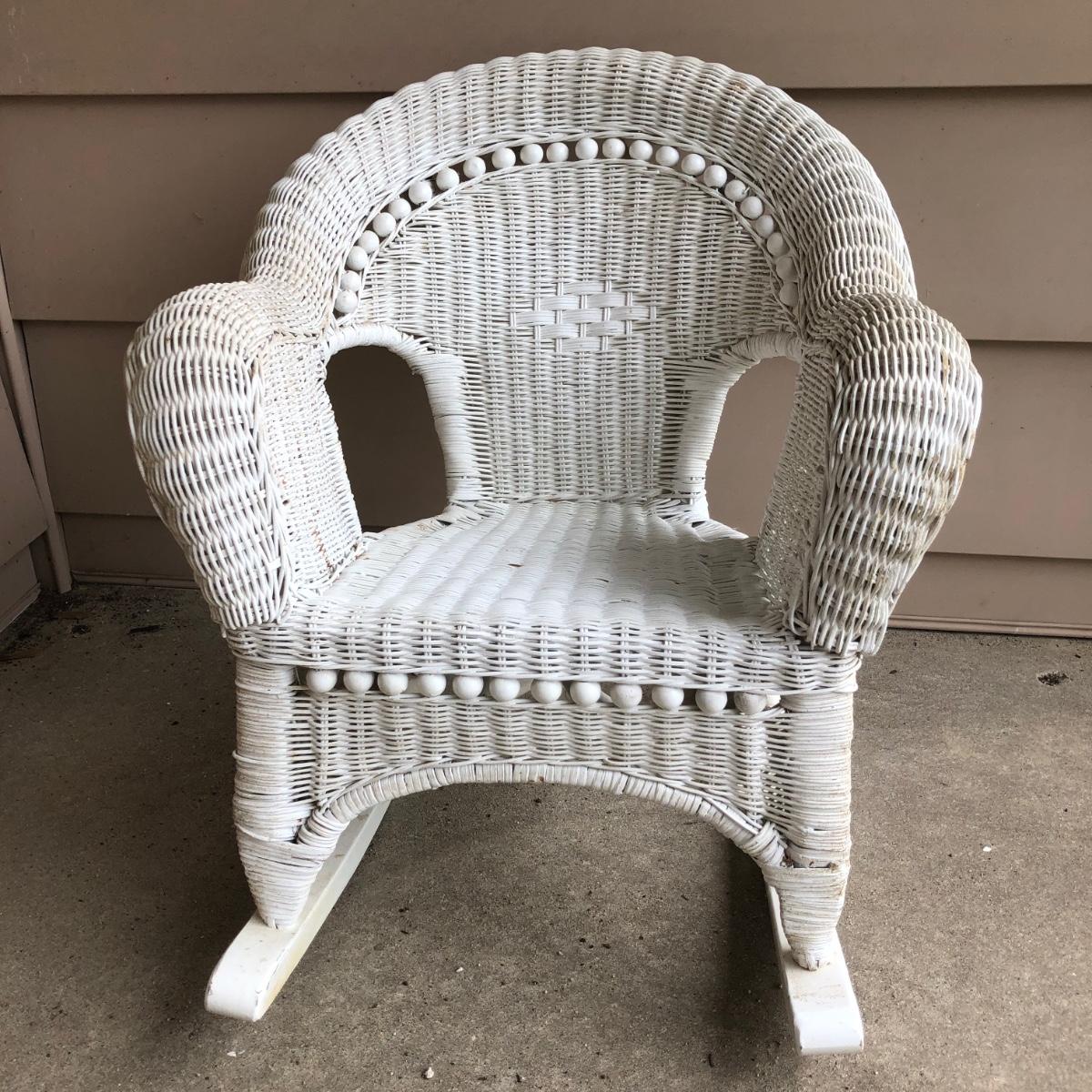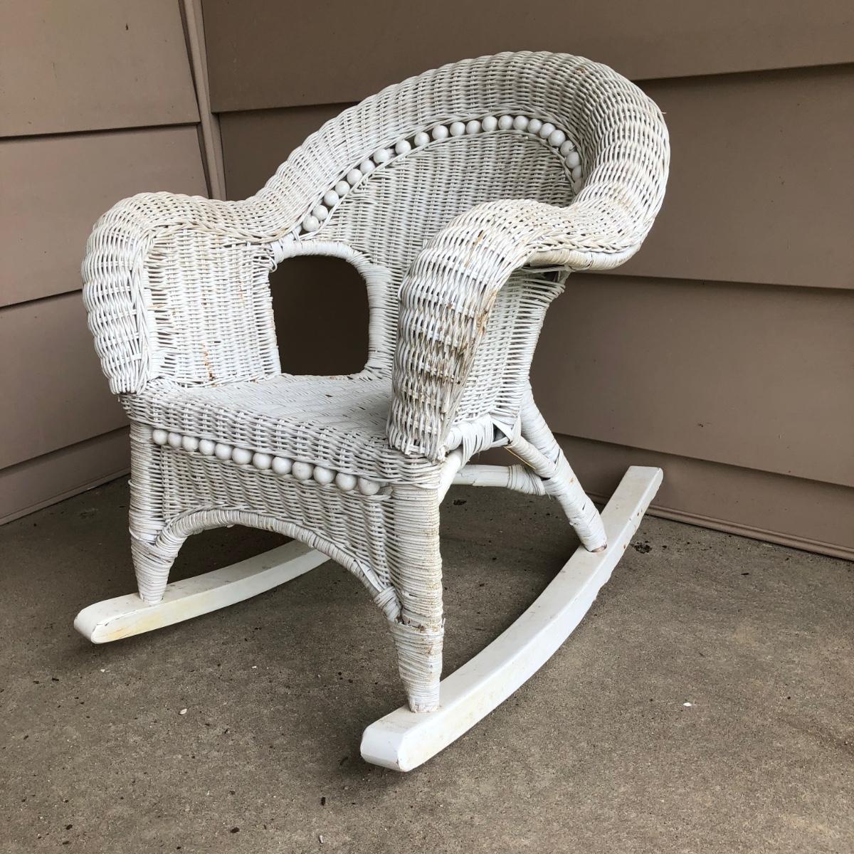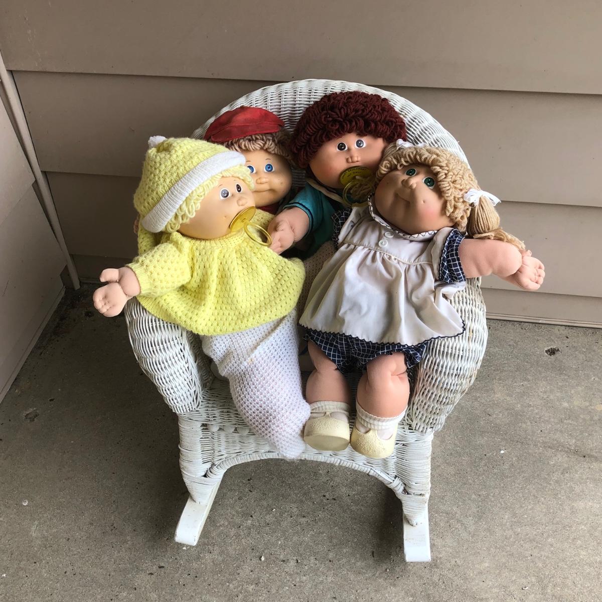 LOT 22M: Child's Wicker Rocking Chair & Four Cabbage Patch Kids Dolls
