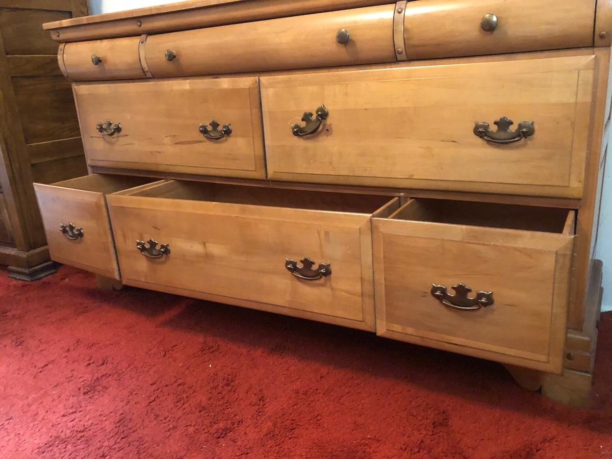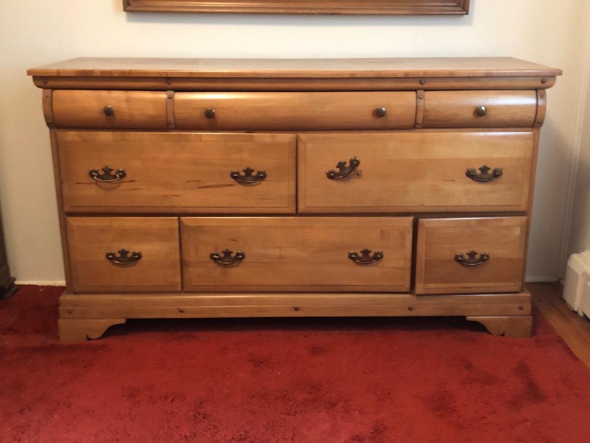 Mirror measures 45 x 33 inches and bureau measures 58 x 18 x 32.5 inches.