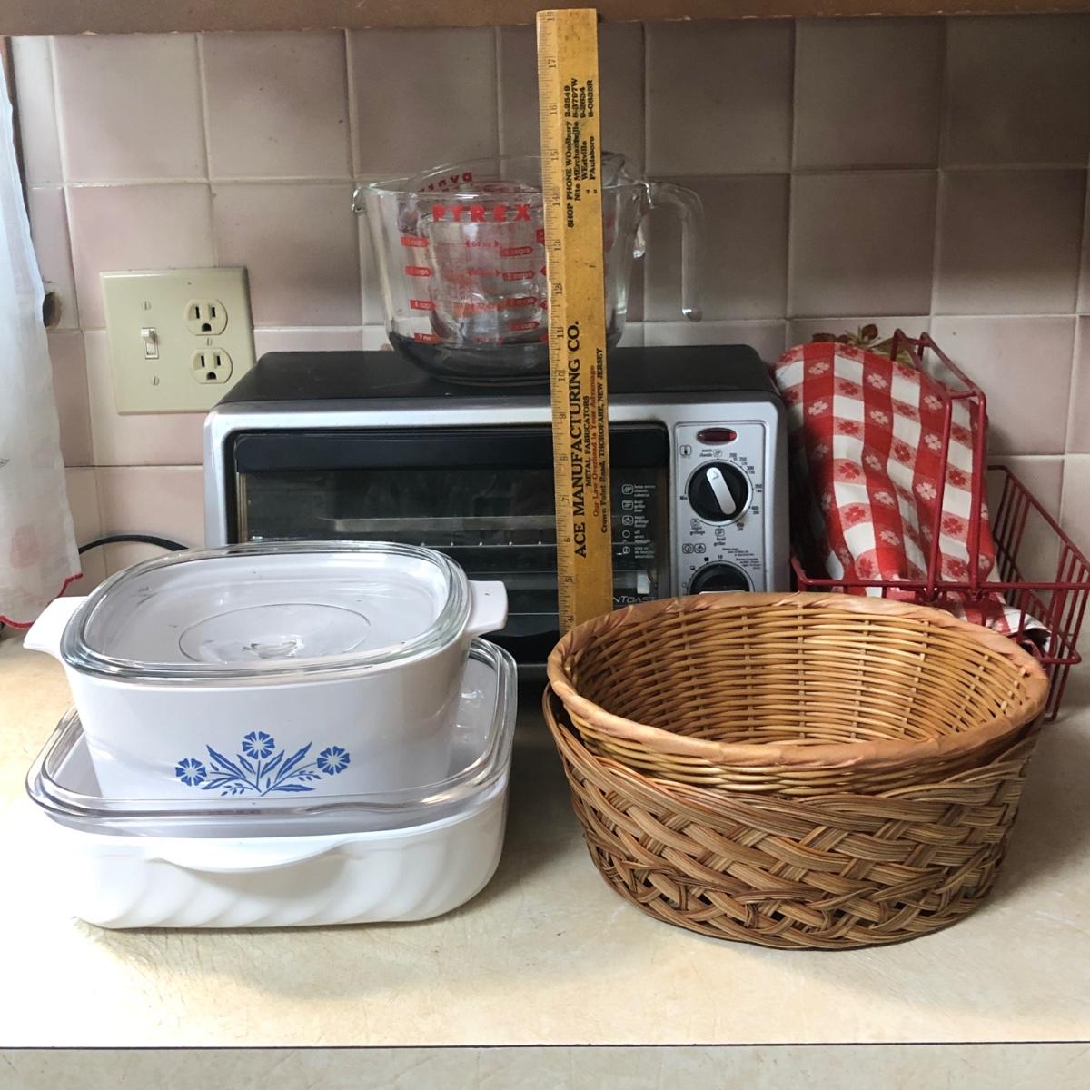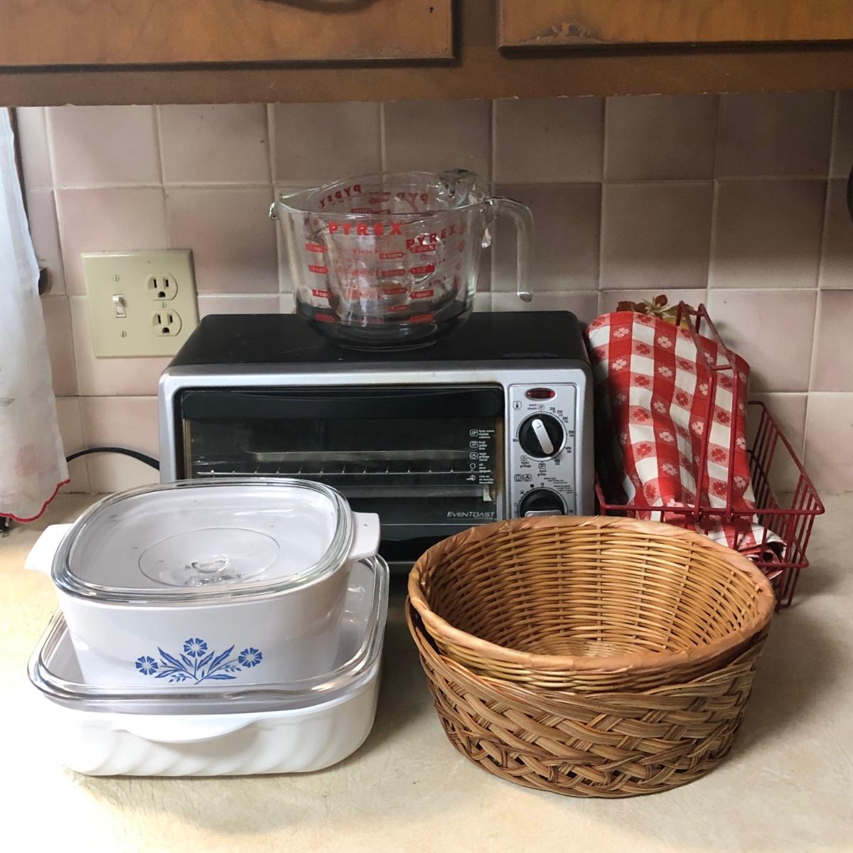 LOT 35M: Black & Decker Toast-R-Oven Model TO1332SBD, Corningware Blue Cornflower, Pyrex Measuring Cups & More