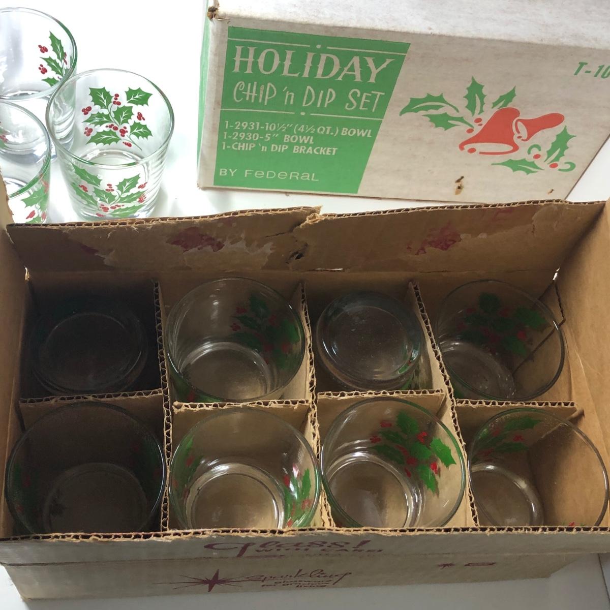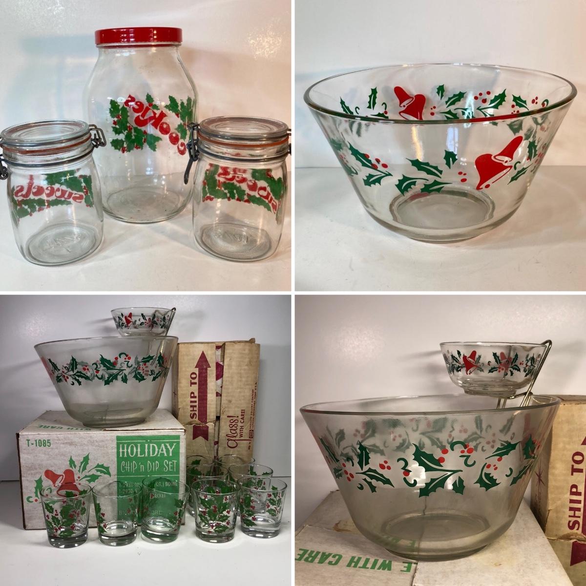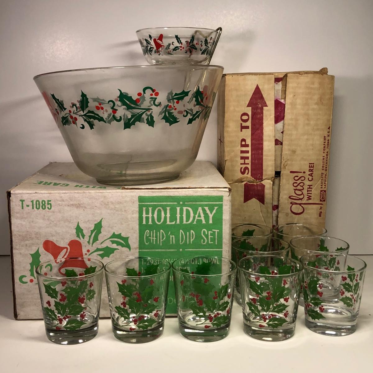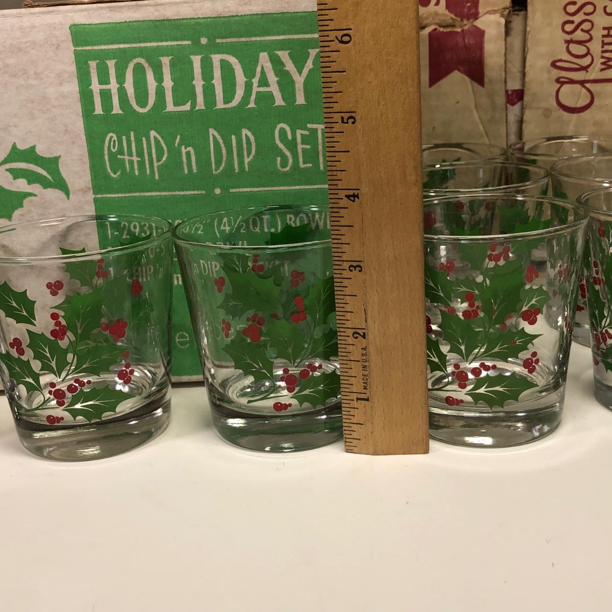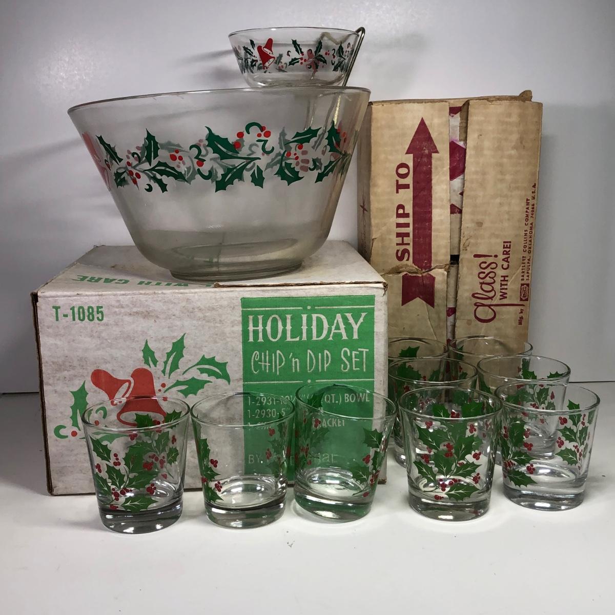 LOT 53M: Federal Holiday Chip n Dip Set w/ Extra Bowl, Holly Glass Tumblers & More