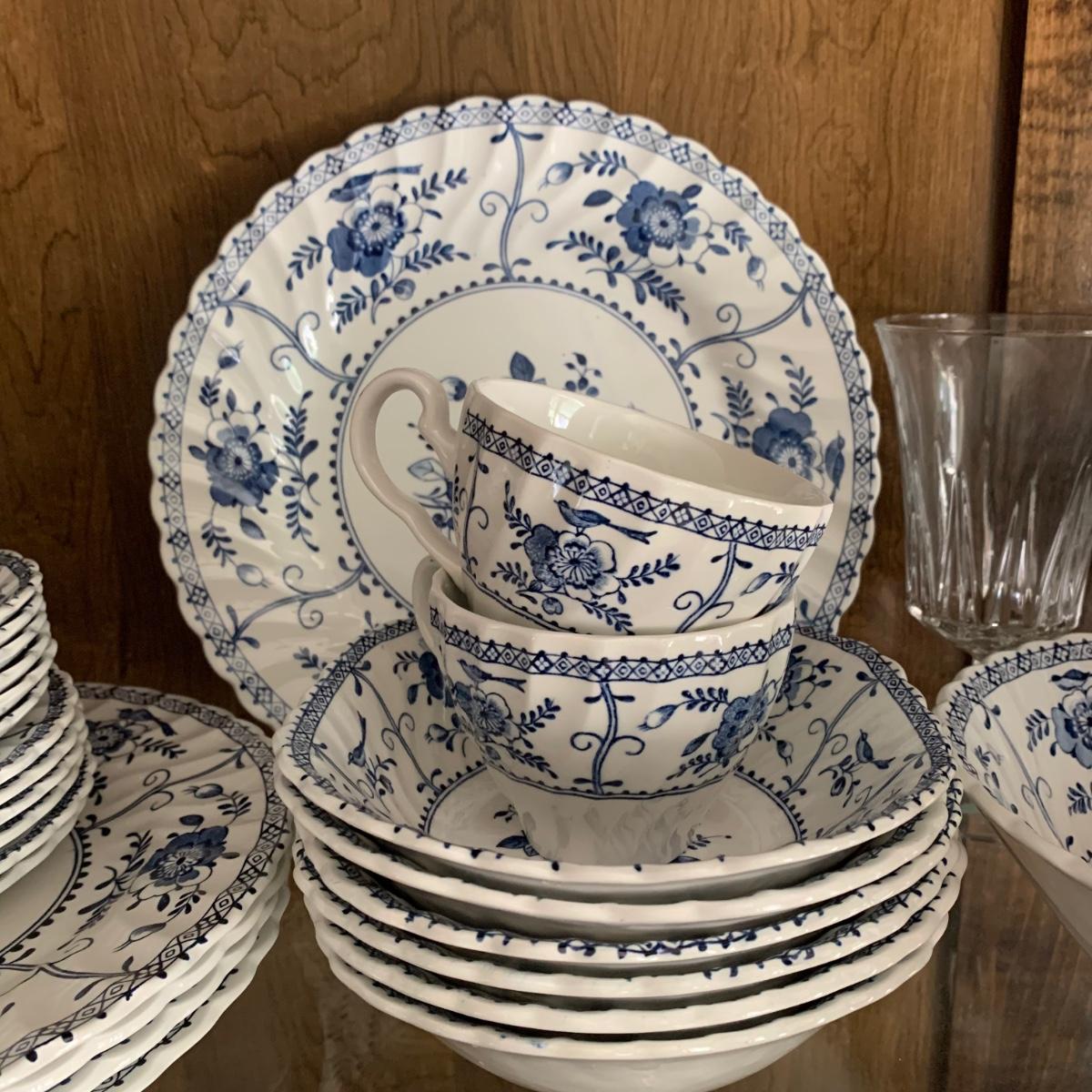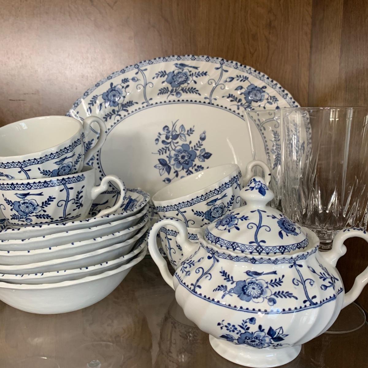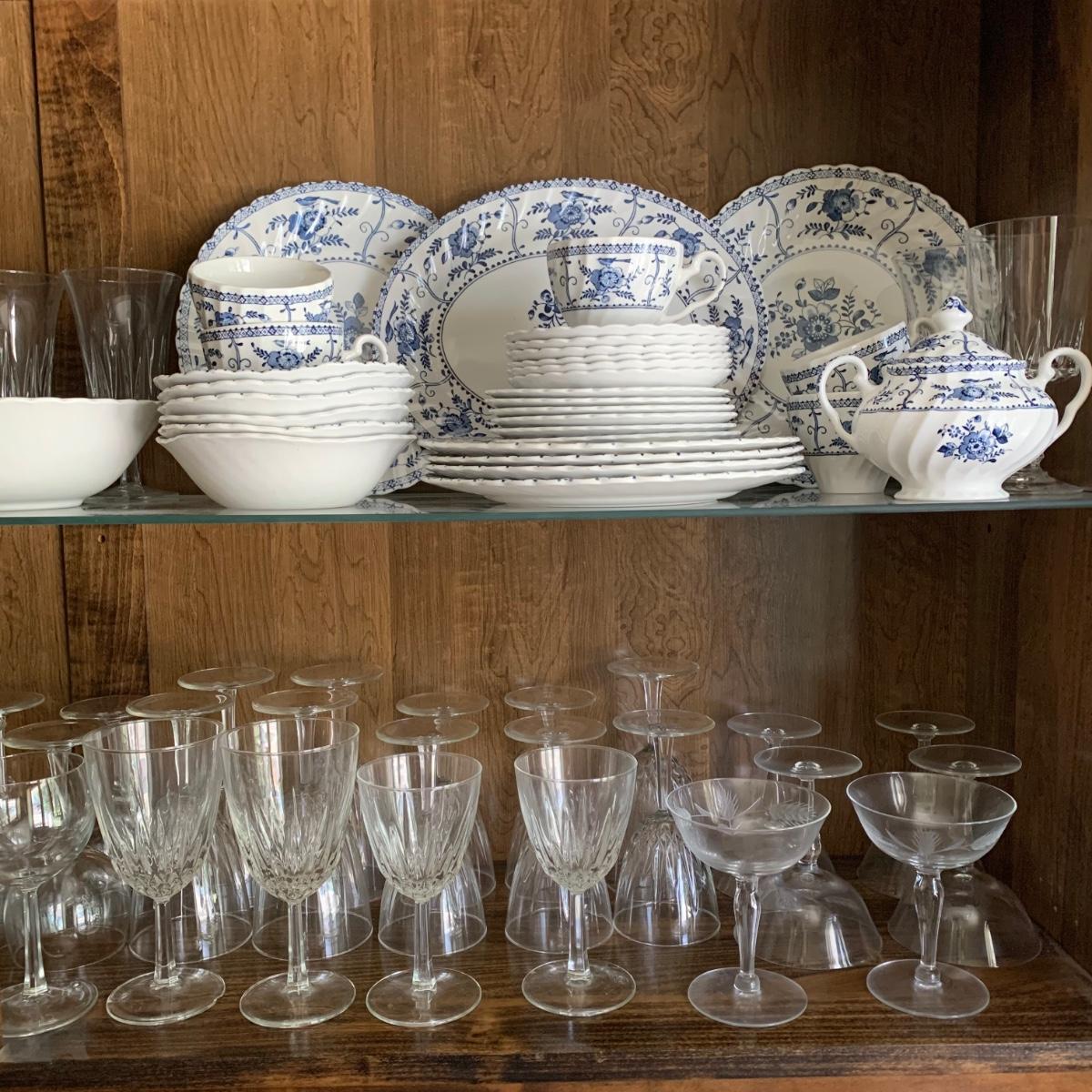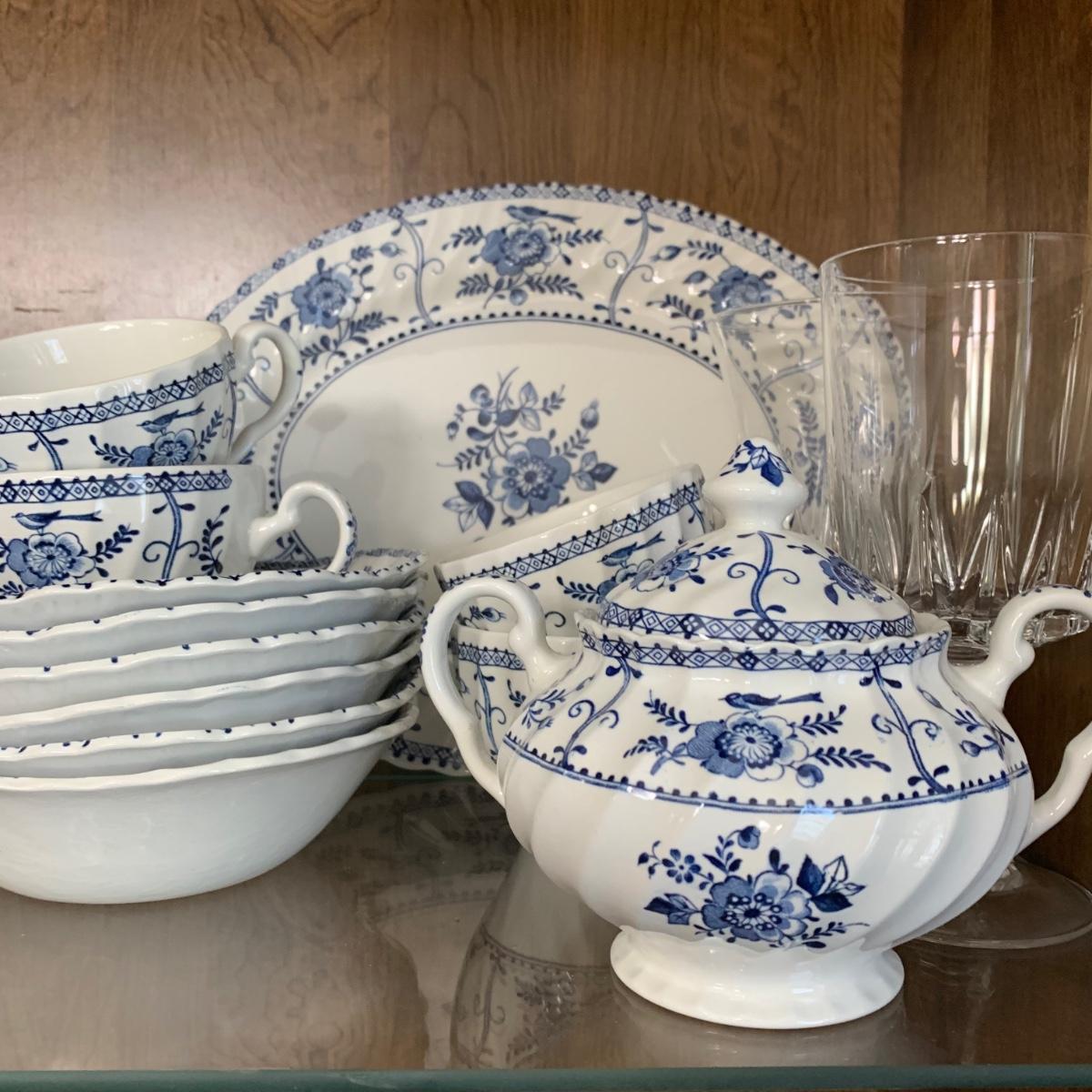 LOT 55: Vintage Johnson Brothers Blue White Indies Ironstone China & Stemware