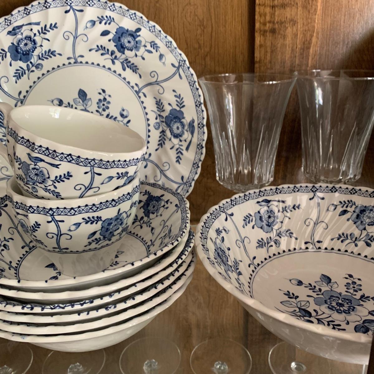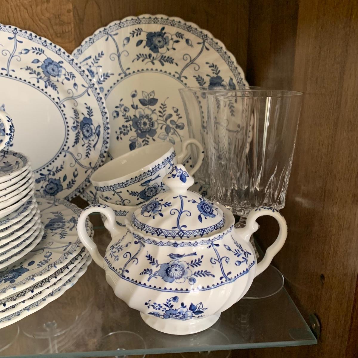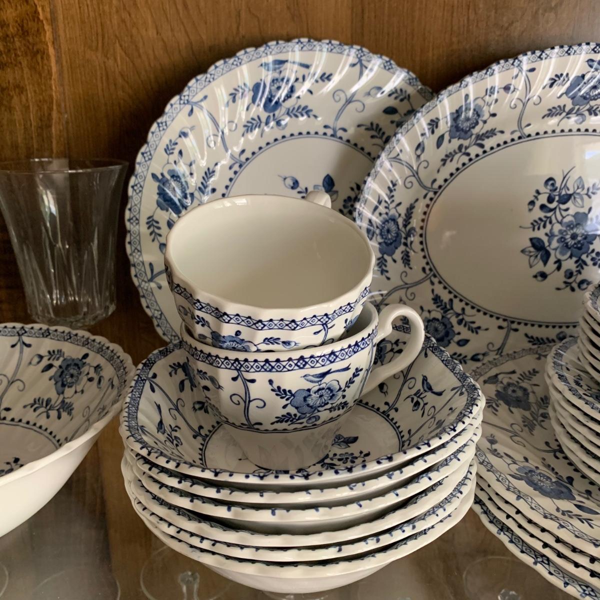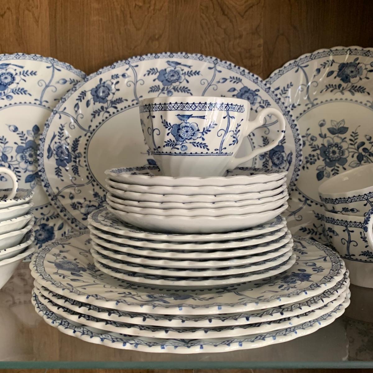 LOT 55: Vintage Johnson Brothers Blue White Indies Ironstone China & Stemware