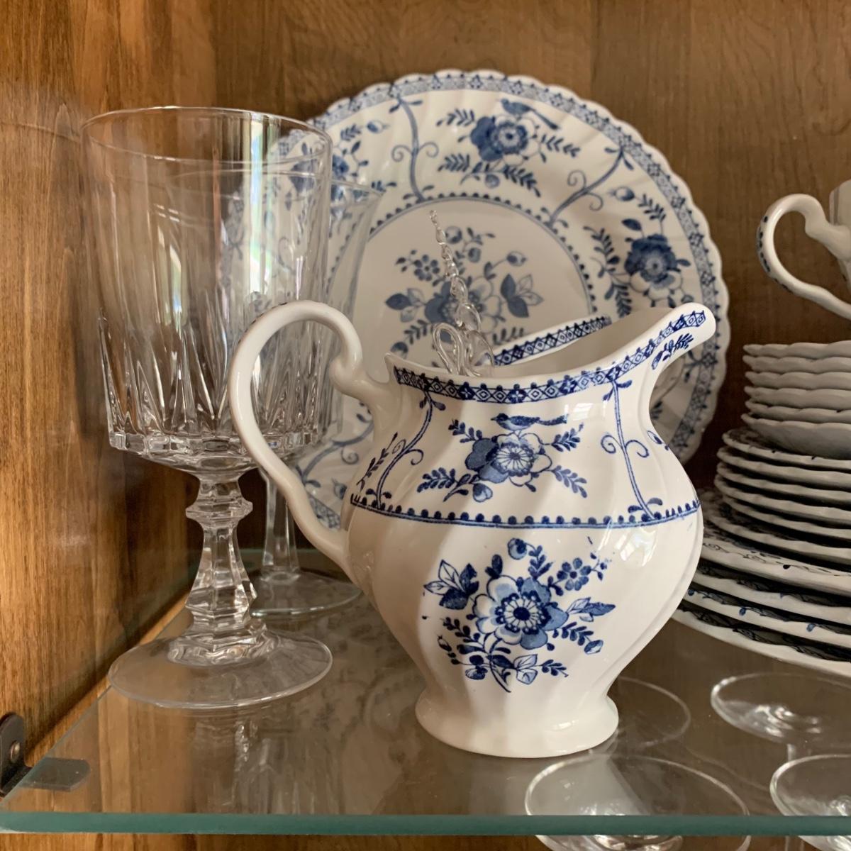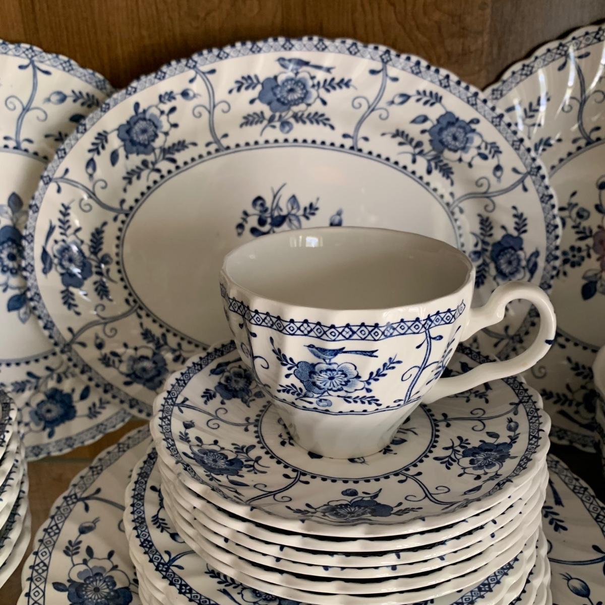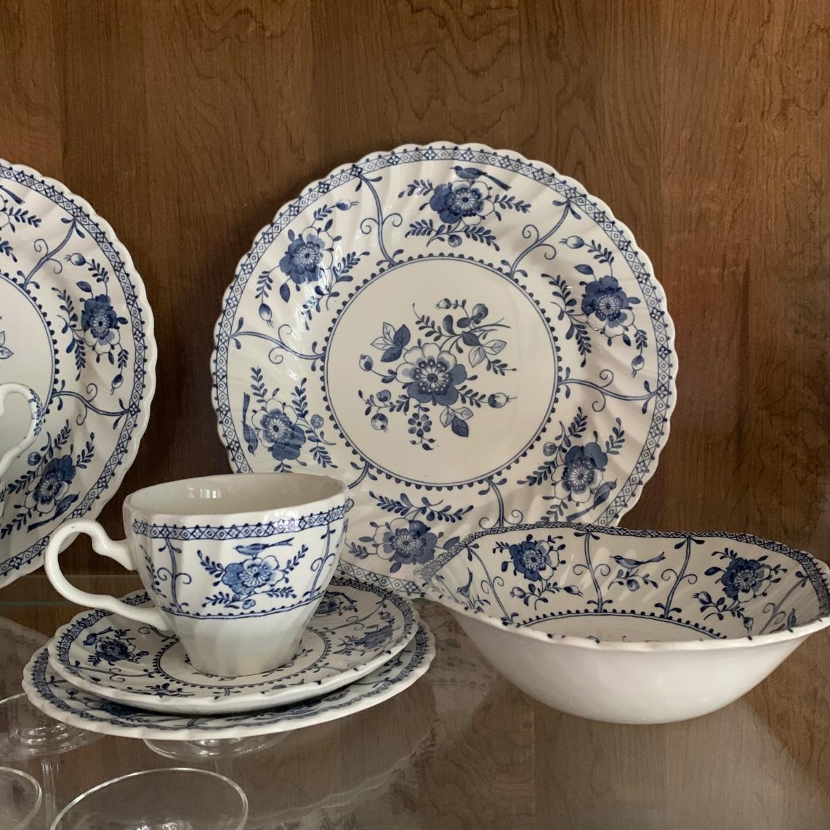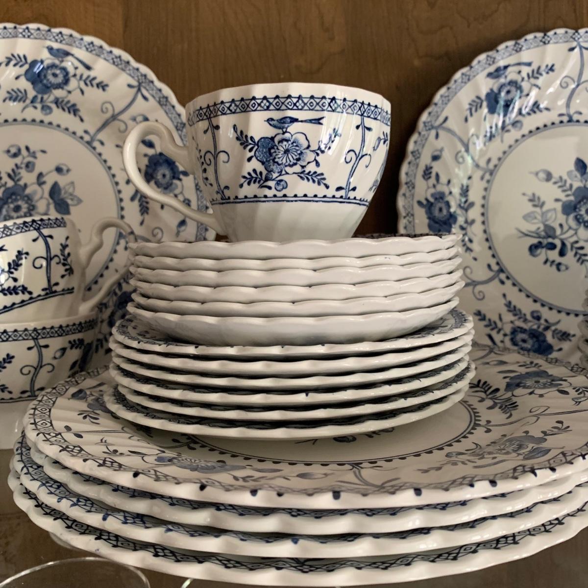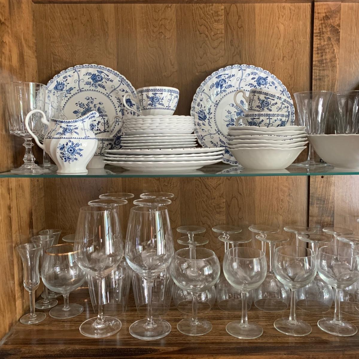LOT 55: Vintage Johnson Brothers Blue White Indies Ironstone China & Stemware