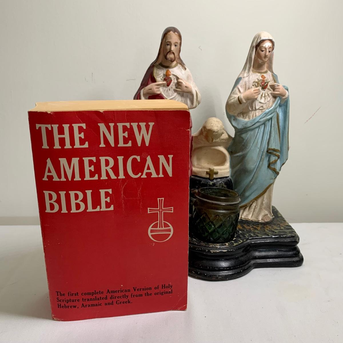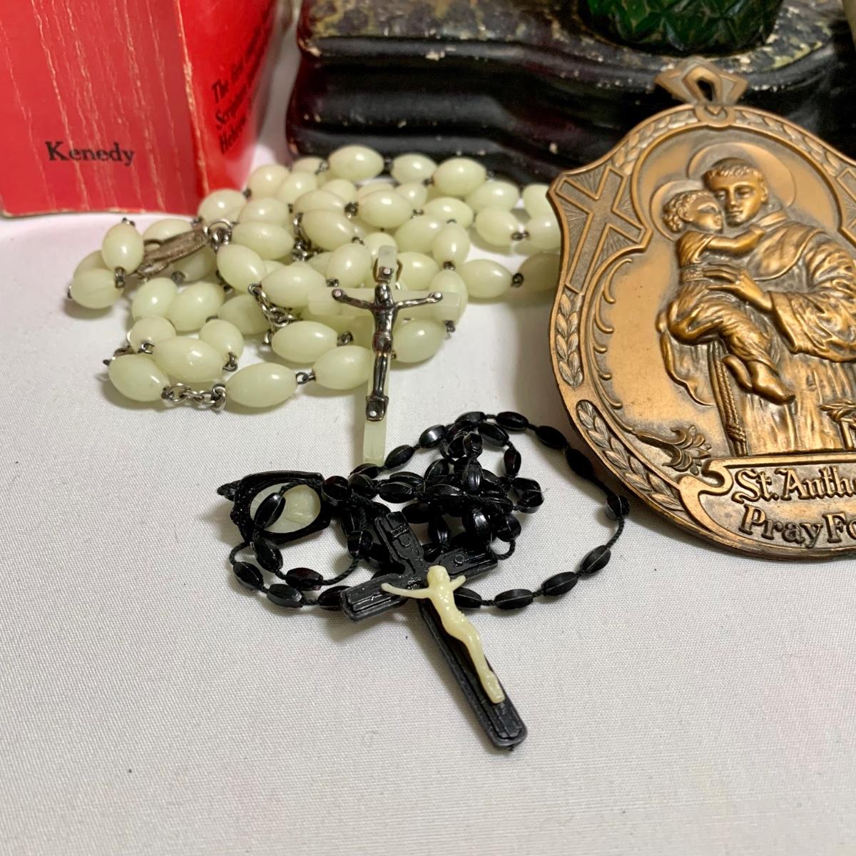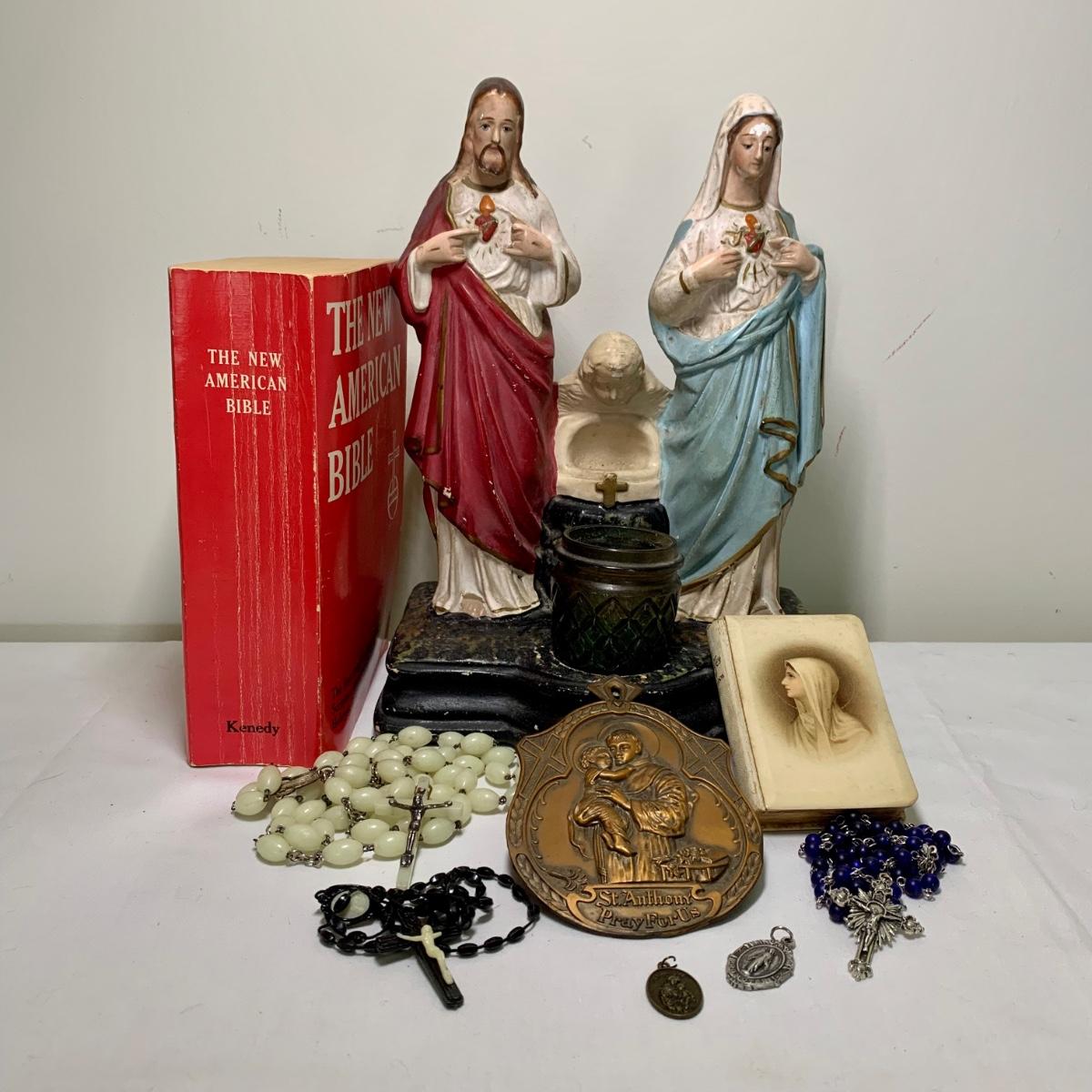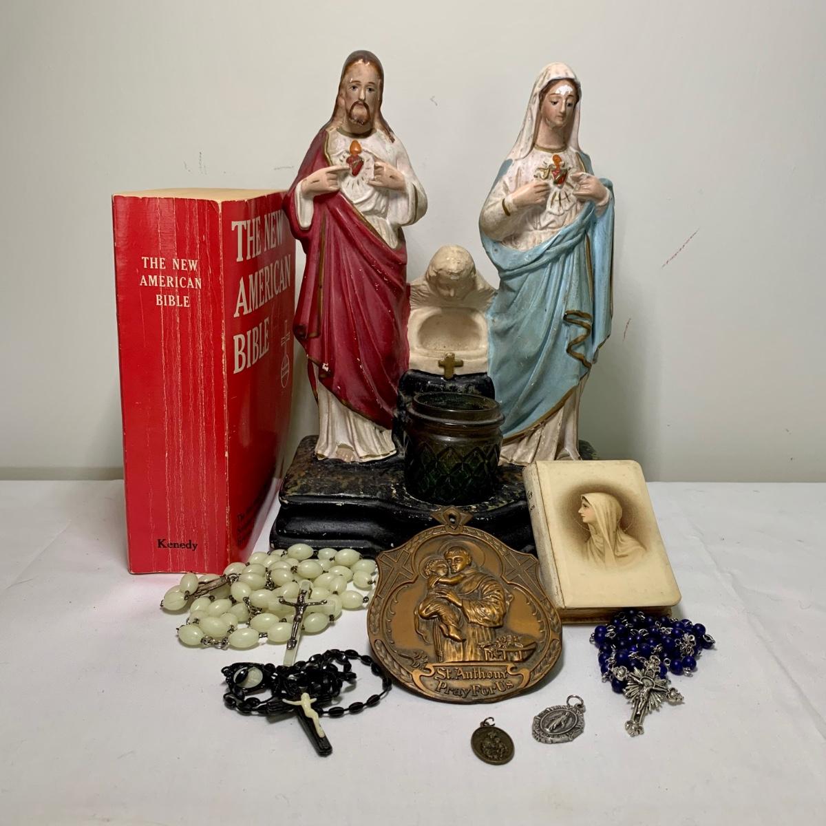 LOT 66R: Antique P.S. Co., Phila PA Chalkware Religious Statue, Rosaries, Bible & More