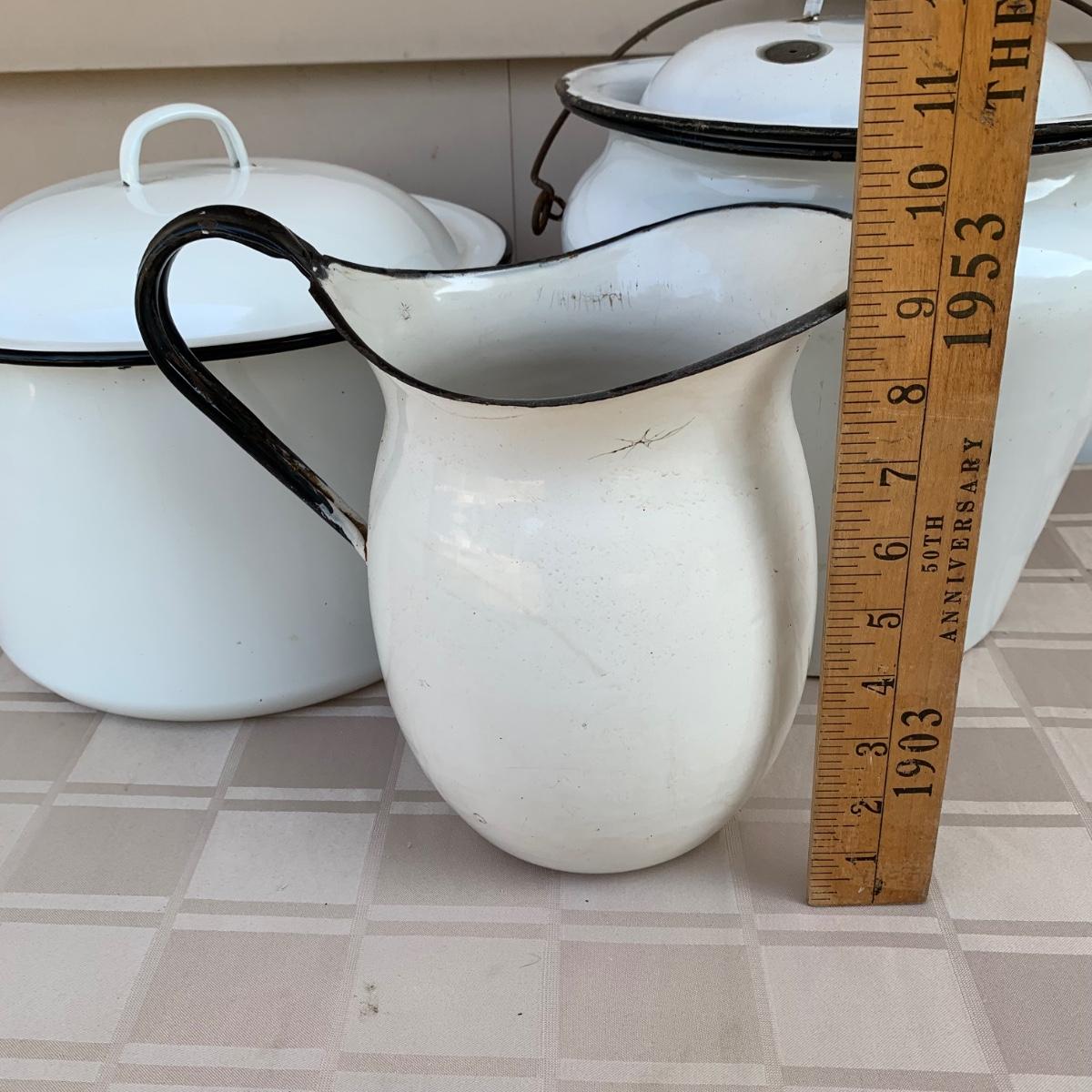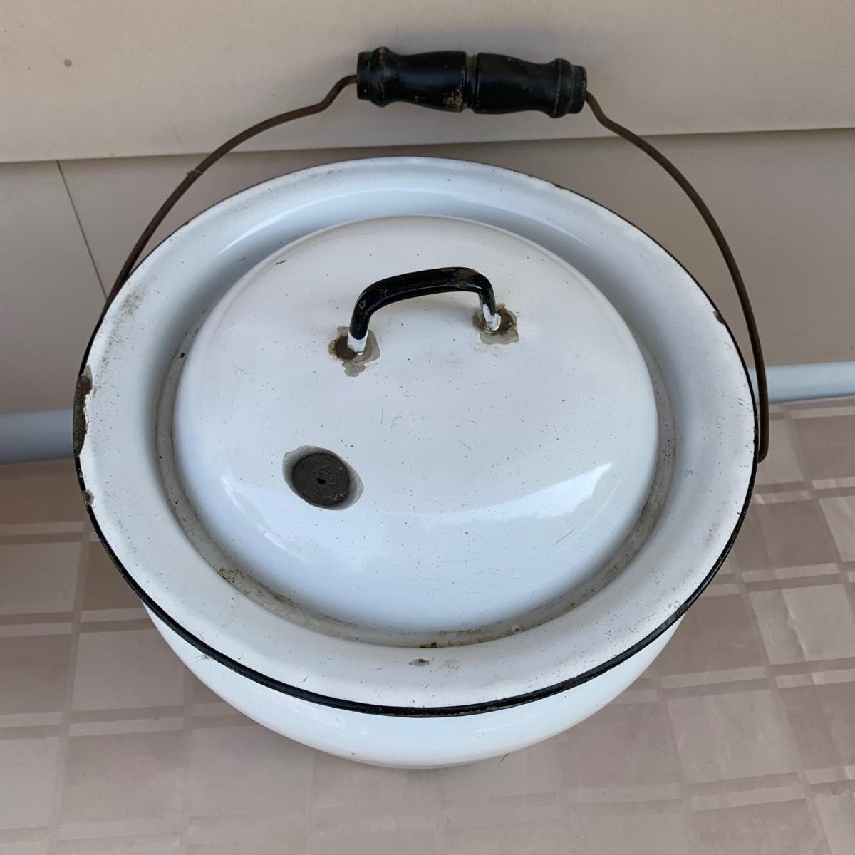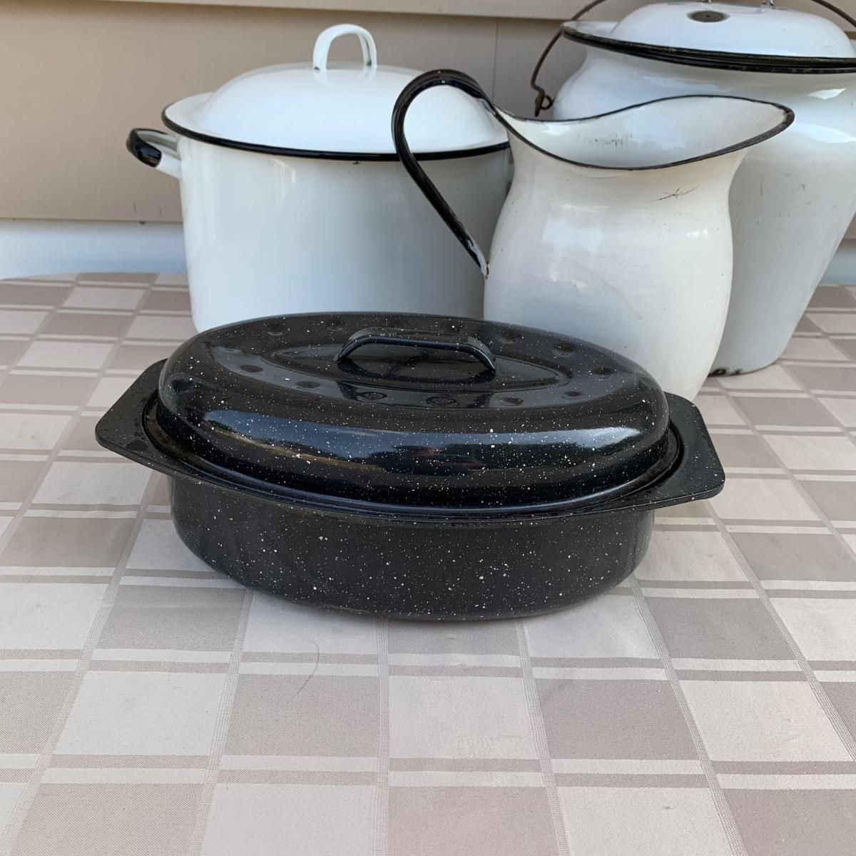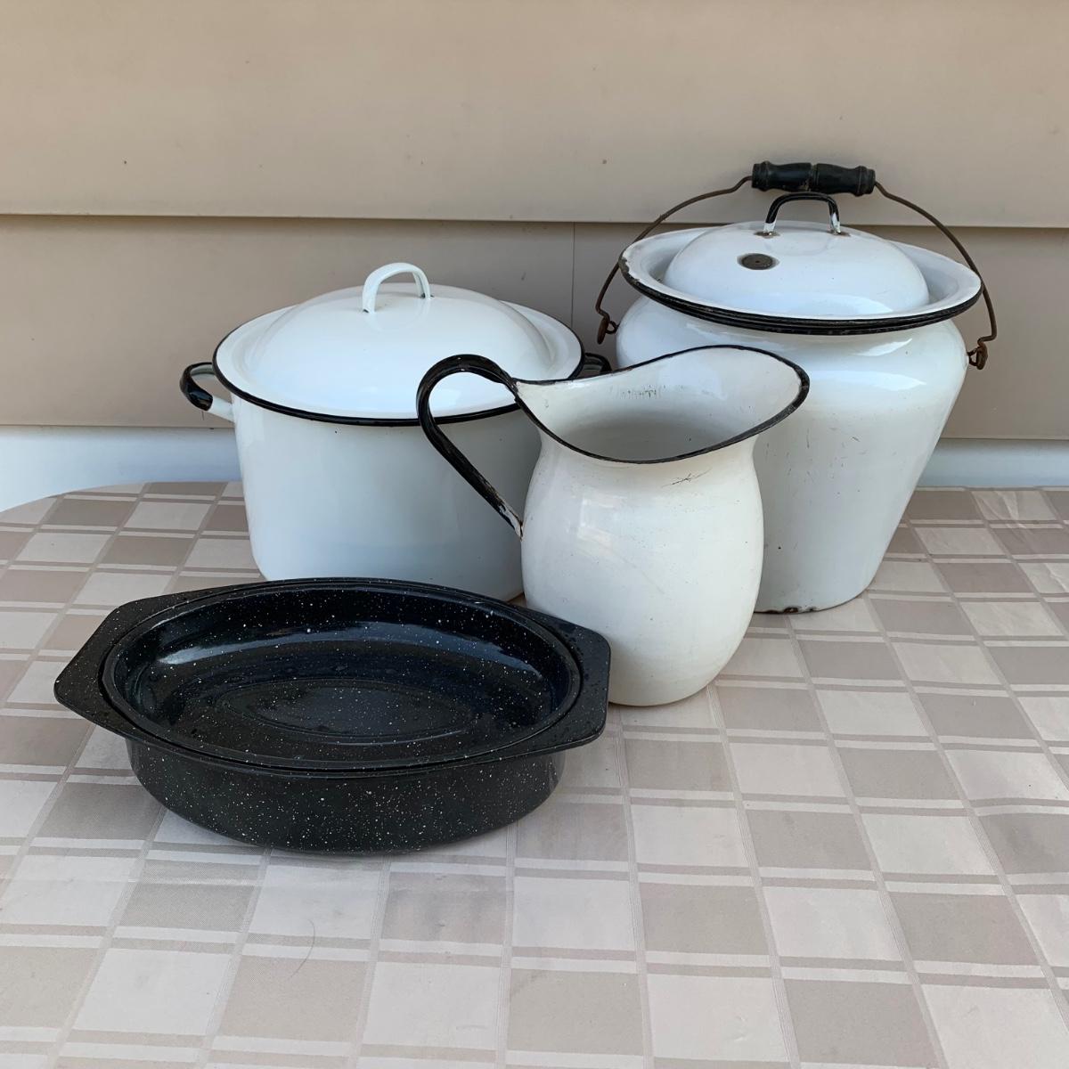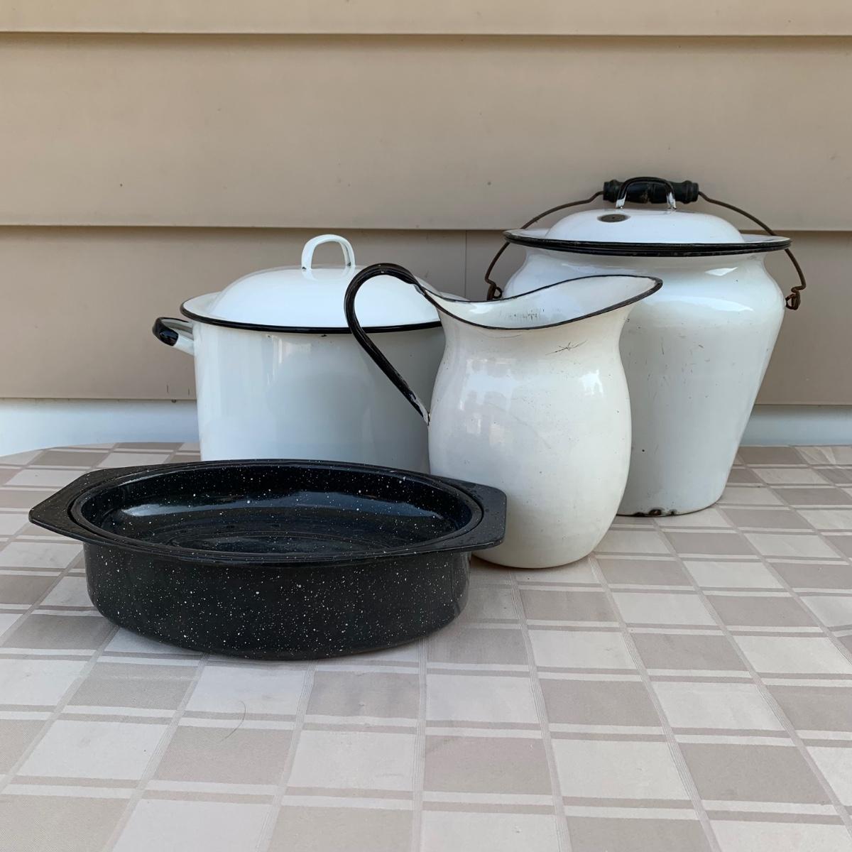 LOT 94R: Enamel Ware Collection: Stock Pot, Chamber Pot, Pitcher & Roaster