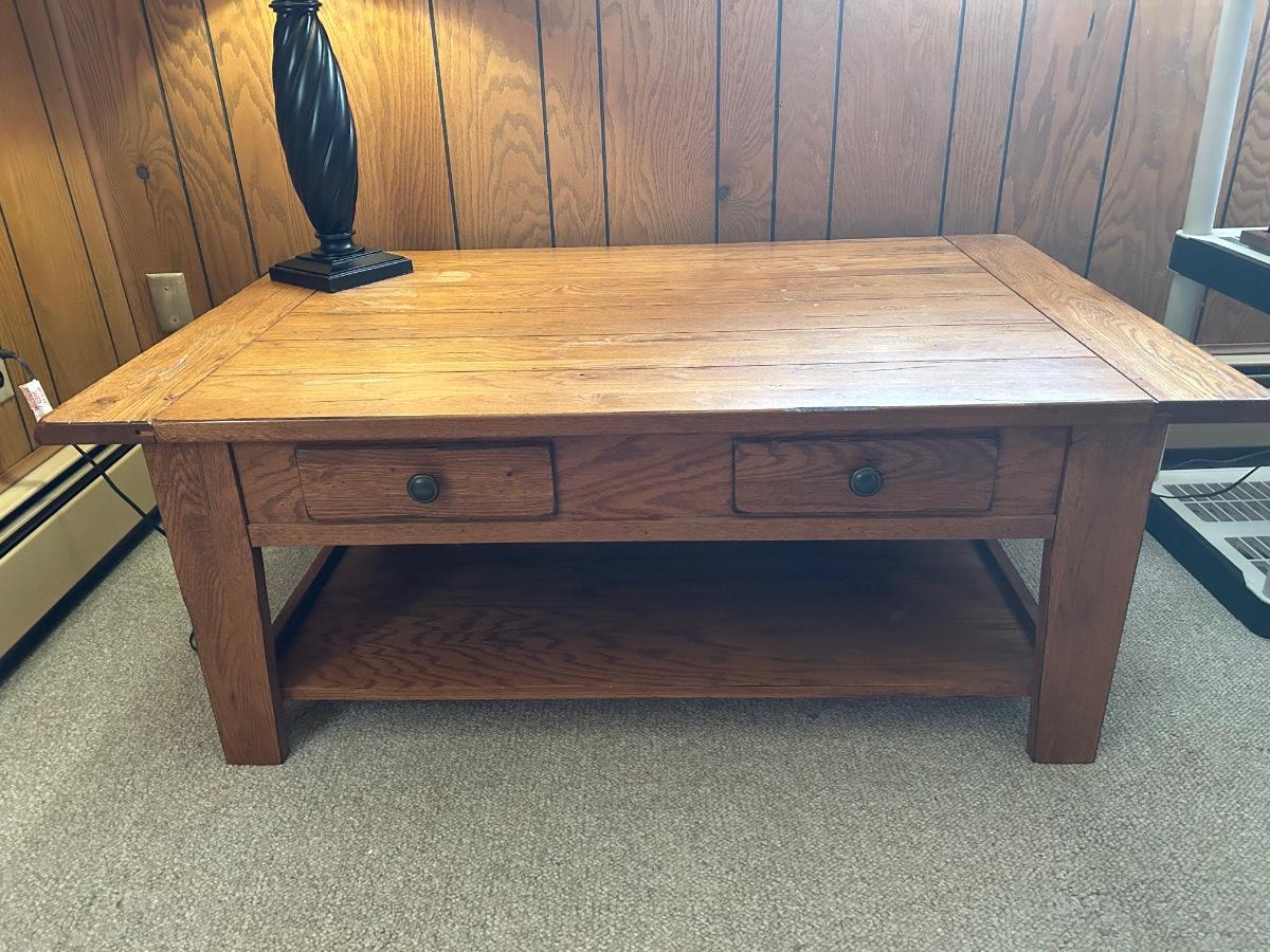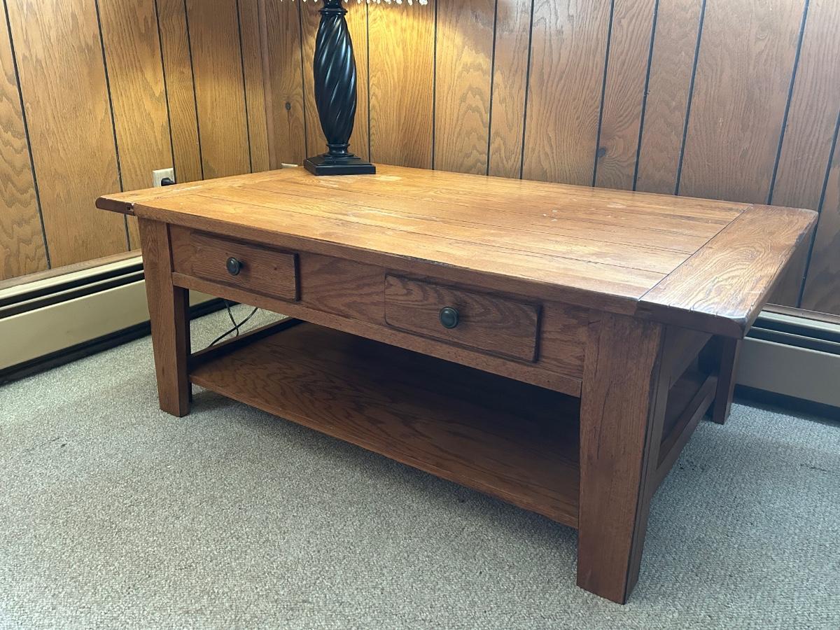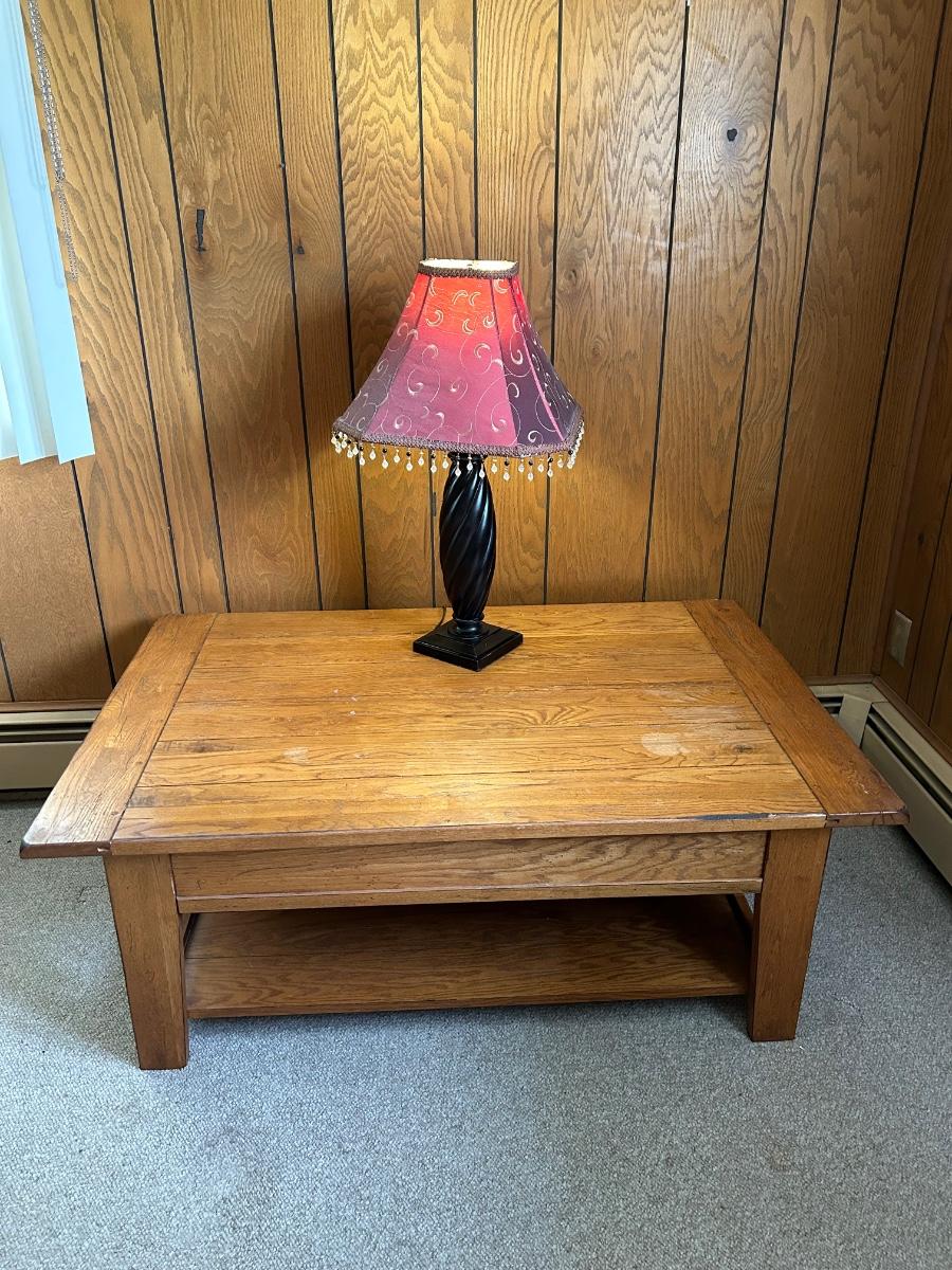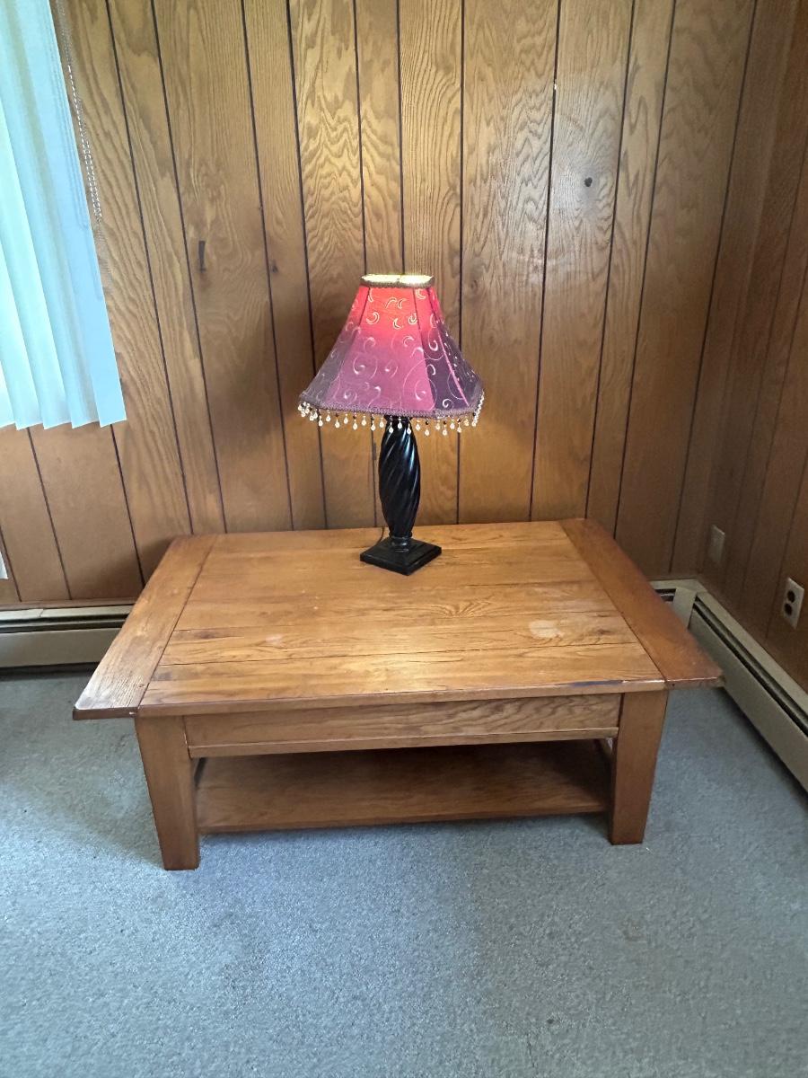 Coffee table has two drawers for storage. Lamp in 29” Tall.