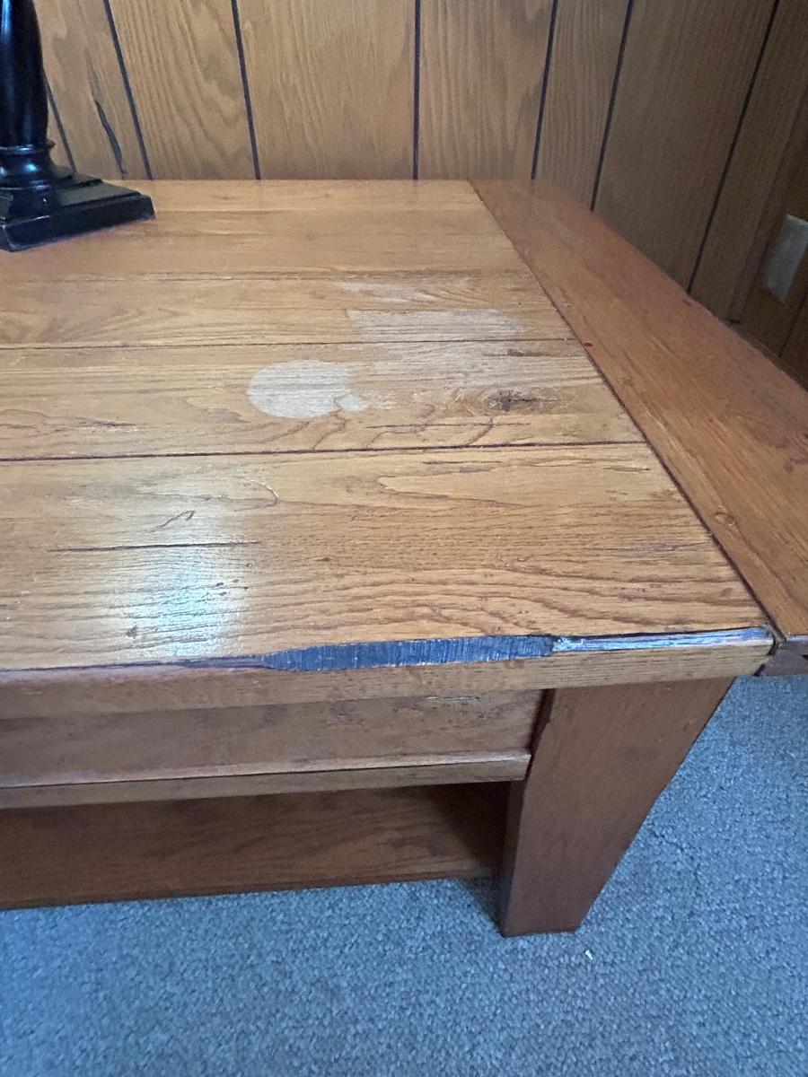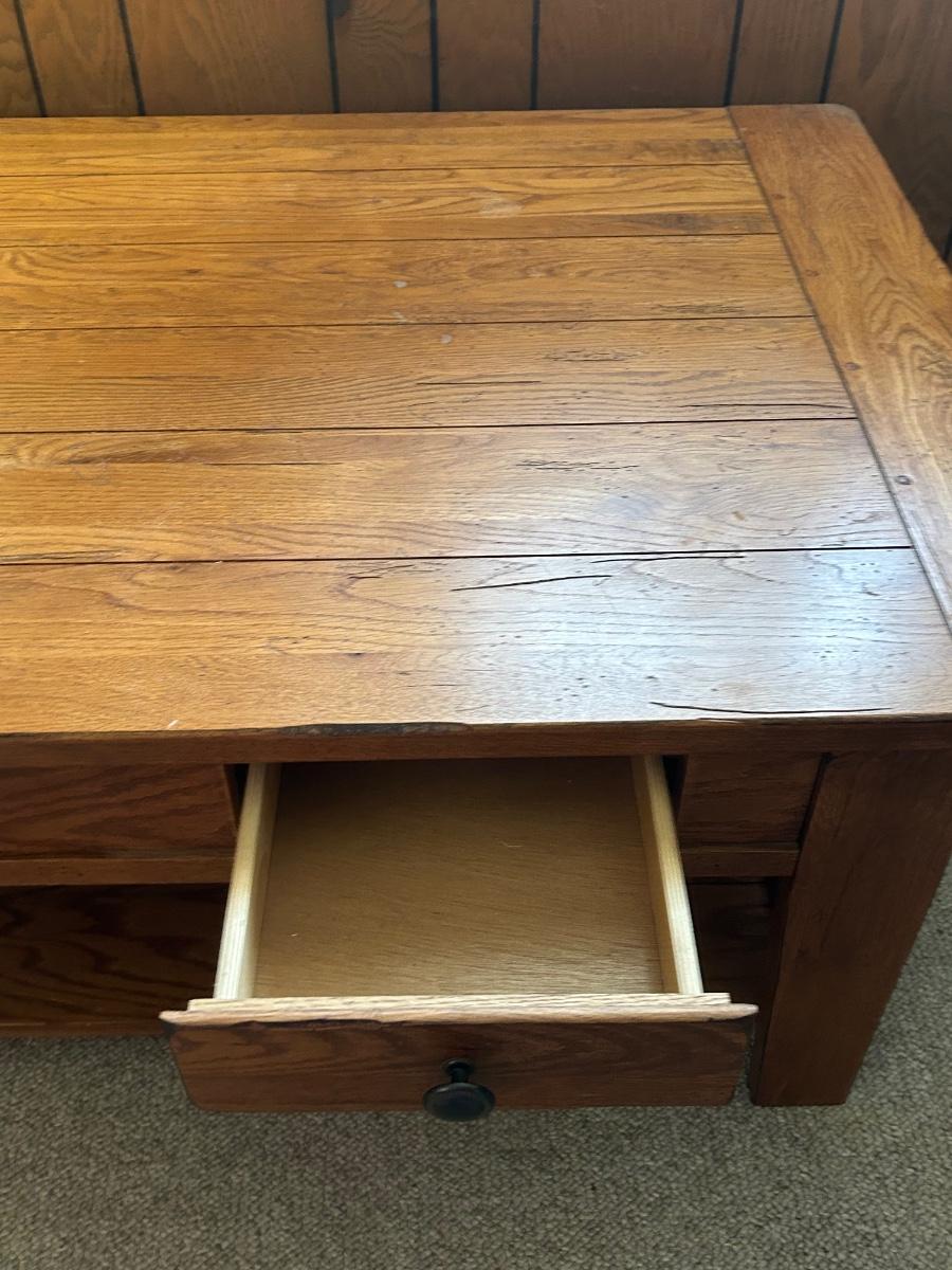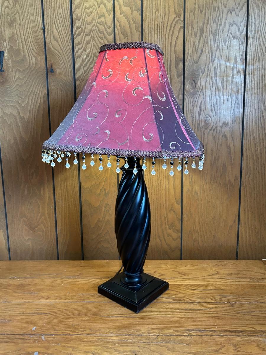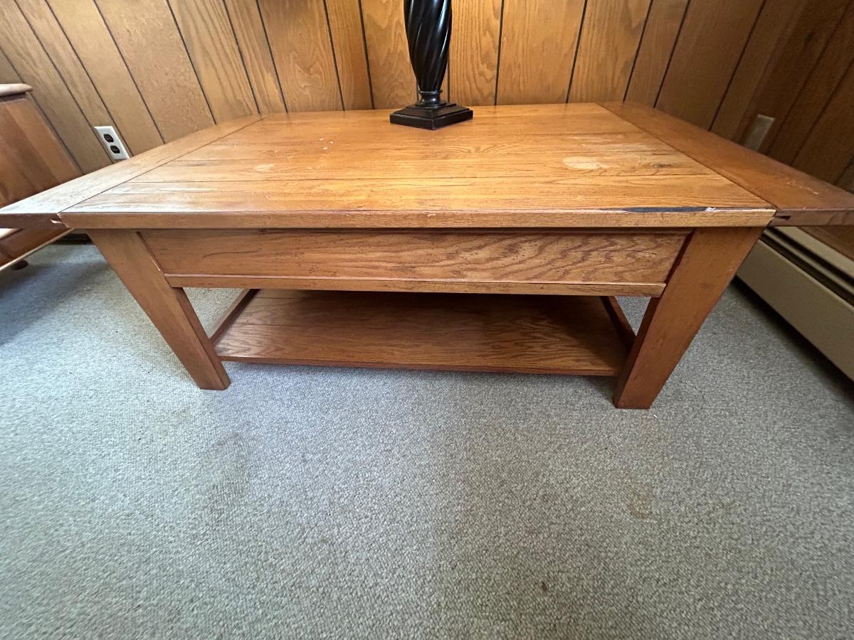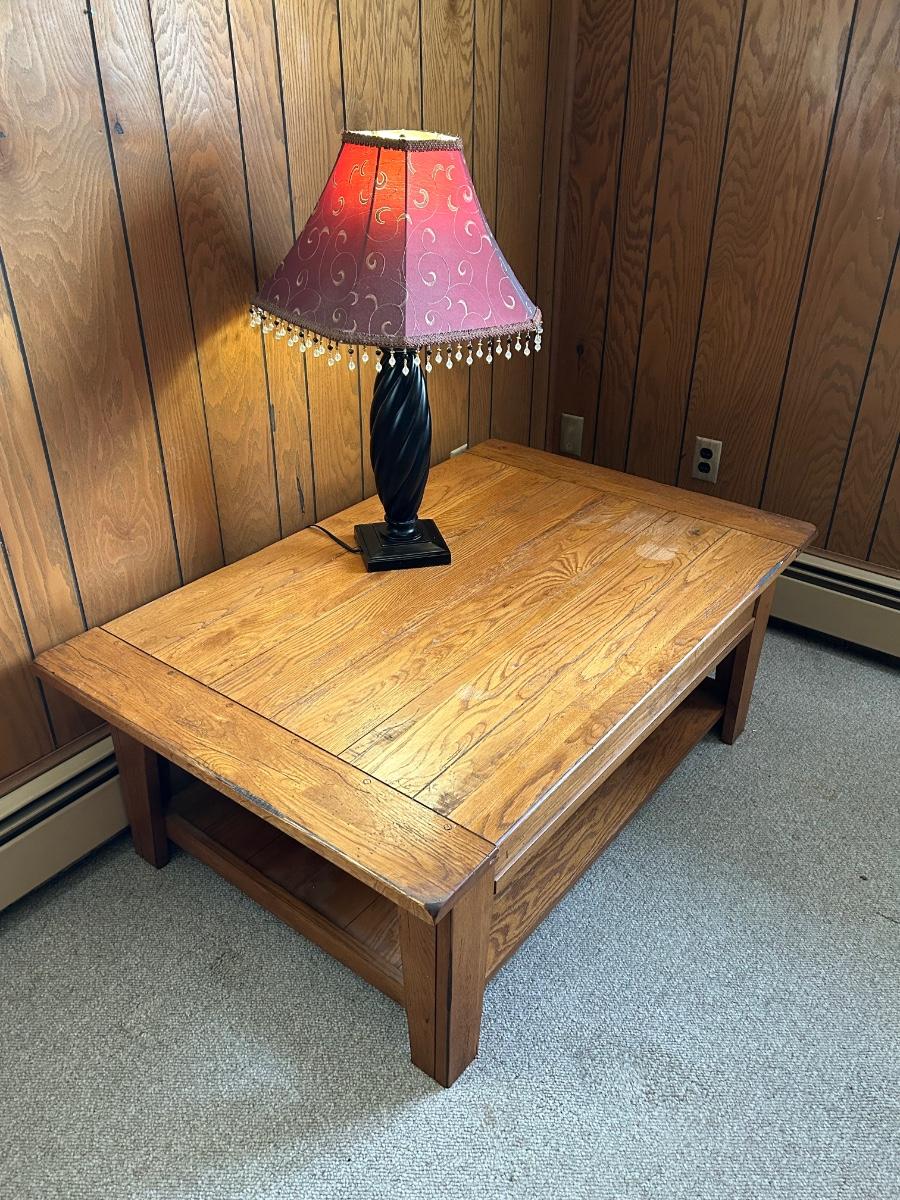 Coffee table has two drawers for storage. Lamp in 29” Tall.