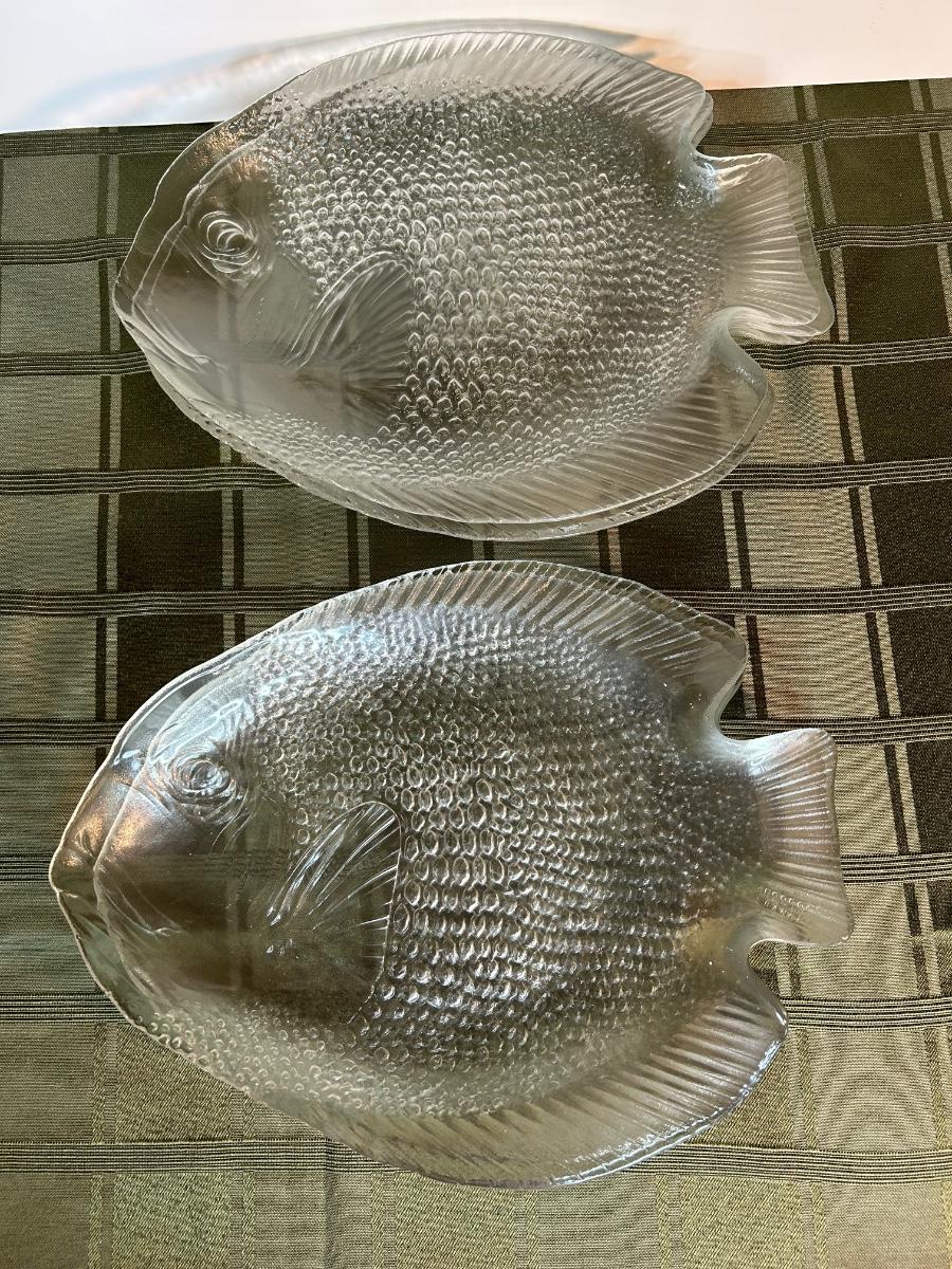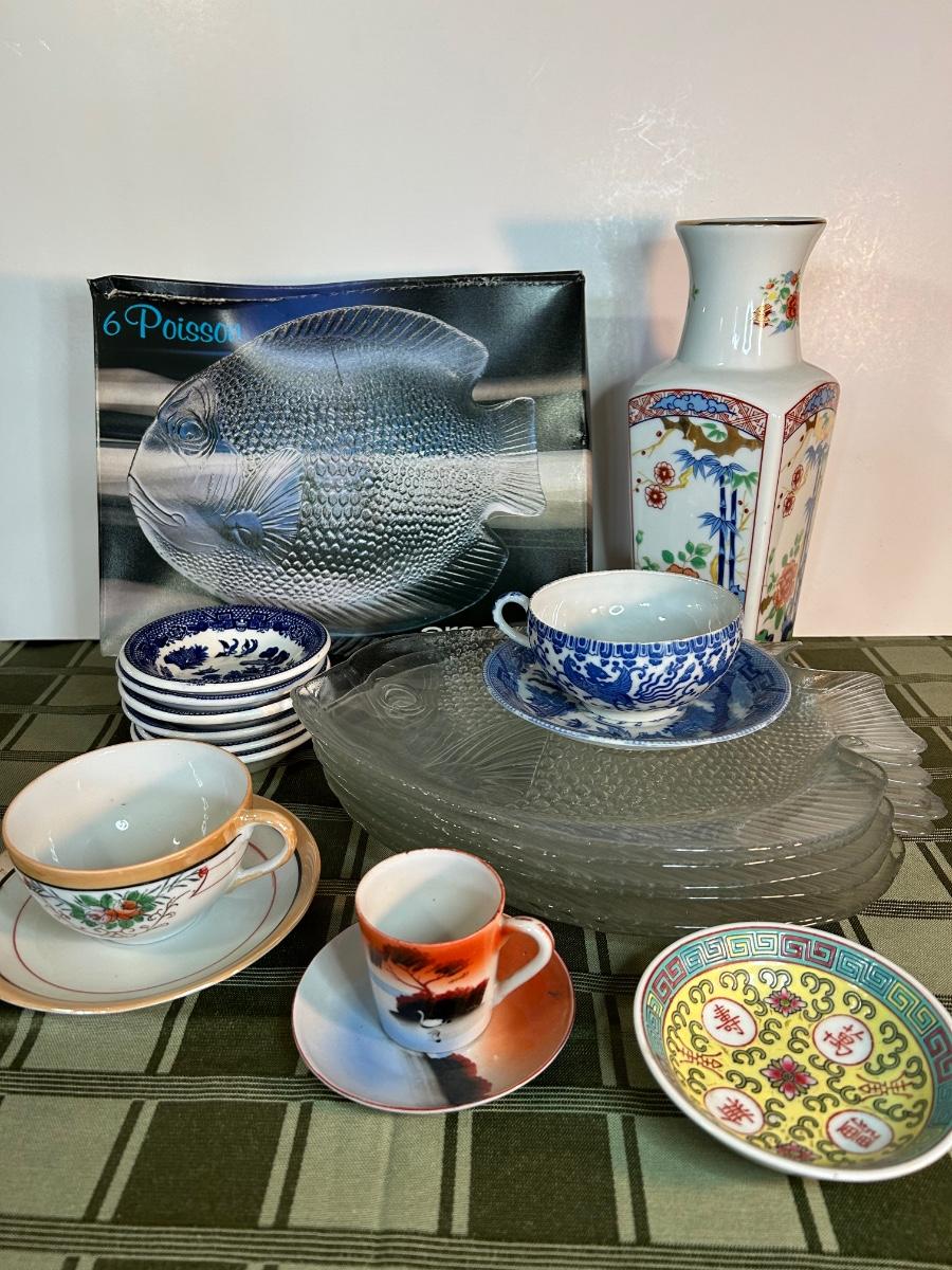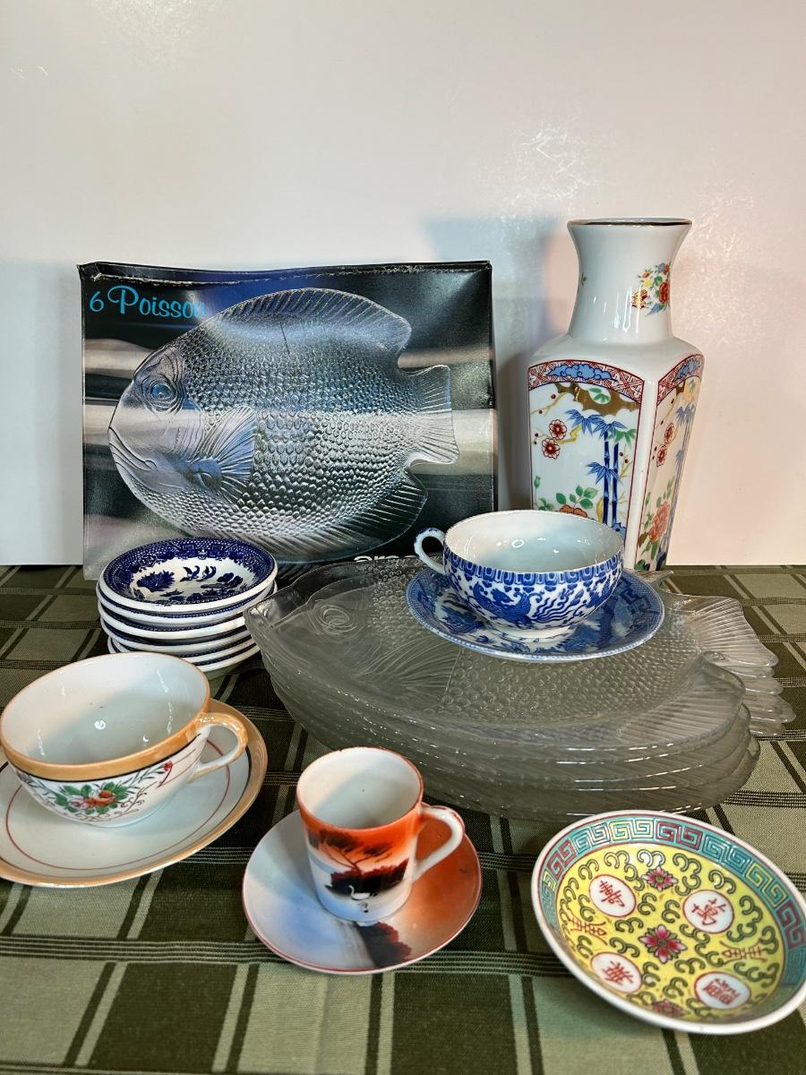 Two sets of clear glass fish dishes. One set complete in box, vase, tea cups, dishes and more.
