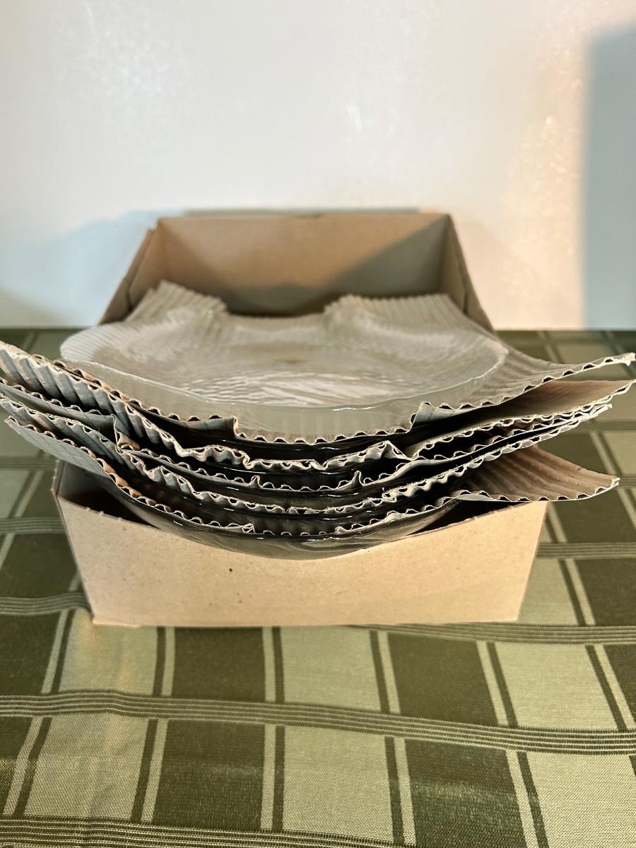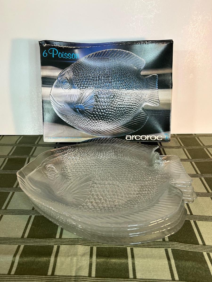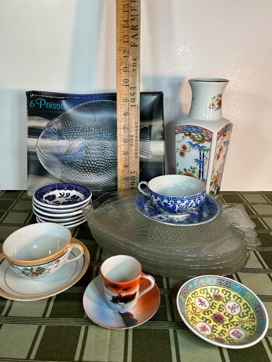 Two sets of clear glass fish dishes. One set complete in box, vase, tea cups, dishes and more.
