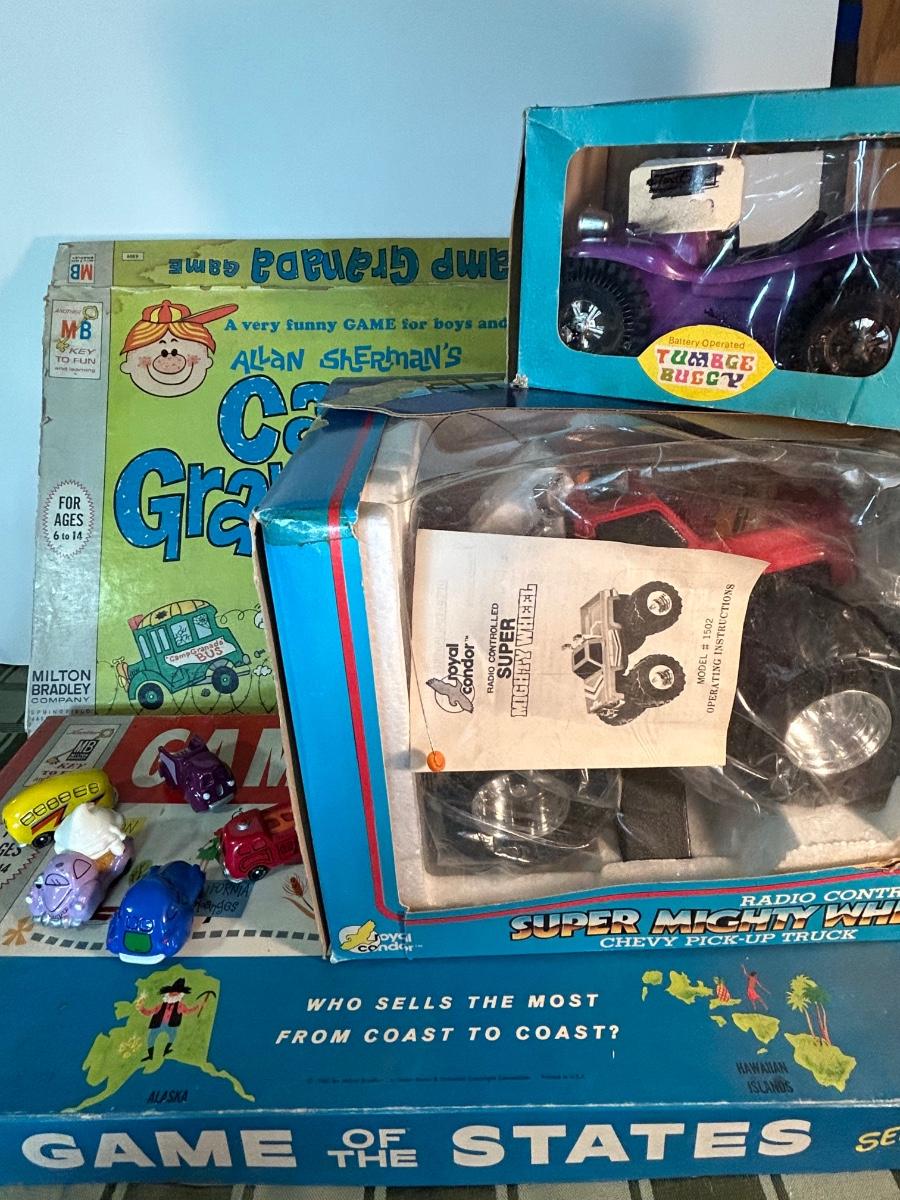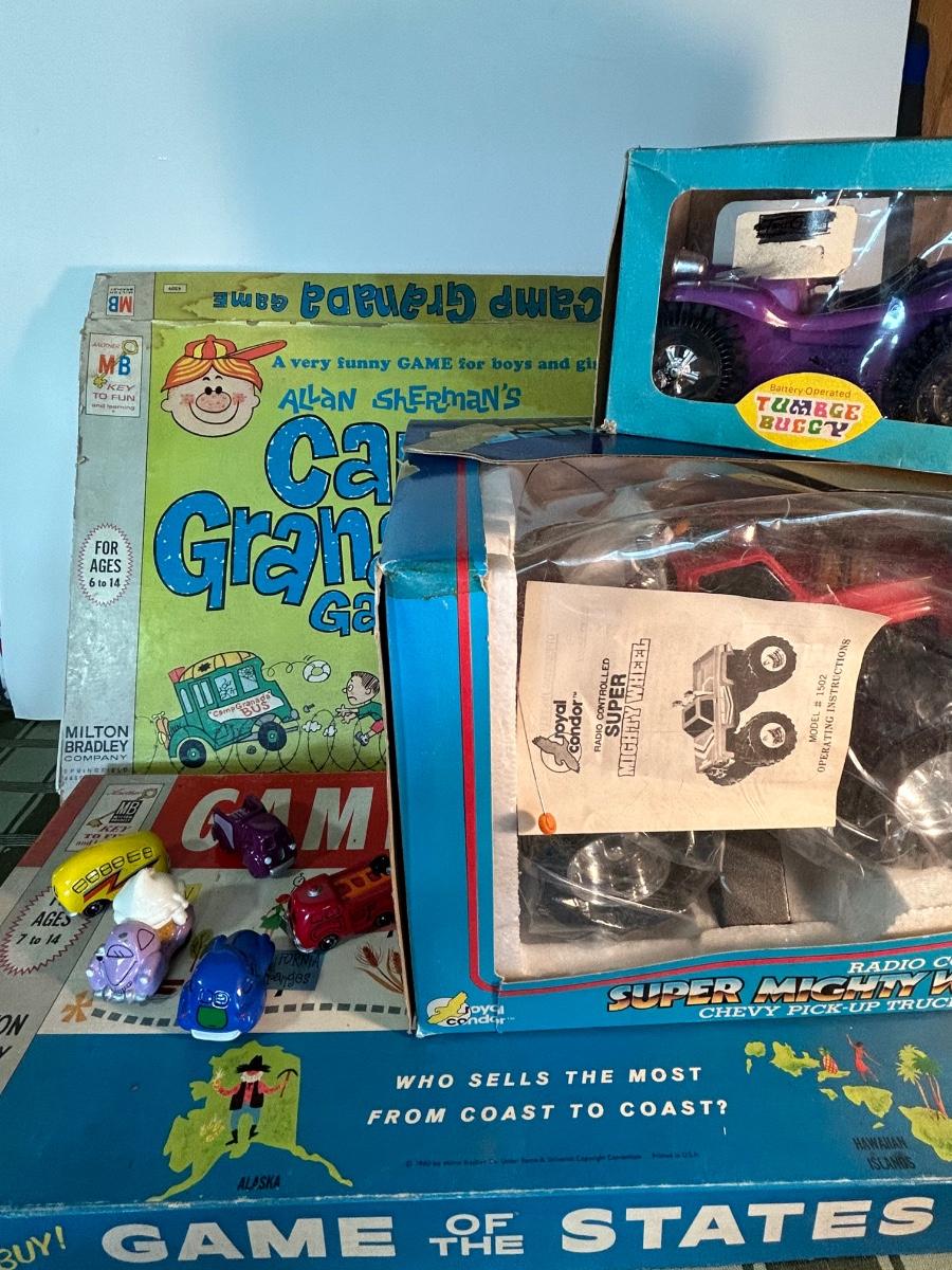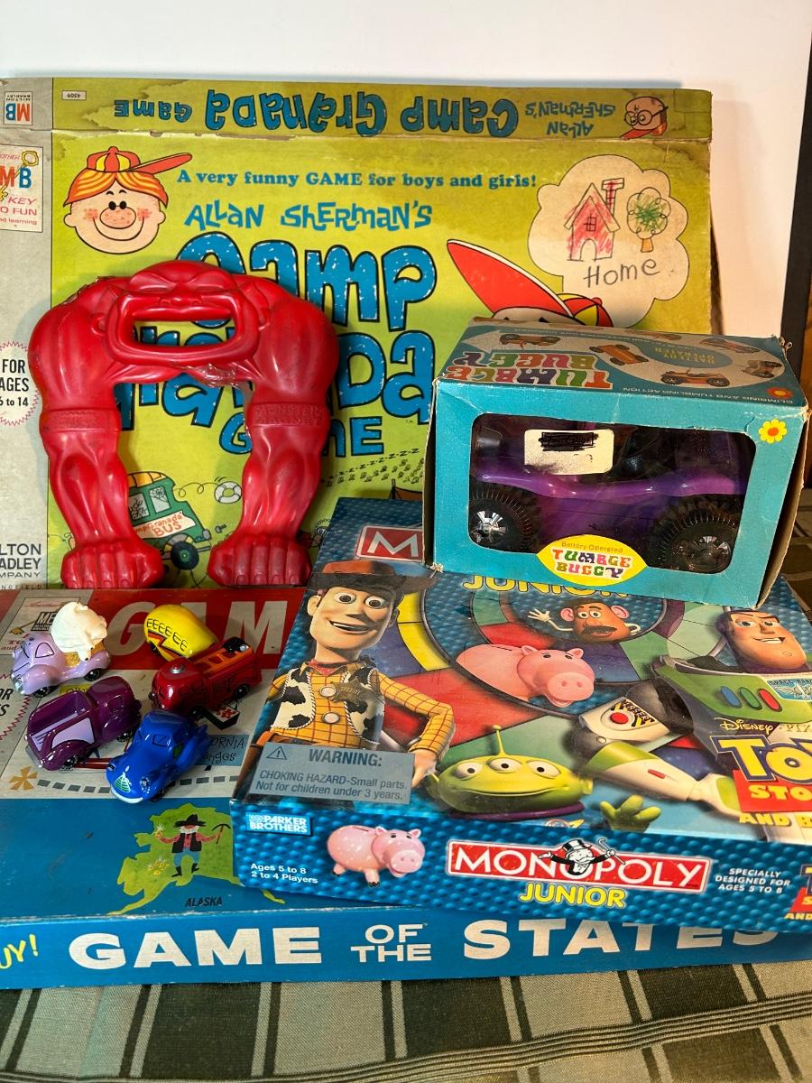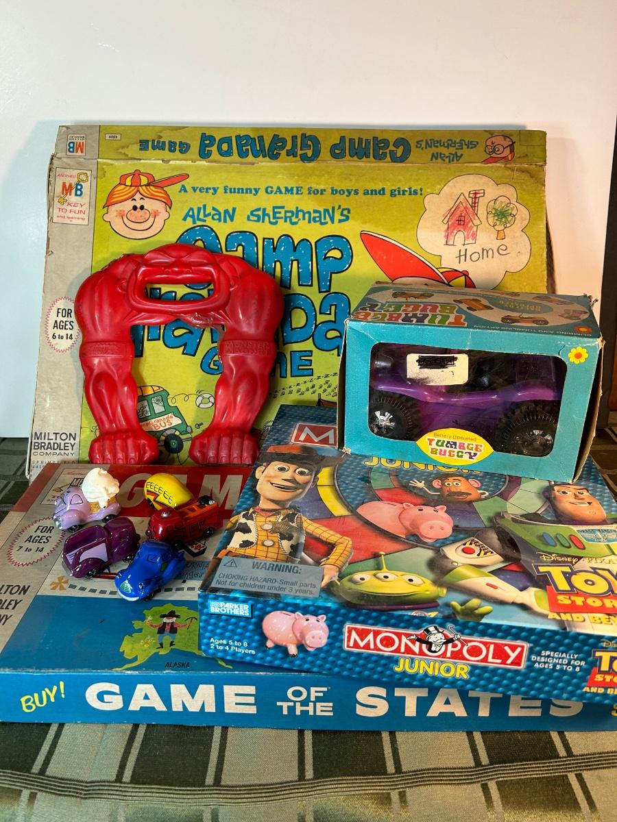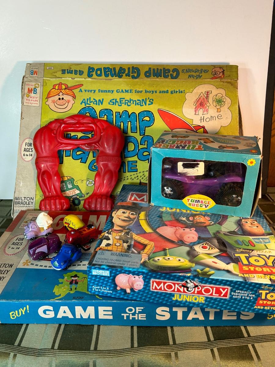 LOT:121: Collection of Vintage Games and Toys Including Camp Granada Board Game; Monopoly JR.; Toy Story Board Game; Game of the States; and More