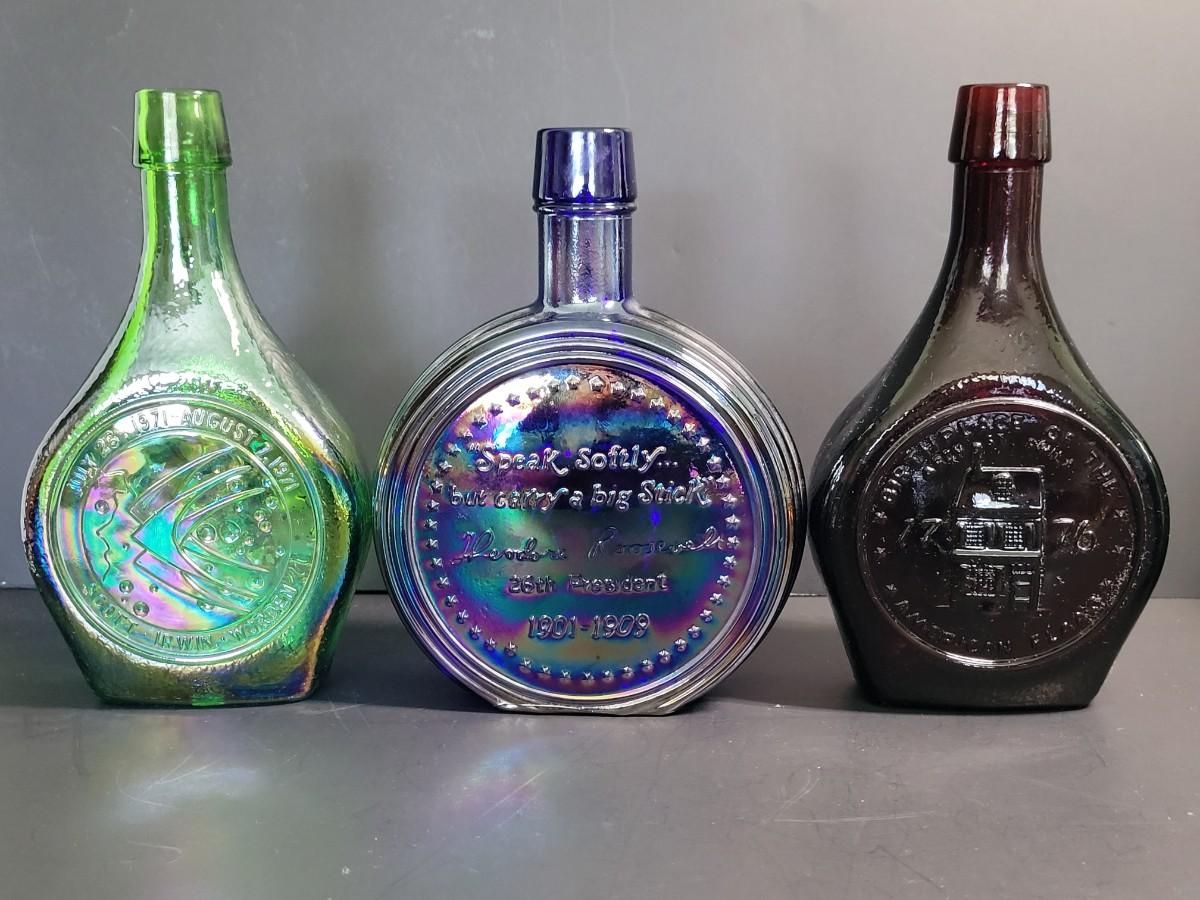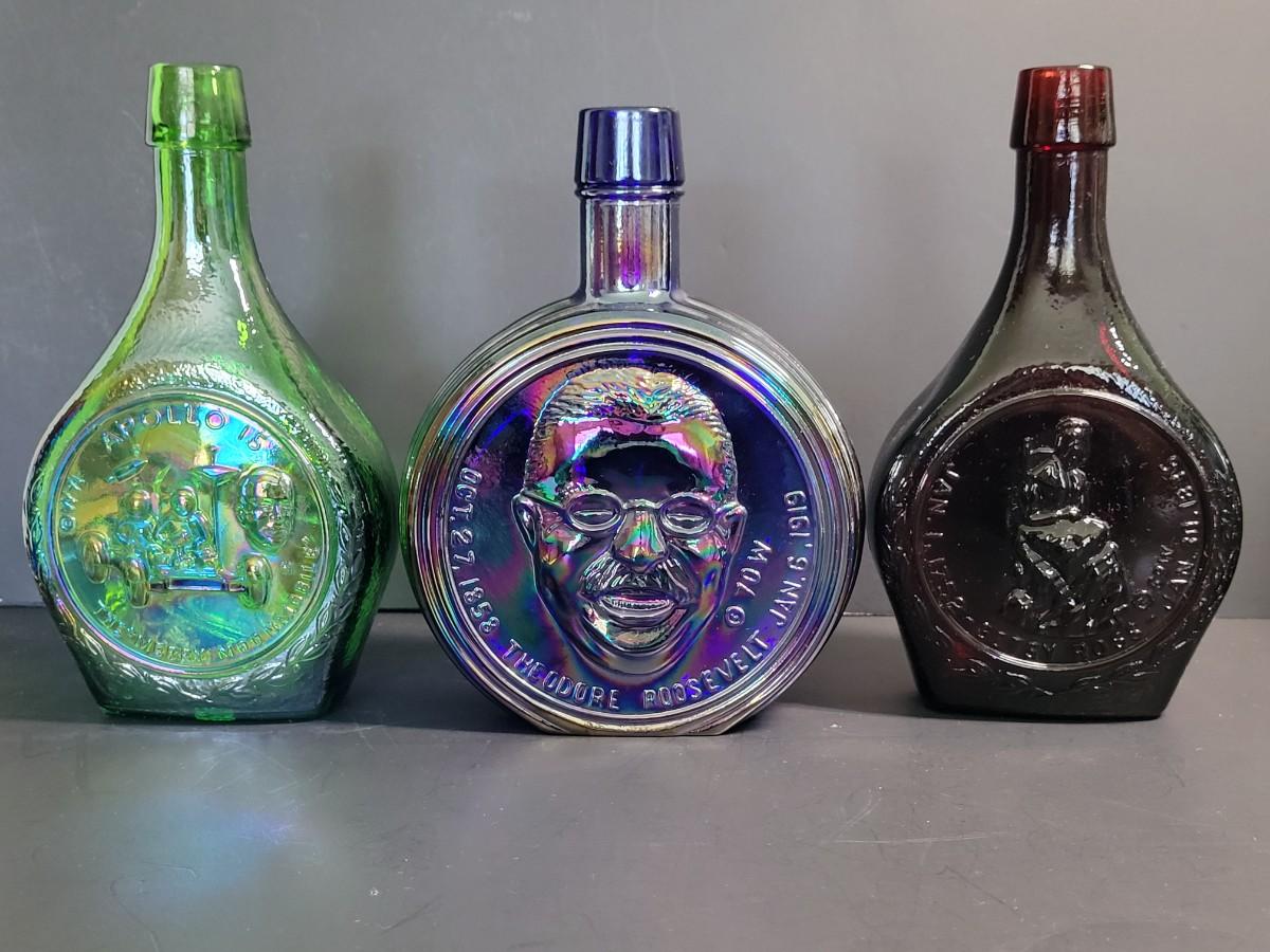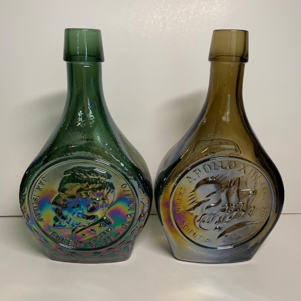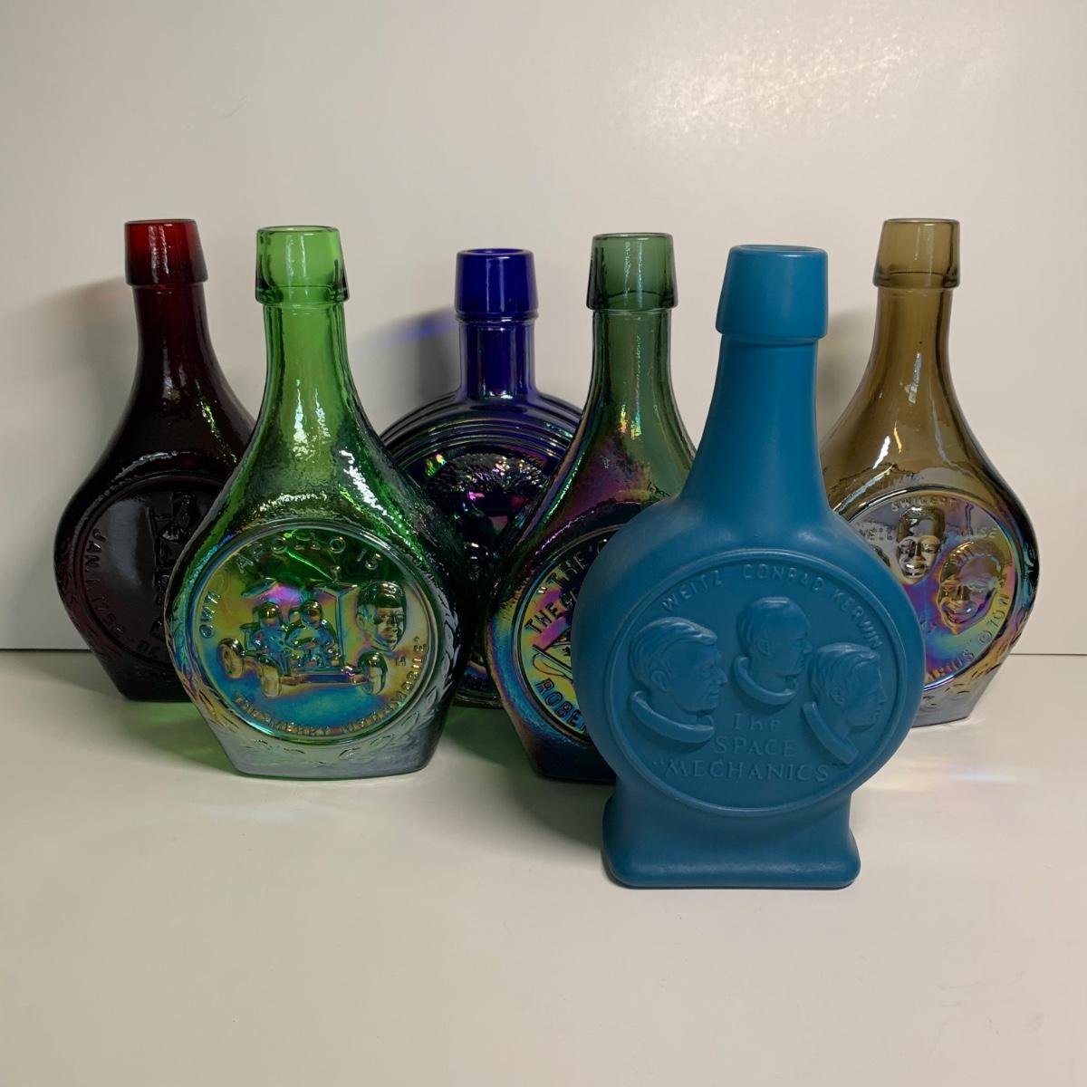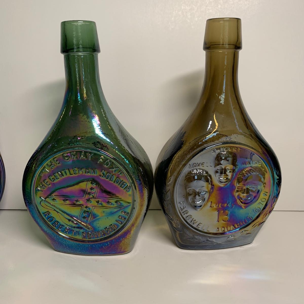 LOT:123: Collection of 6 Wheaton Colored Glass Bottles Featuring Icon Figures and Historical Events - Sky Lab